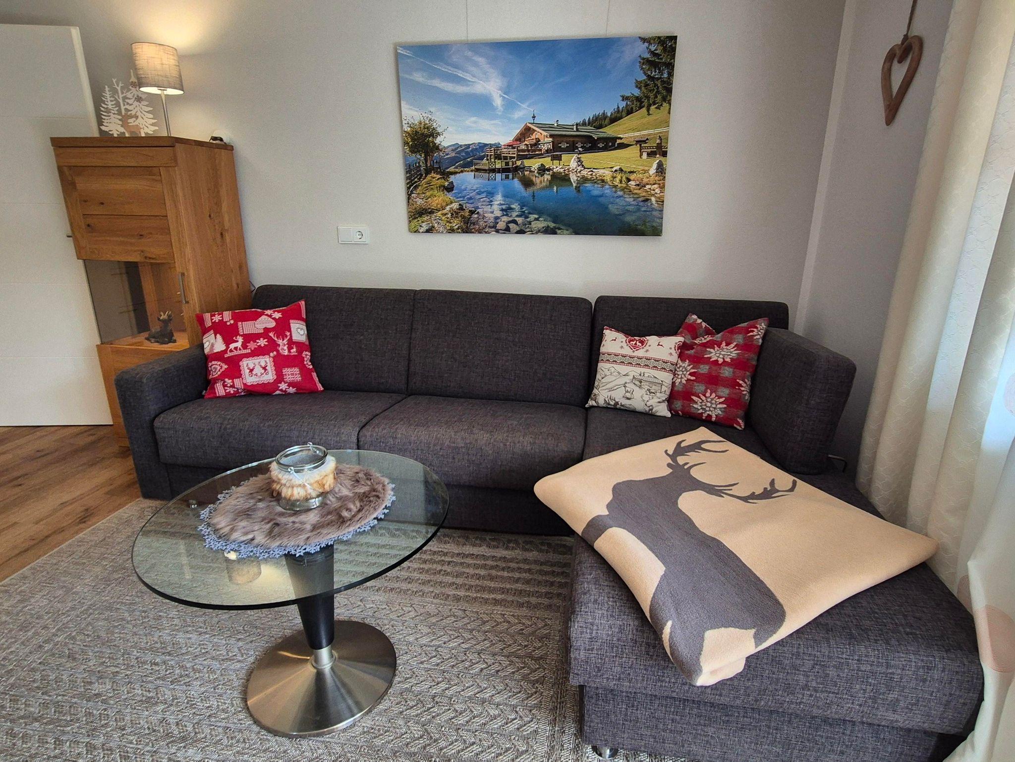 Ein Wohnzimmer mit gemütlicher Couch und Longchair für relaxte Stunden.