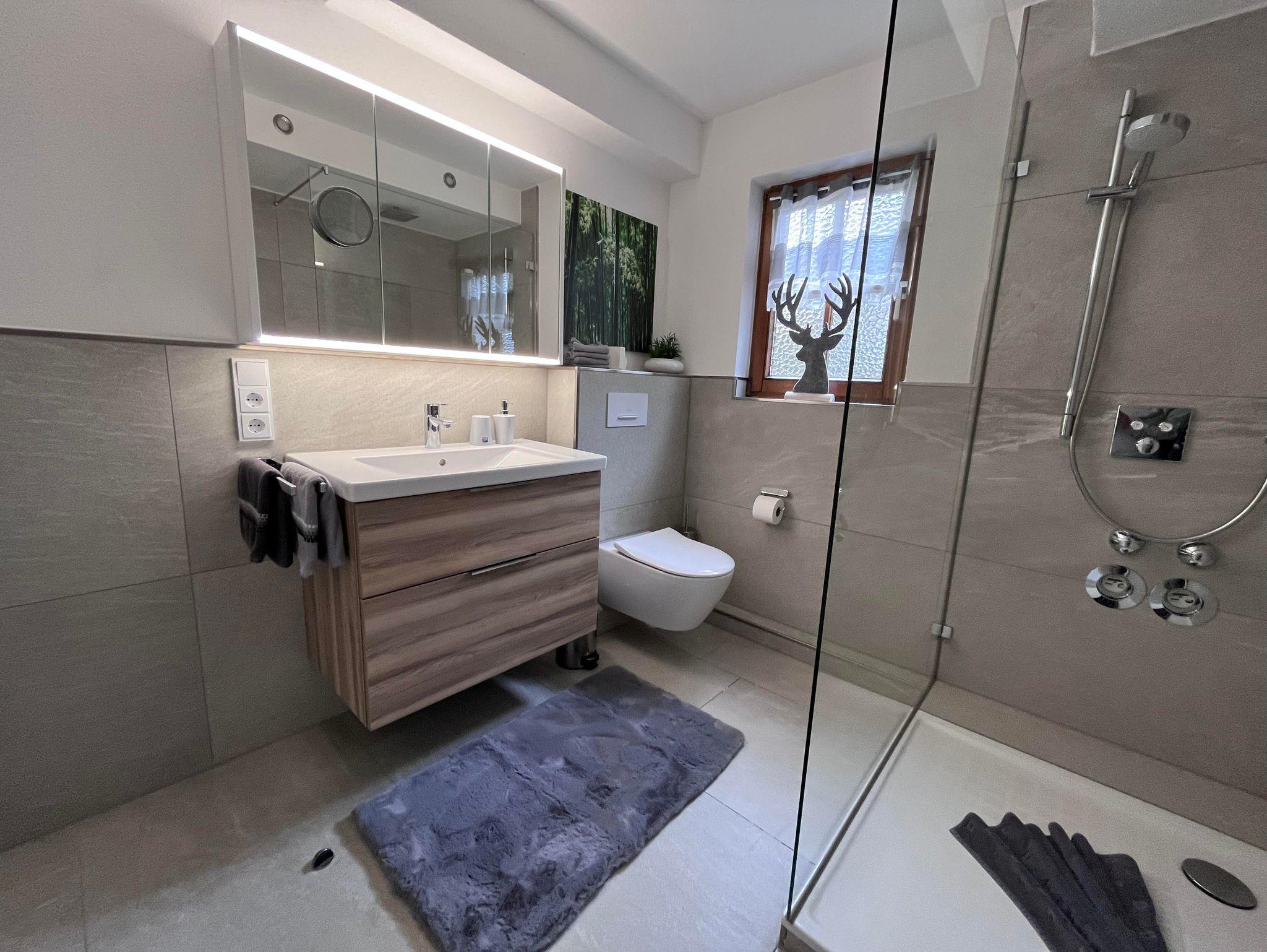 Das moderne Bad verfügt über eine XXL Raindance Dusche, kuschelige Duschtücher vom Handtuchheizkörper, Tageslichfenster, Hotelföhn.