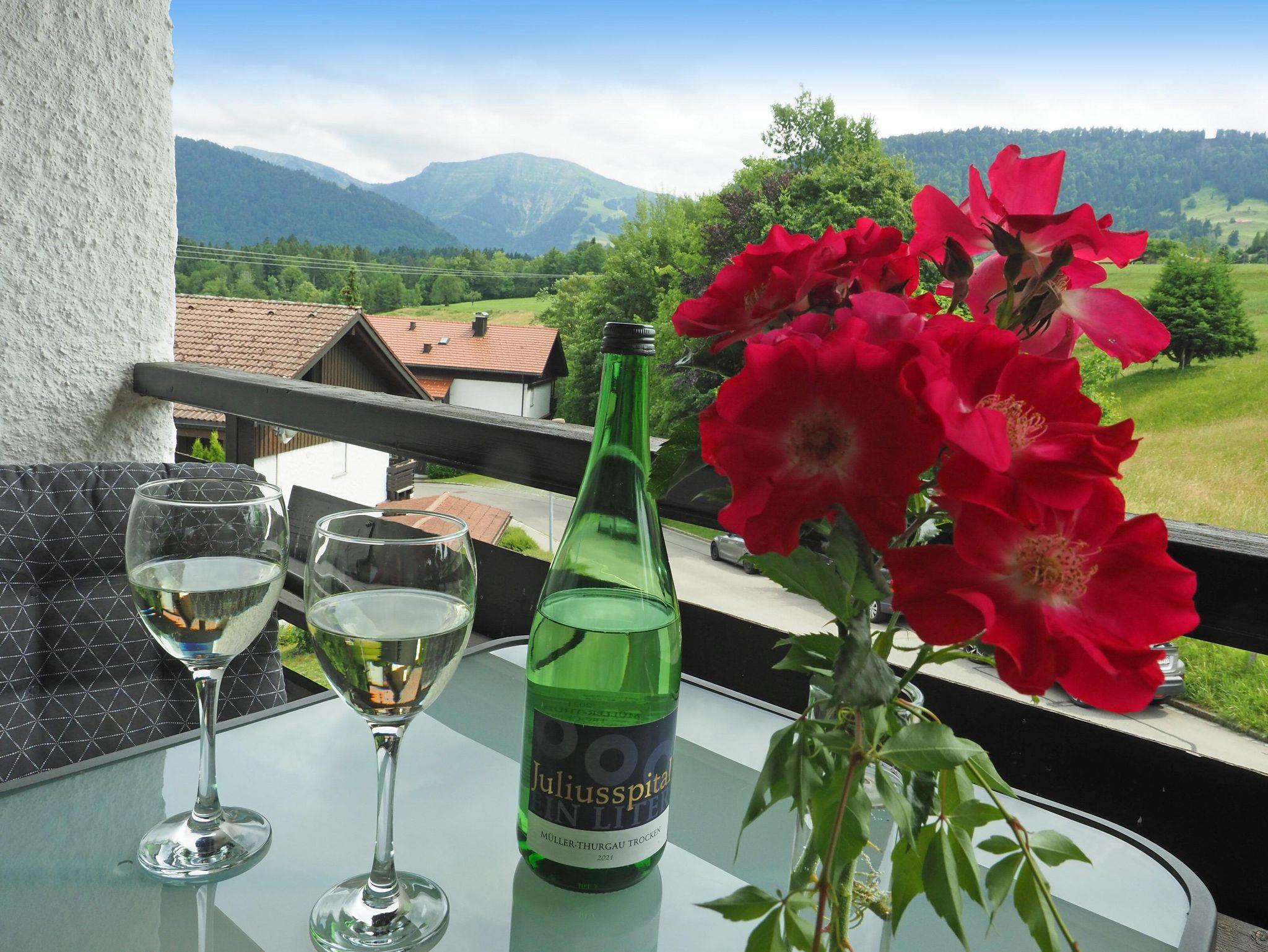 Freuen Sie sich auf einen Essplatz am Fenster mit Blick auf die Allgäuer Berge. Genießen Sie die Aussicht auf den Hochgrat vom Sofa oder von der Terrasse aus.