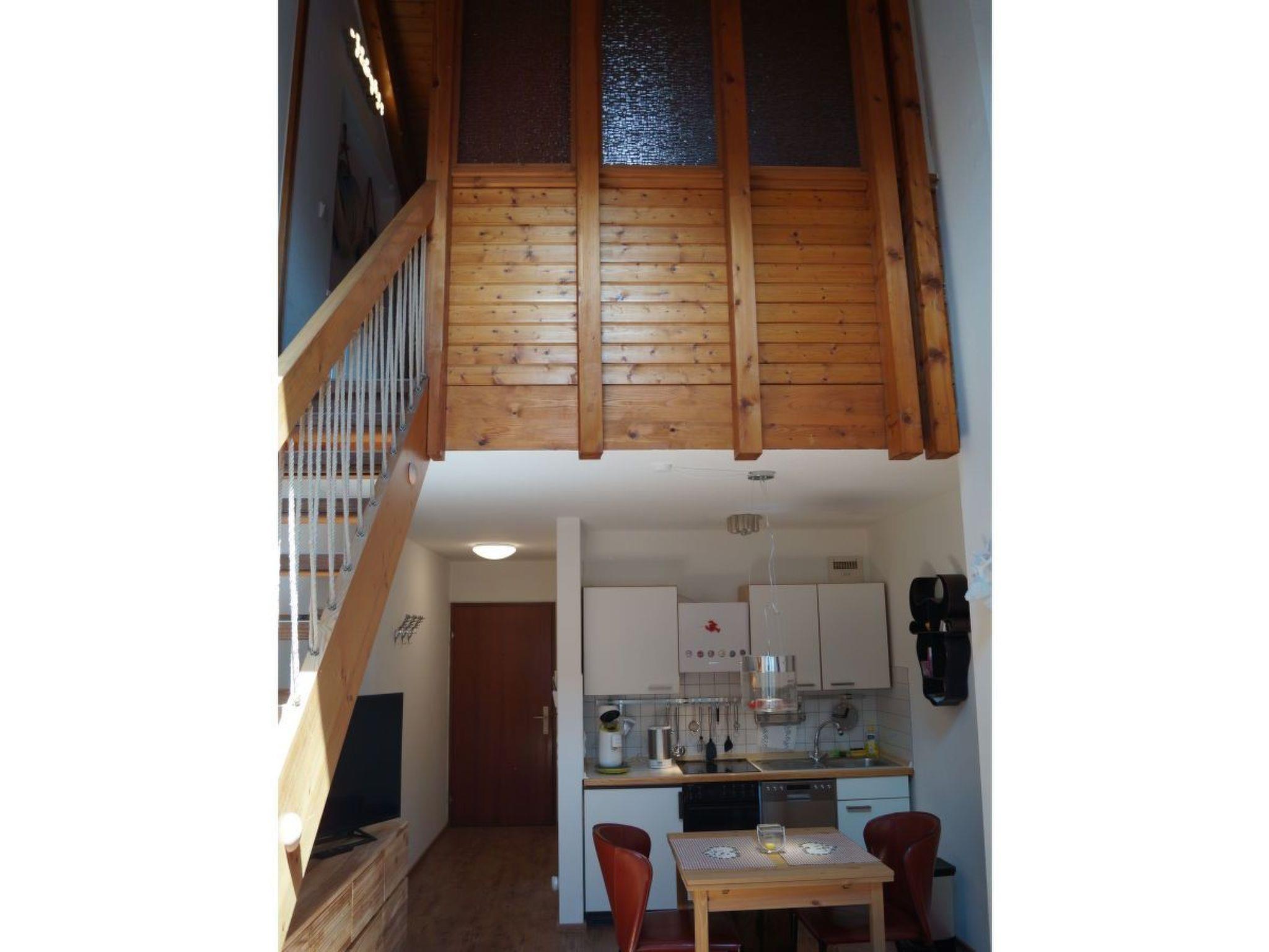 The maisonette flat, lovingly designed by an interior designer, combines a cosy cottage feeling with modern elements in a living space of approx. 55 m². The living space is divided into a spacious living and dining area, an open-plan, fully equipped kitchen, a bedroom and a bathroom. You can relax and listen to the radio, read or watch TV on the designer sofa in the living area. A DVD player and various films are also available. In addition to basic equipment, the kitchen also has an egg cooker, an electric fondue and an electric raclette machine. The bedroom in the gallery is furnished with a French bed (1.60 m x 2.00 m) and can be closed off with a sliding door. The bathroom has a rain shower, washbasin, hairdryer and toilet. The holiday flat is fully heated. The washing machine and tumble dryer are located in the shared cellar of the house and can be used for a fee. They work with 50 cent coins. Unlimited WLAN is available free of charge.
