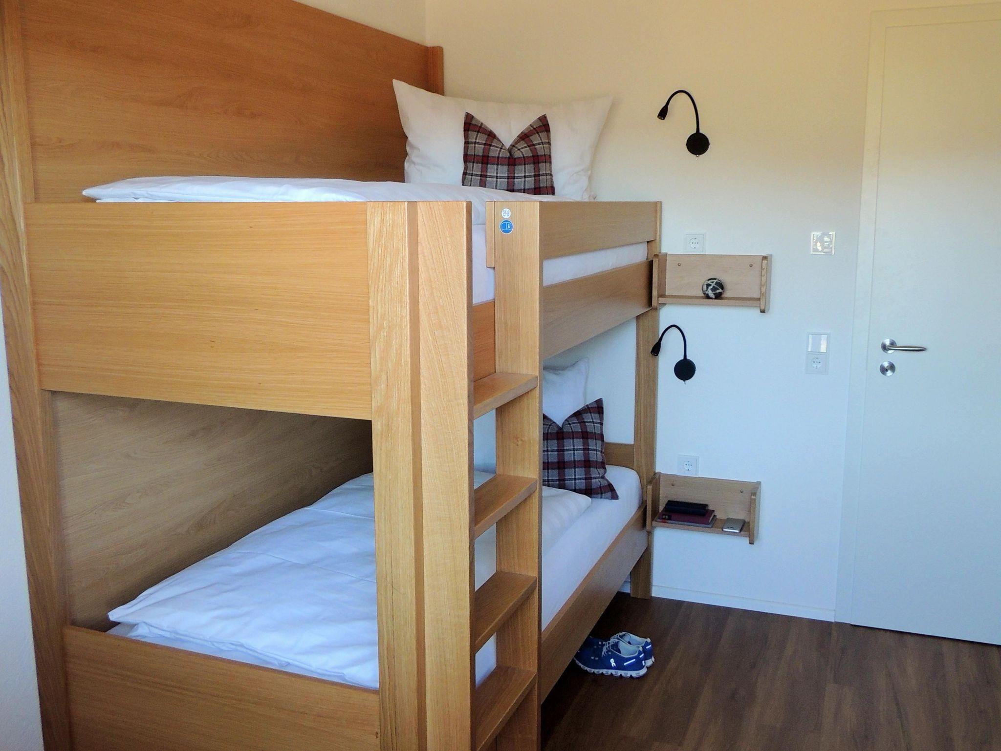 Das Elternschlafzimmer ist mit einem hochwertigen Boxspringbett mit geteilten Matratzen ausgestattet. Im Kinderzimmer befindet sich ein Etagenbett.