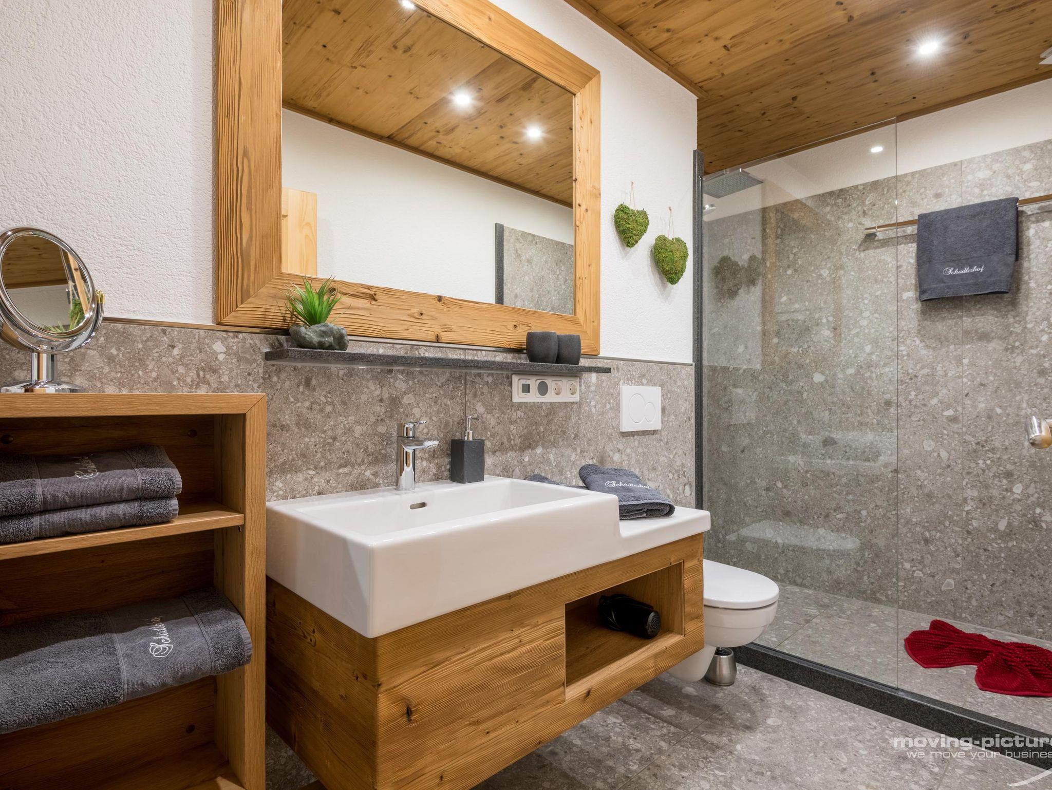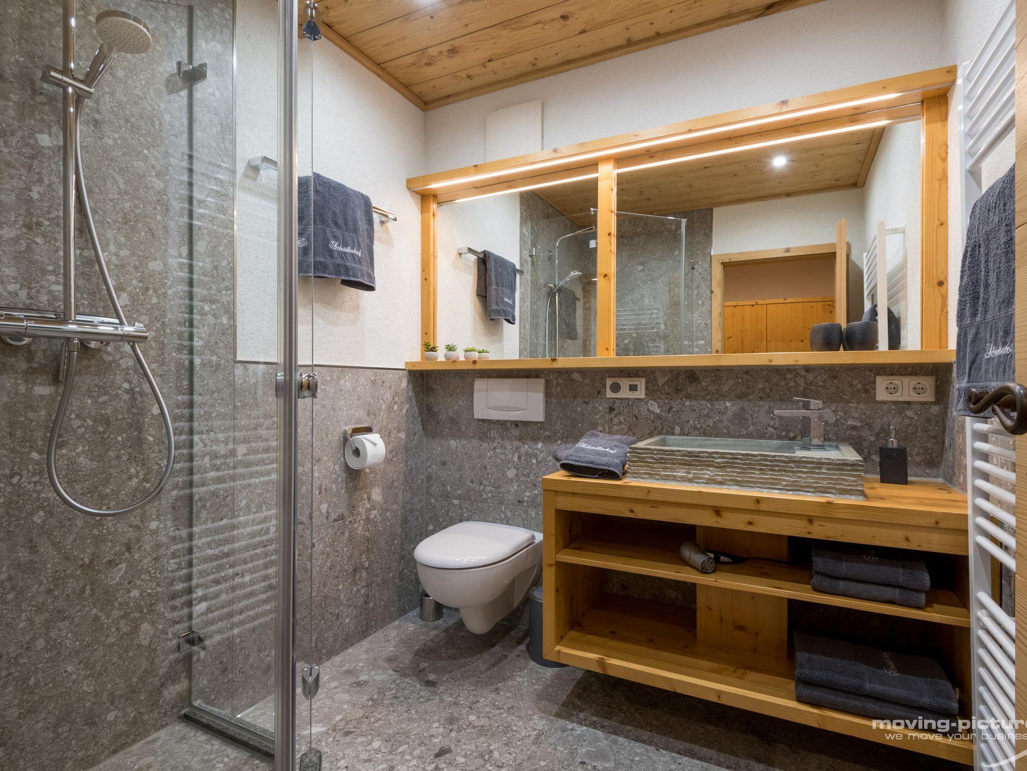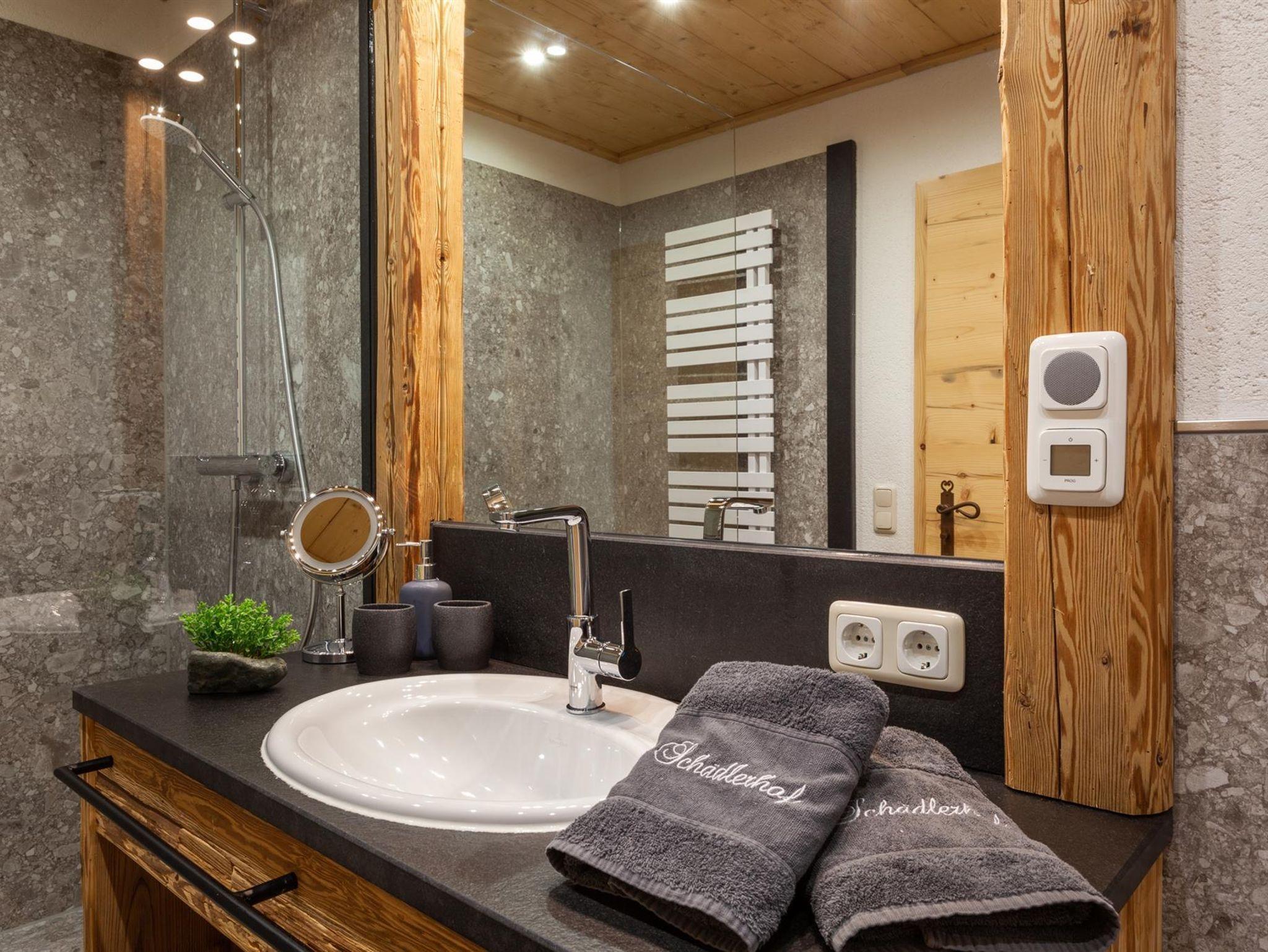 • Badezimmer mit Dusche und WC, Föhn, Schminkspiegel und Handtuchwärmer