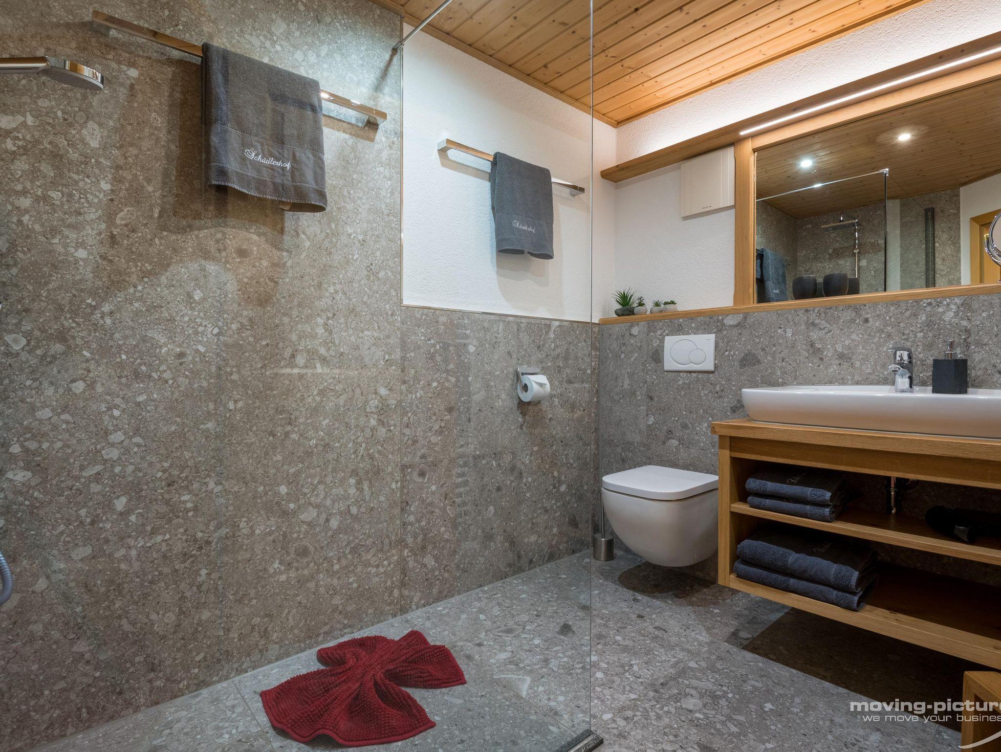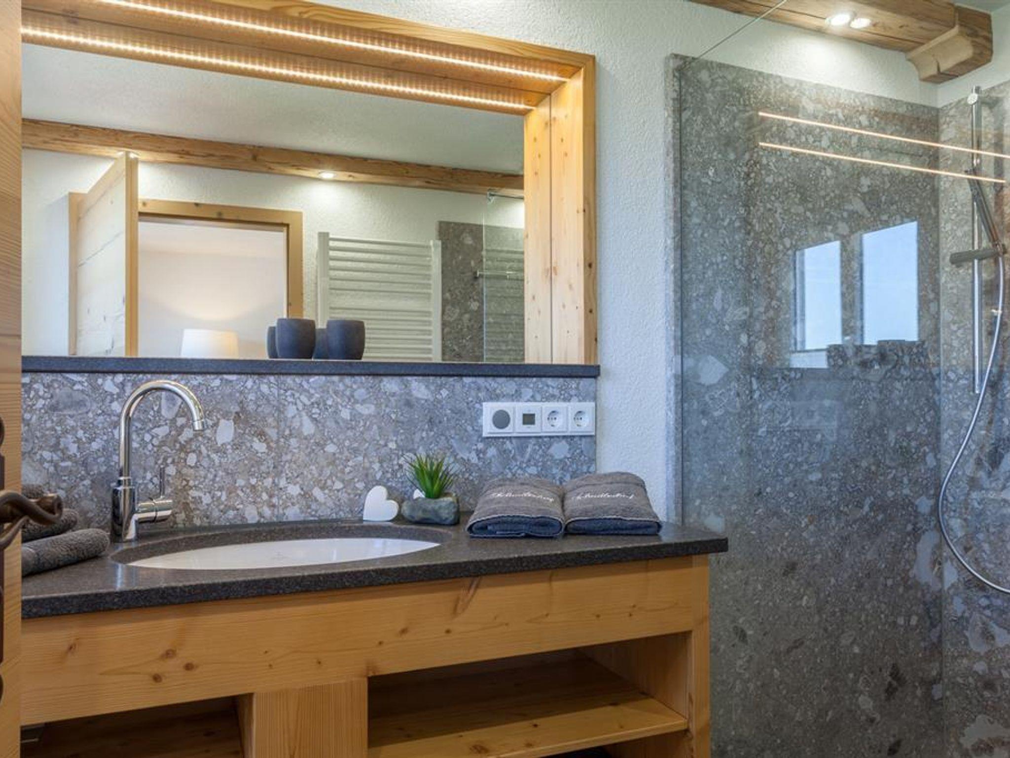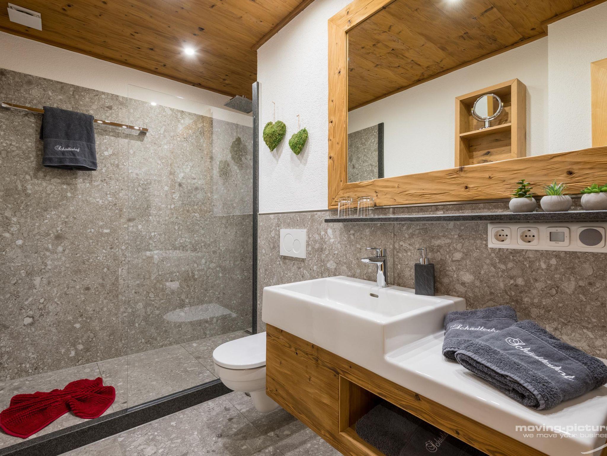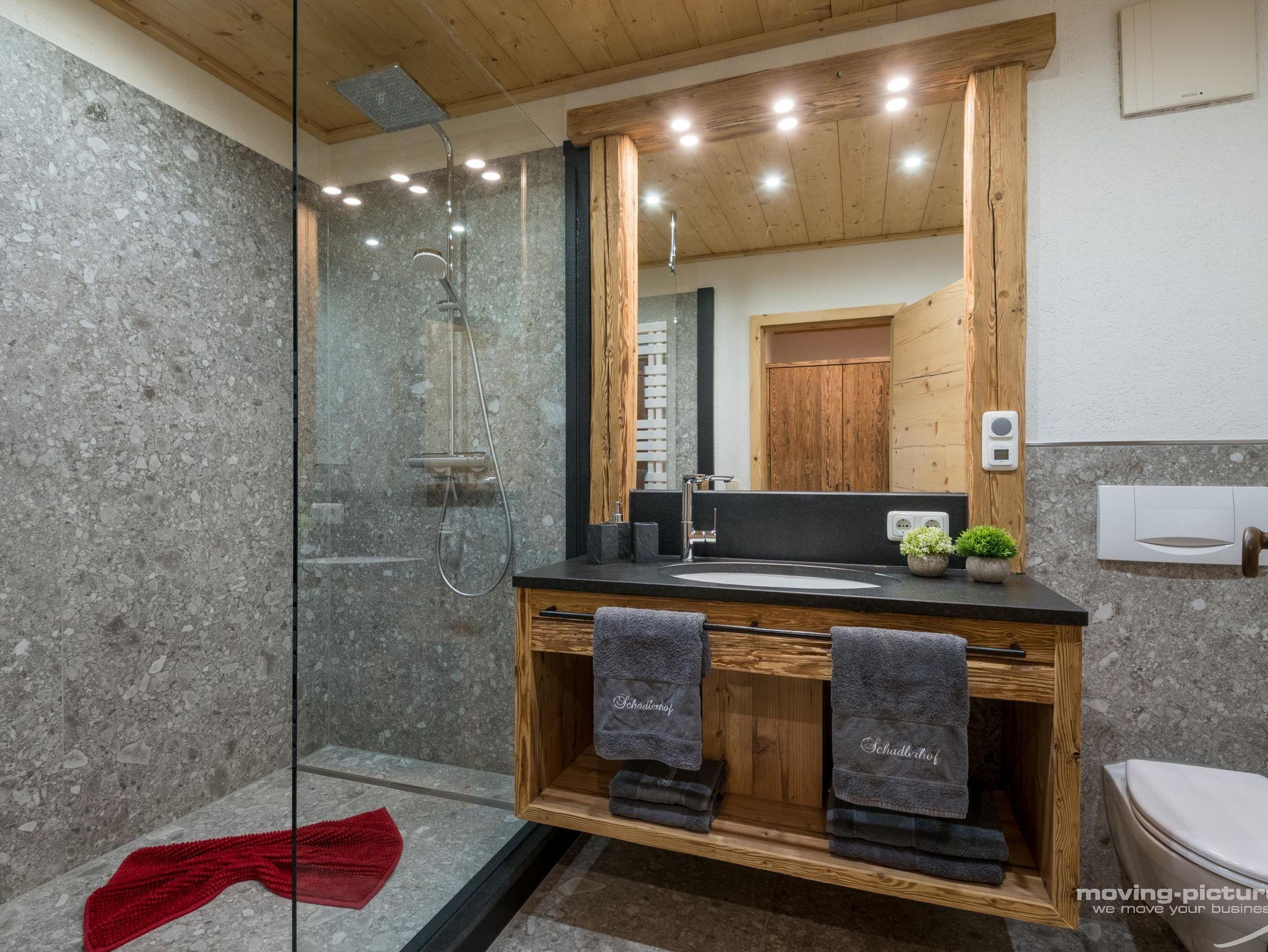 • Badezimmer mit Dusche und WC, Föhn, Schminkspiegel und Handtuchwärmer