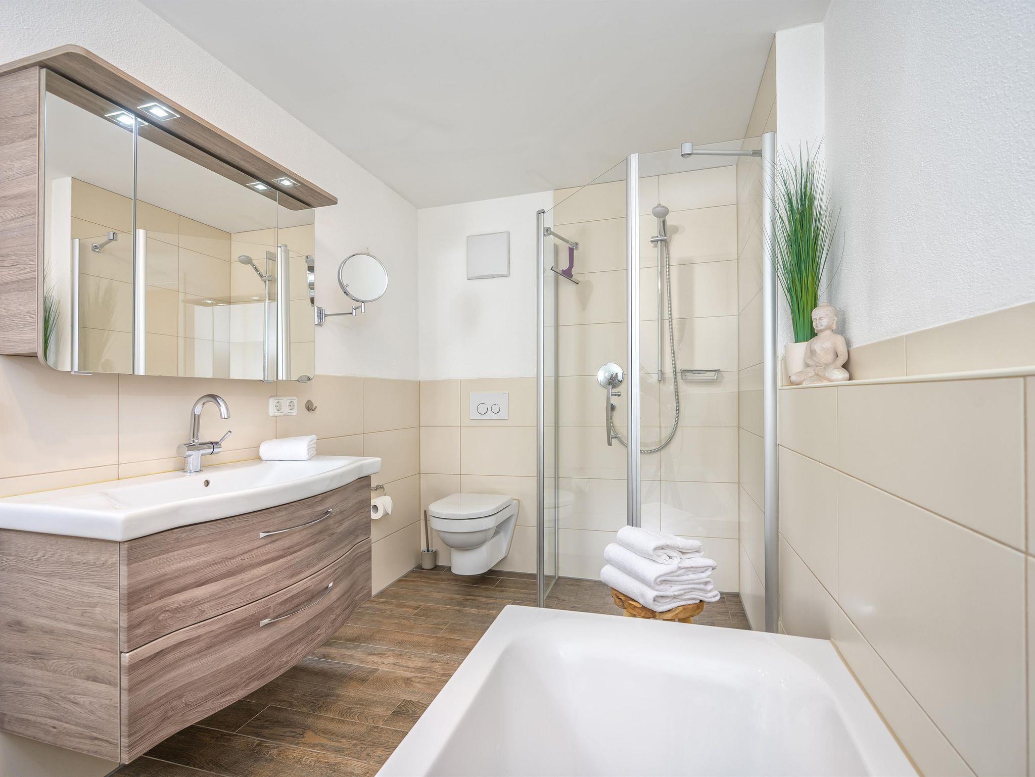 • mit Bad, Dusche, Badewanne, großer Spiegelschrank, Waschbecken mit Untertisch, Handtuchheizkörper