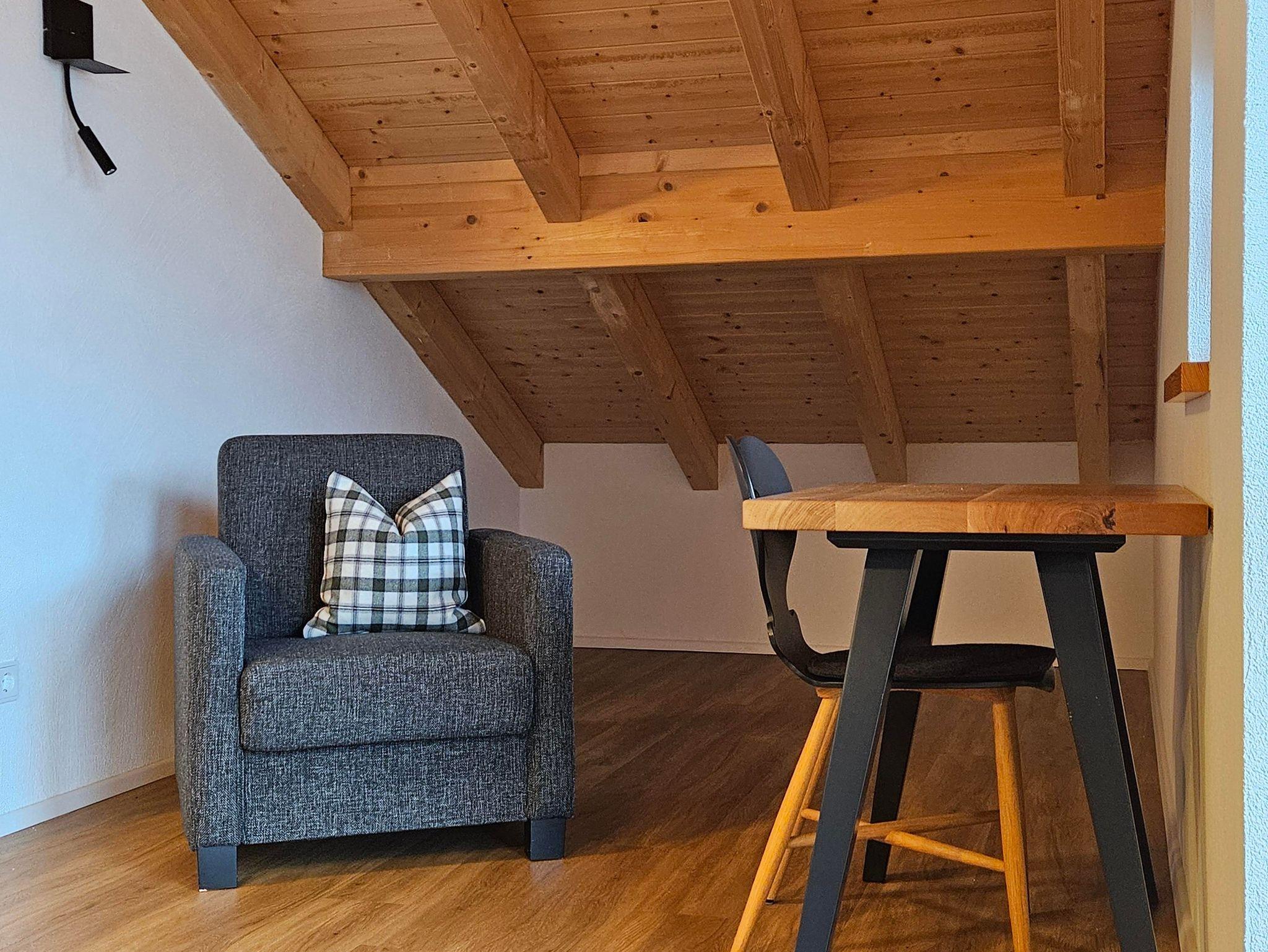 Der Wohn-/Essbereich mit sichtbarem Dachstuhl, Küche, Eßtisch und gemütlicher Couch lädt zu einer netten „Hostube“ (Unterhaltung) und zum Relaxen ein. Wird das Sofa zum Schlafen genutzt, hat es eine Liegefläche von 130 x 200 cm.