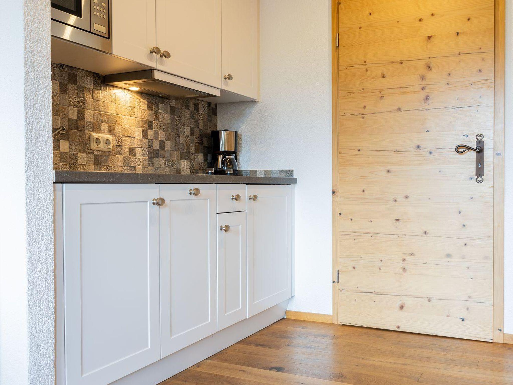 • komplett ausgestattete Küche mit Kühlschrank und Gefrierfach, Mikrowelle, Kaffeemaschine, Wasserkocher, Eierkocher und Toaster