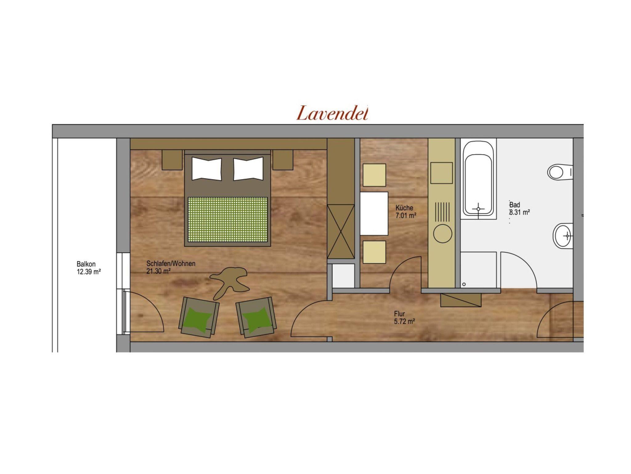 Die Dachgeschosswohnung Lavendel ist wie geschaffen zum Wohlfühlen. Hier finden Sie Gemütlichkeit und Heimeligkeit auf 42 m². Klein aber fein.Ruhe und Geborgenheit. Mit kombiniertem Wohn-/ Schlafbereich und separater Küche.