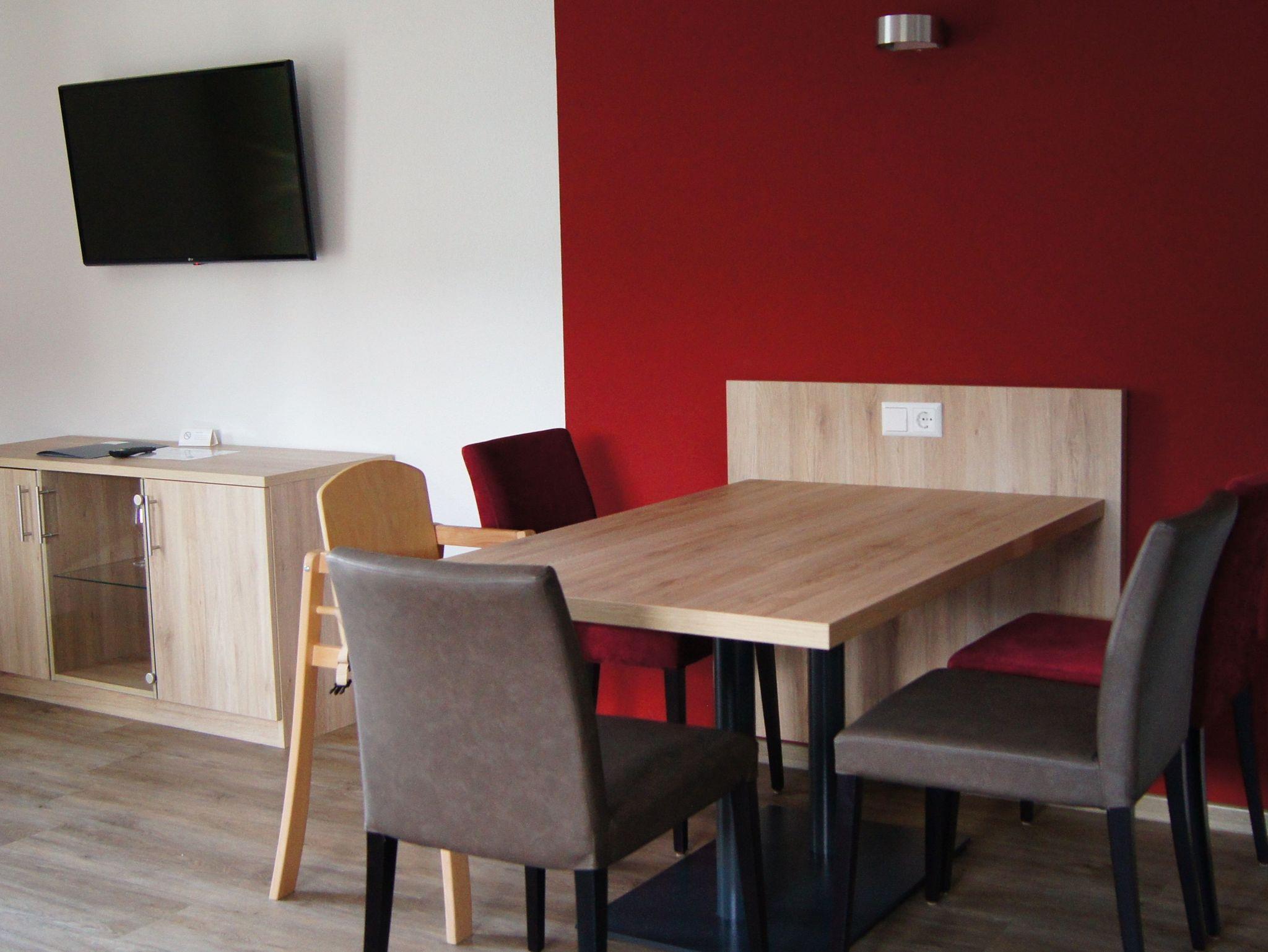 Wohnzimmer: Essplatz, ausziehbare Couch, Fernseher.