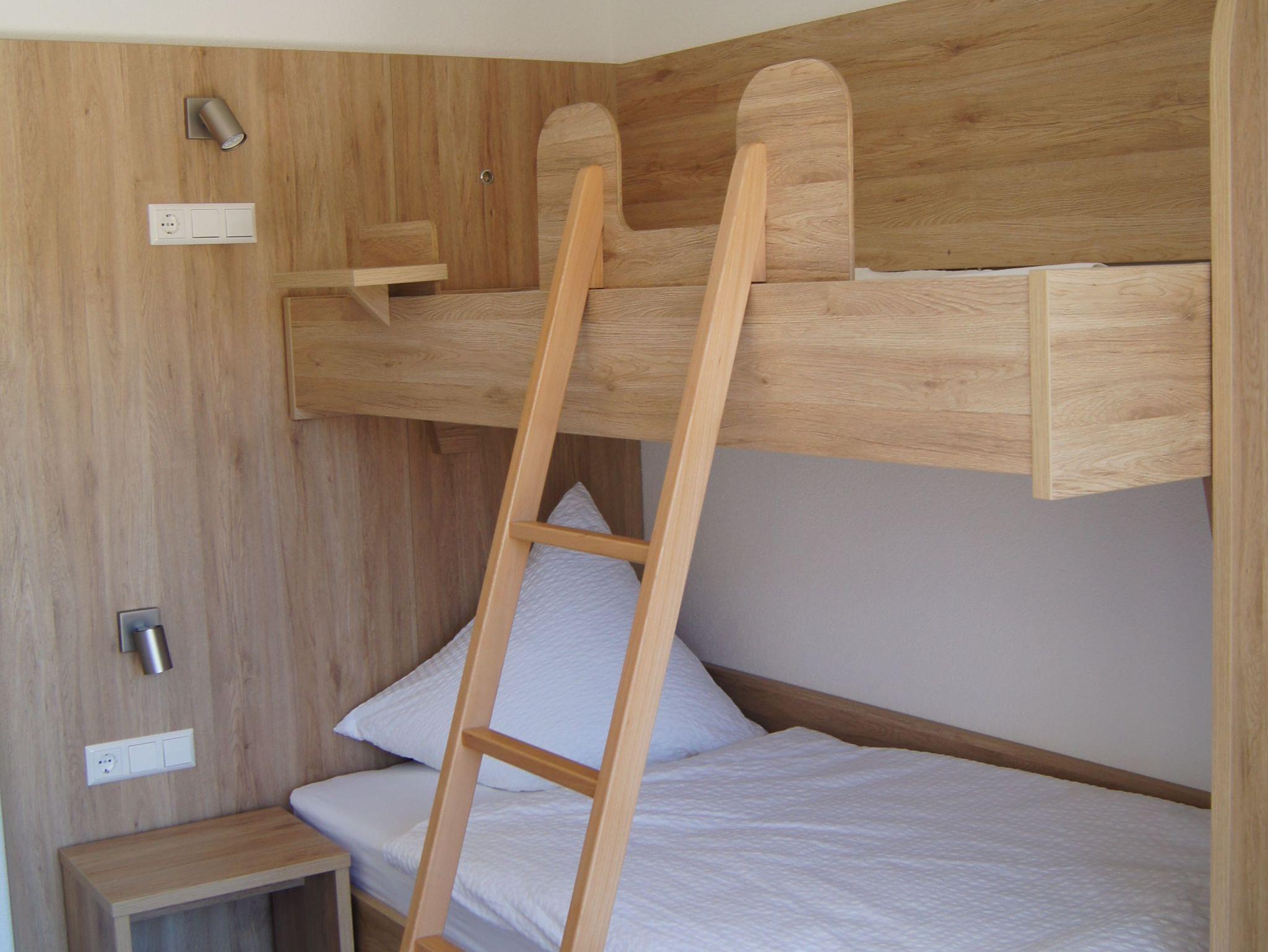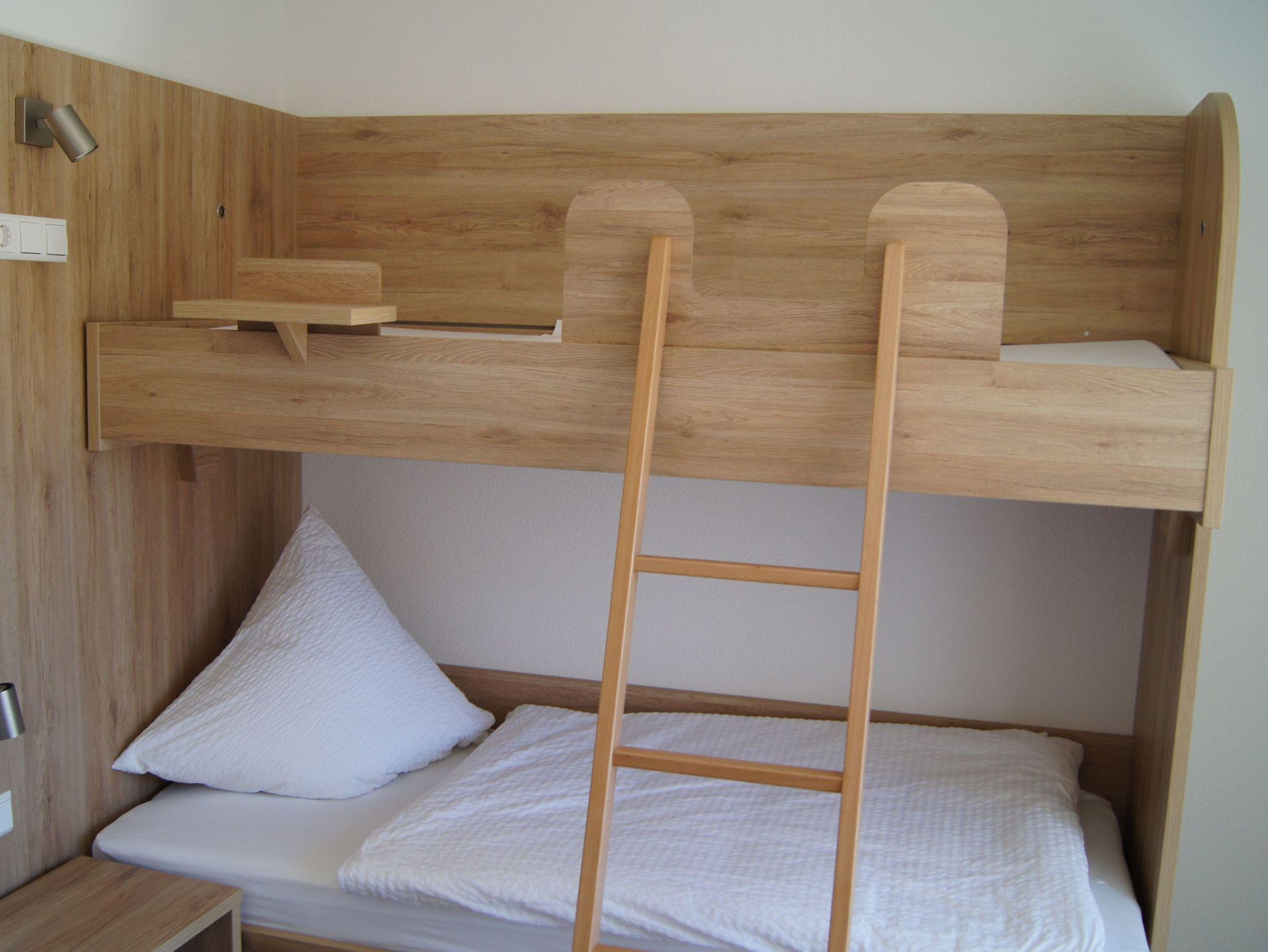 Kinderzimmer: ein Stockbett, Kleiderschrank.
