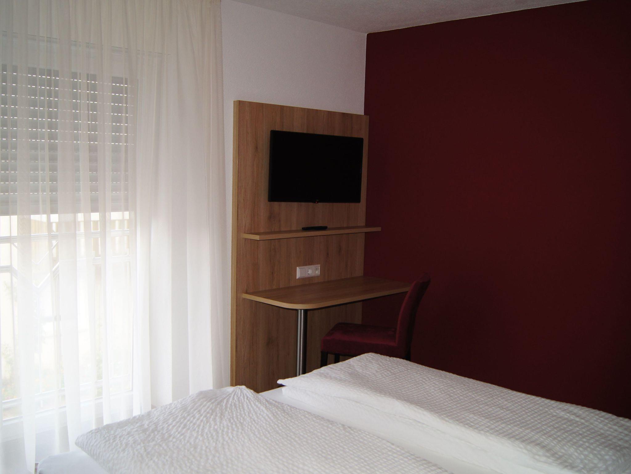 Schlafzimmer: Doppelbett, Schreibtisch, Kofferablage, Kleiderschrank mit Tresor und einem Spiegel.