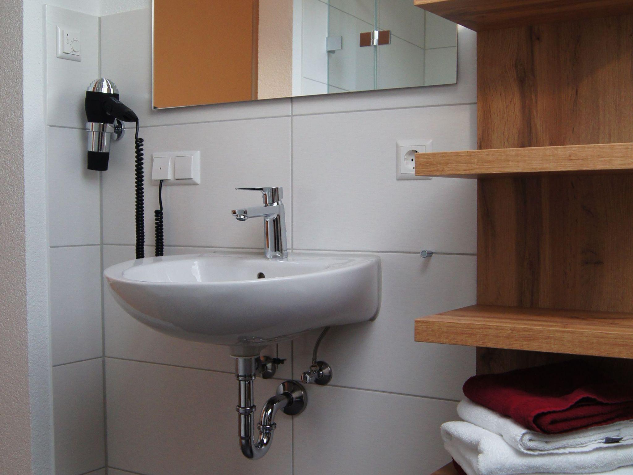 Das Bad ist ausgestattet mit Handtüchern und einem Fön,sowie mit einem Dachfenster und Rollladen.