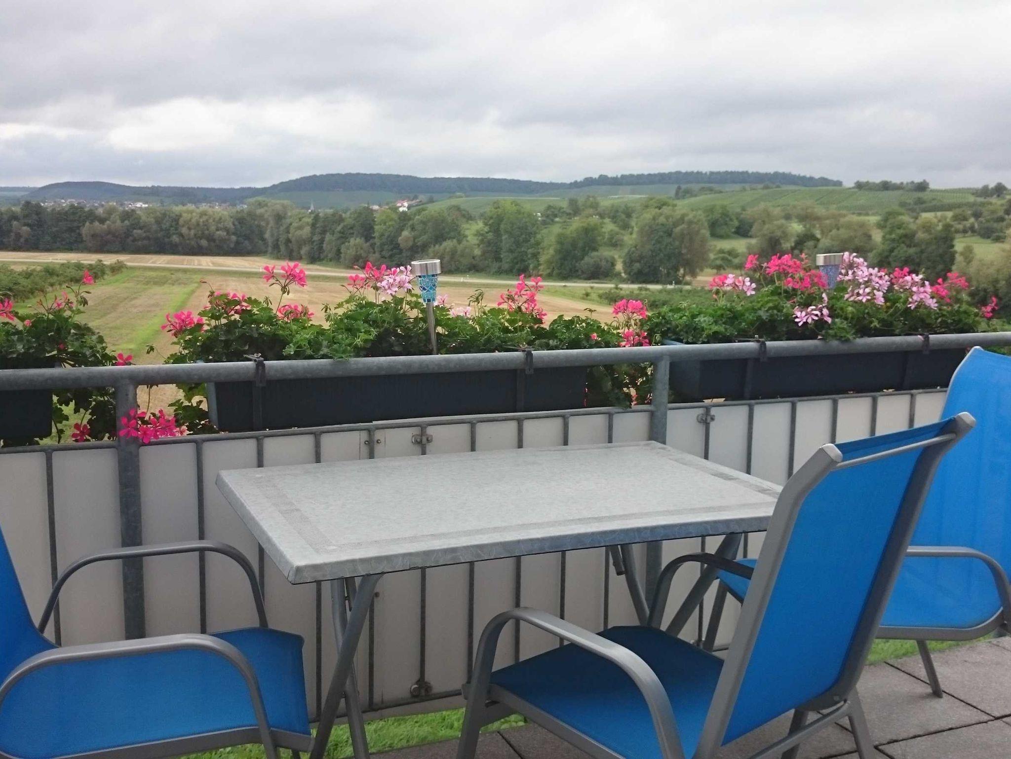 Die Ferienwohnung mit einer Größe von 57 qm bietet Platz für zwei bis vier Personen. Neben einer voll ausgestatteten Küche erwarten Sie hier ein Schlafzimmer mit Doppelbett und Platz für ein Kinderbett, eine gemütliche Wohnecke mit Schlaffunktion, ein Essbereich und ein gepflegtes modernes Badezimmer mit Dusche und Badewanne. Vom Balkon aus genießen Sie einen Panoramablick über Wiesen, Felder und Weinberge.