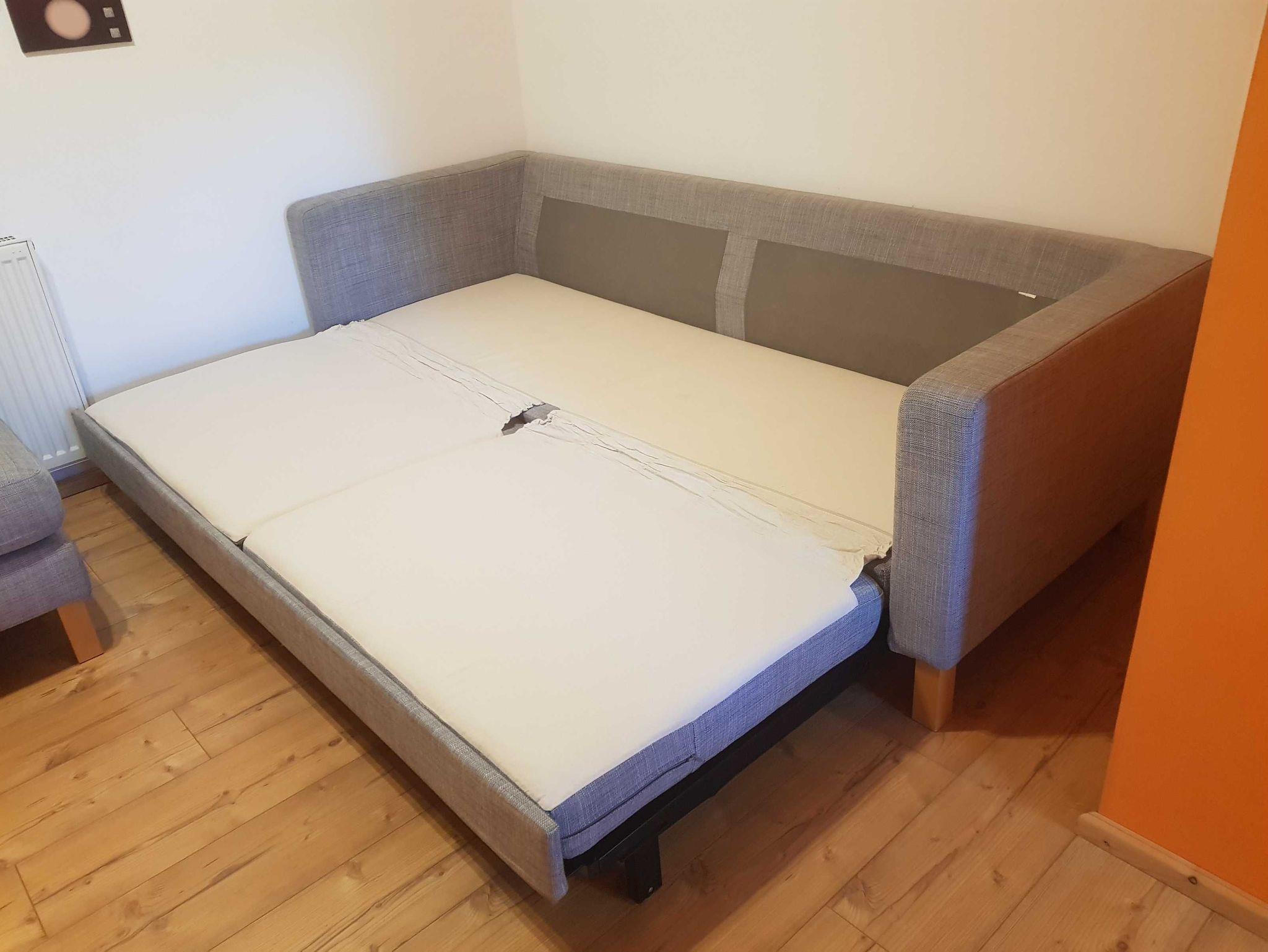 Der offene Wohnbereich ist mit einer gemütlichen Eckcouch ausgestattet, welche auch als Schlafsofa genutzt werden kann.