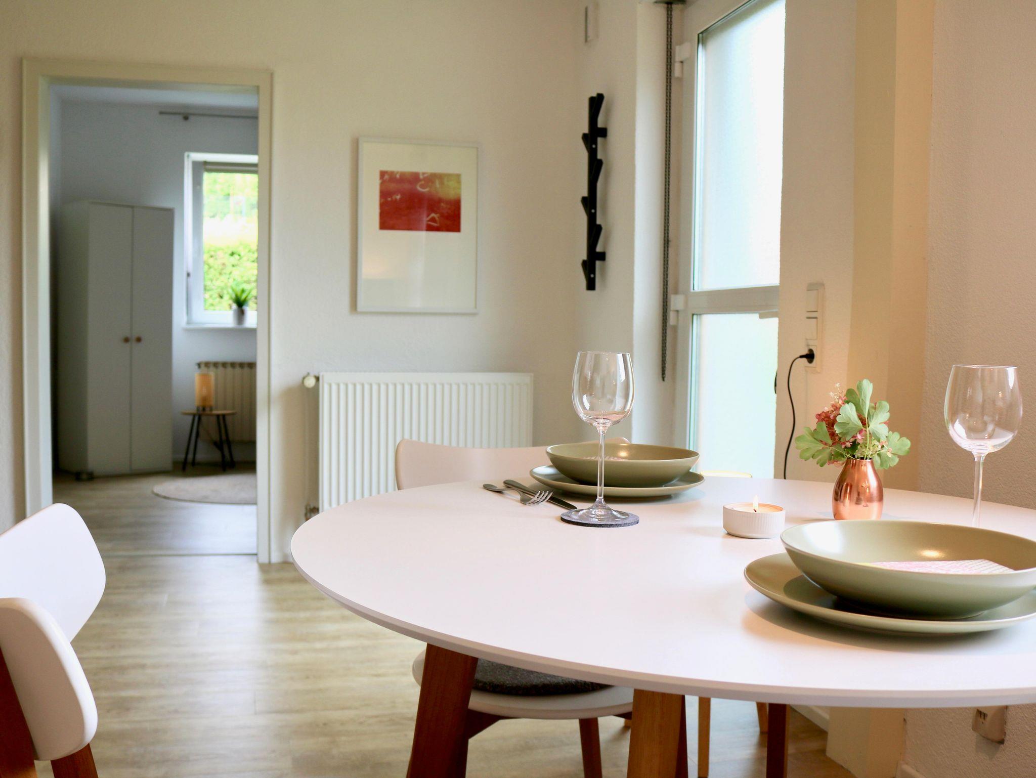 Unsere helle, gemütliche Wohnung hat einen separaten Eingang, einen überdachten Sonnenbalkon und eine Terrasse im Garten und bietet auf ca. 90 m² ausreichend Platz zum Schlafen, Kochen und Beisammensein, zum Durchatmen und auf neue Gedanken kommen. Einfach mal Zeit haben für sich, zu Zweit oder als Familie.