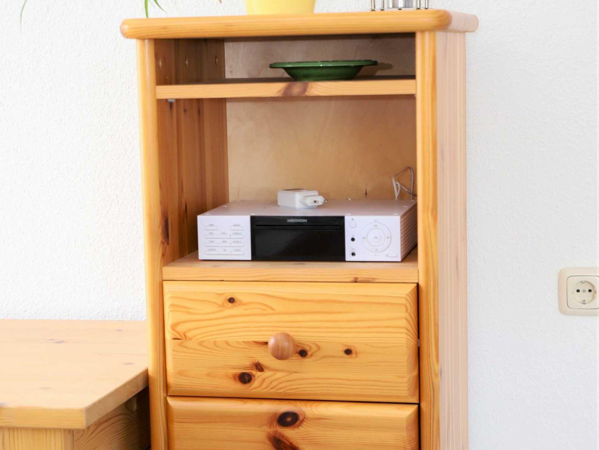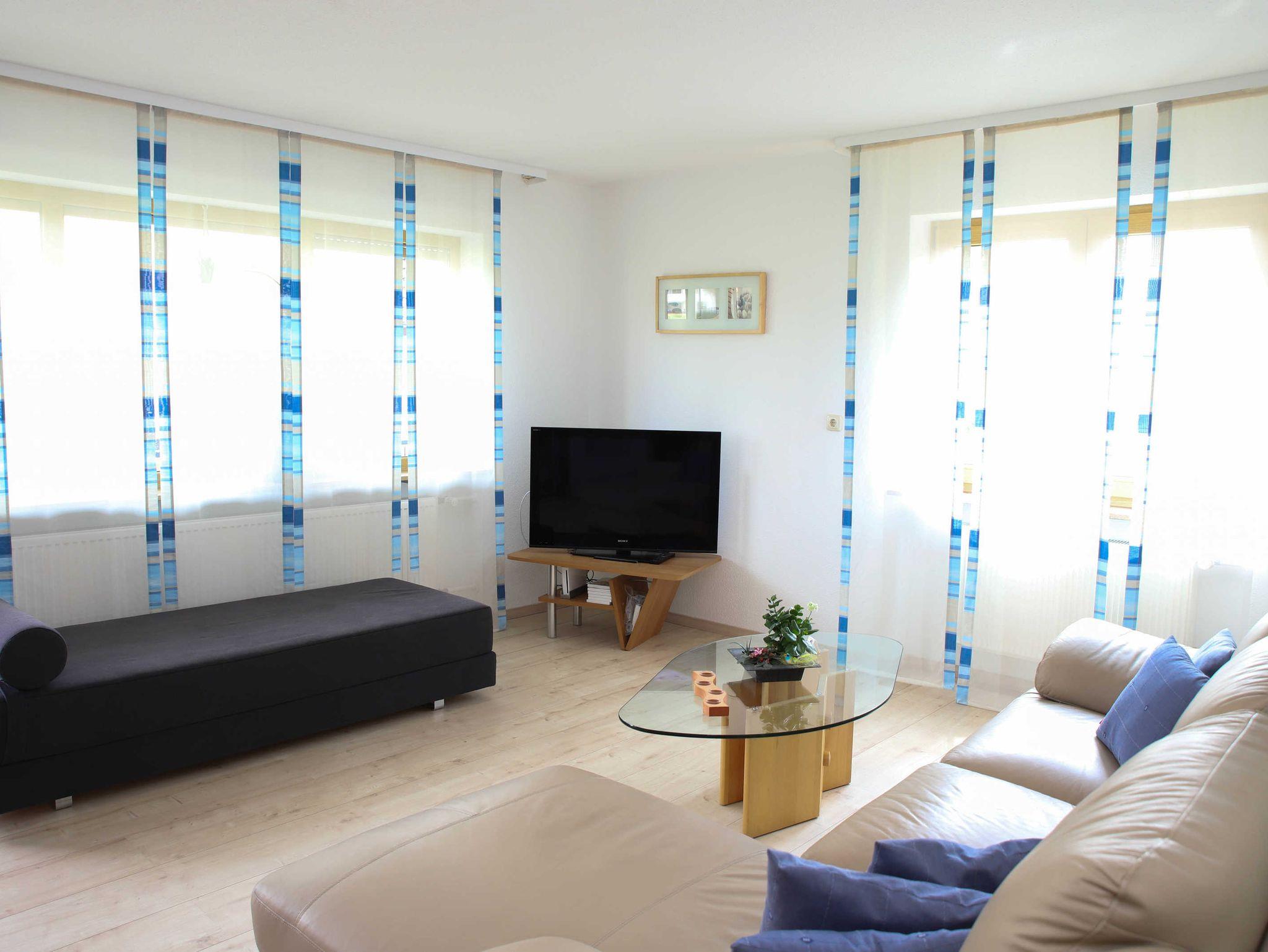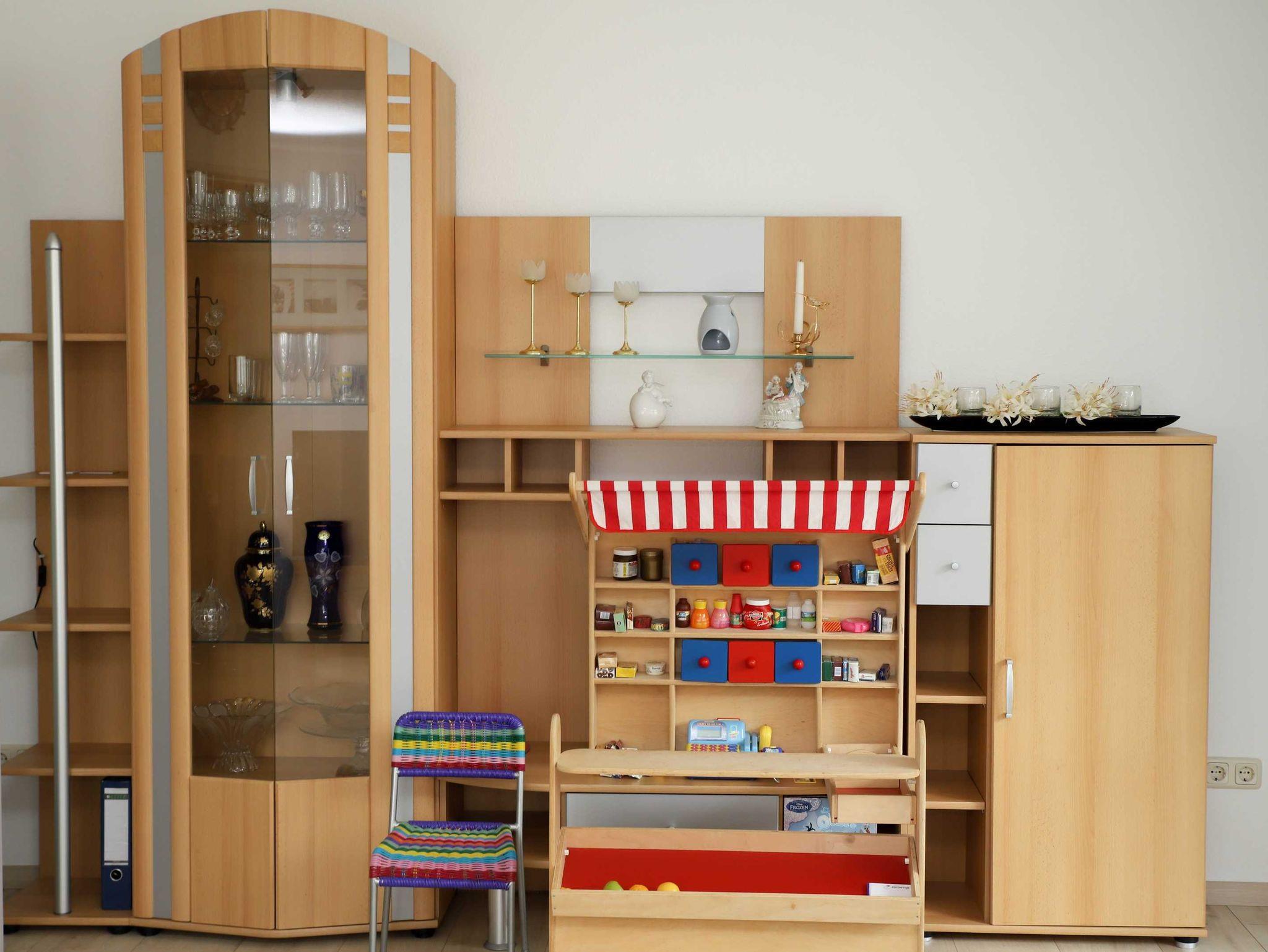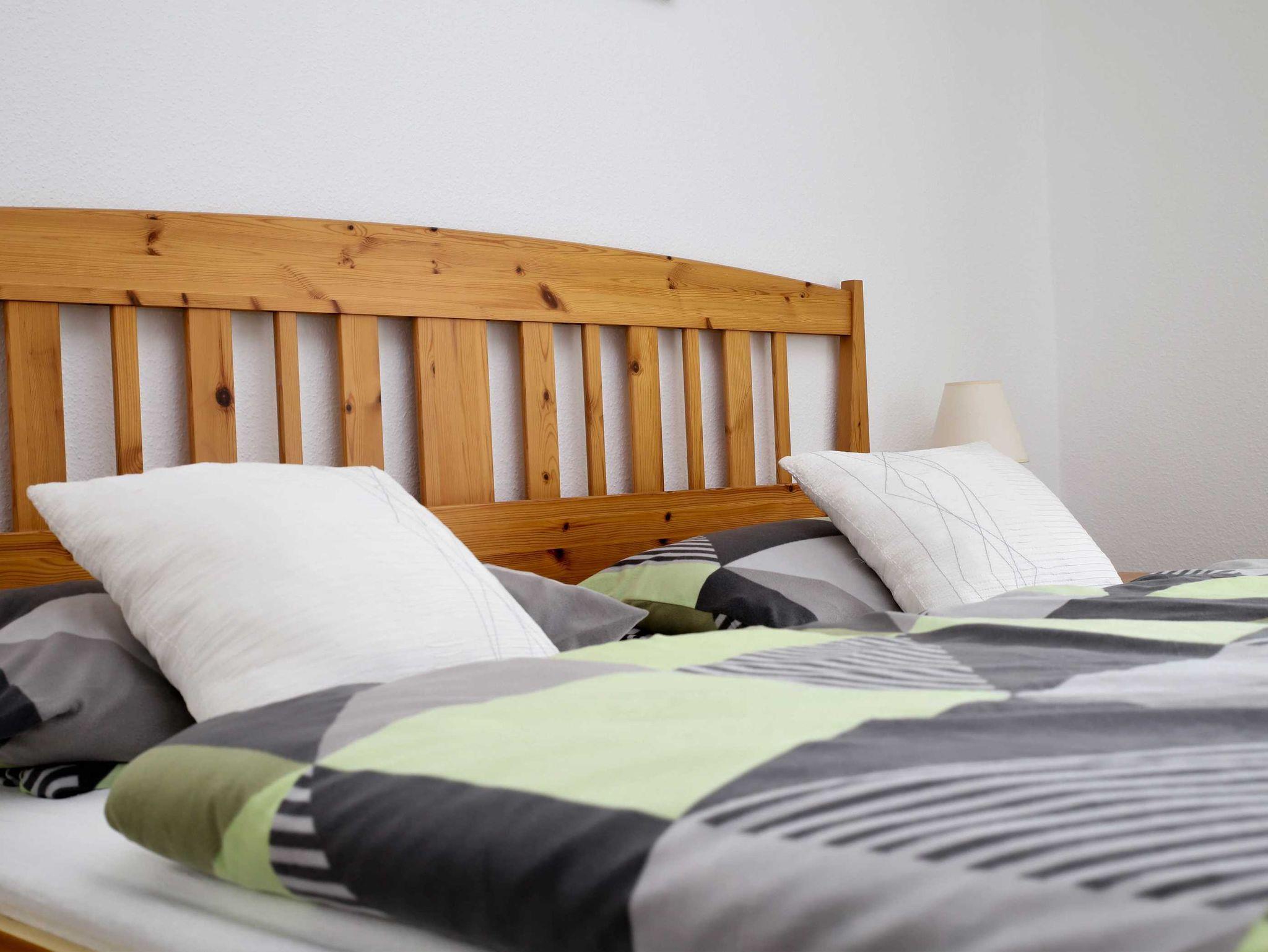 Unsere geräumige Ferienwohnung bietet auf ca. 100m² Platz für 2-5 Personen. Das Wohnzimmer ist mit einem 2-teiligen Sofa, TV/Radio und einer Spielekonsole Wii ausgestattet. Hier gelangen Sie auch direkt auf den langen Balkon. Die Wohnung besitzt ebenso eine abgeschlossene und vollausgestattete Küche mit Elektroofen sowie einem Holzofen und einer gemütlichen Essecke. Das Schlafzimmer 1 verfügt über einen großen Kleiderschrank mit Doppelbett, das Schlafzimmer 2 über 2 Einzelbetten, die als Etagenbett oder nebeneinander aufgestellt werden können. Das Badezimmer ist mit Wanne und WC ausgestattet, Fön ist vorhanden. Ein weiteres Zustellbett ist möglich.