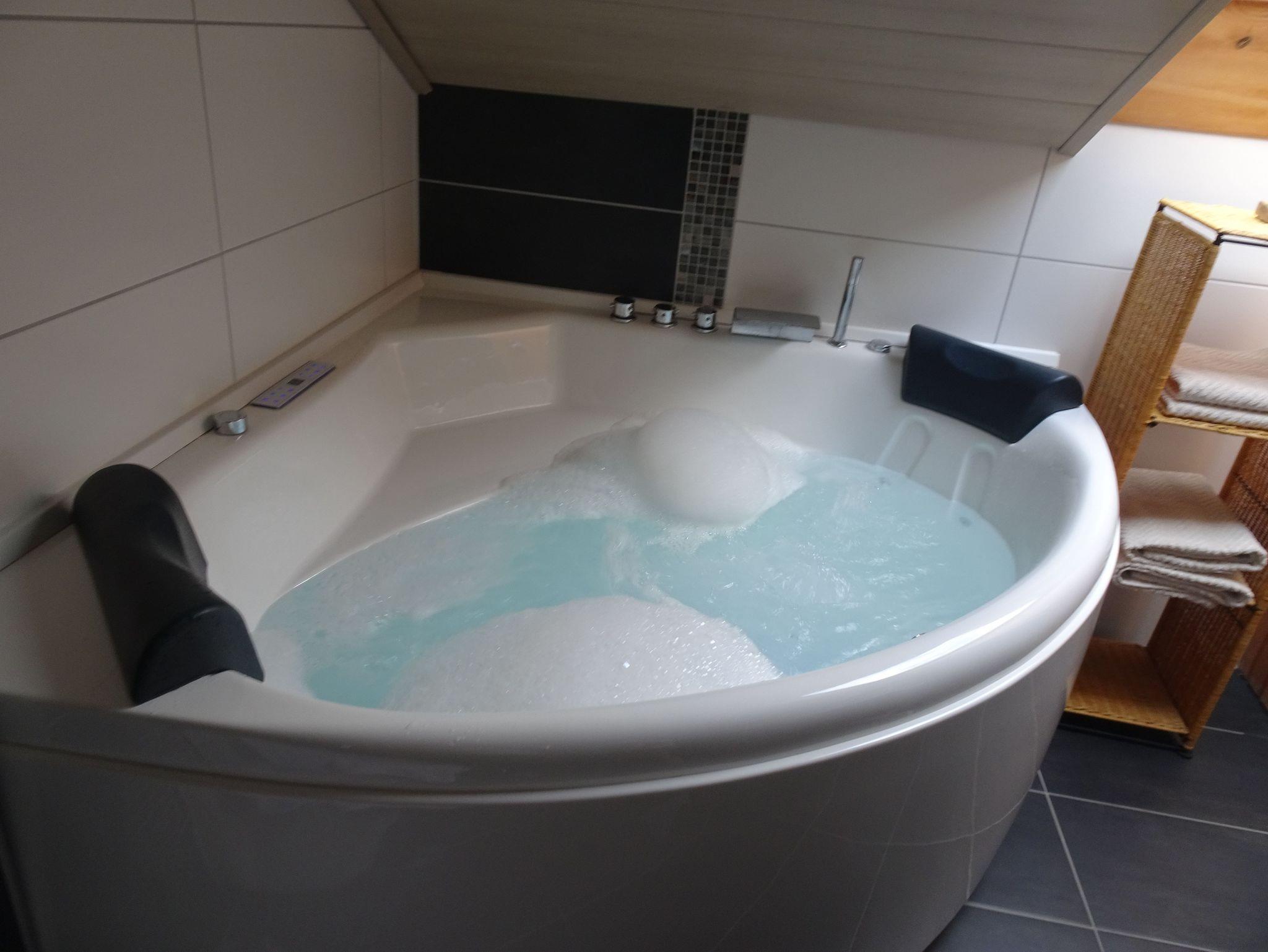 Das moderne Bad ist eine Wellnessoase mit Badewannenwhirlpool und Regendusche. Handtücher und Fön sind vorhanden.