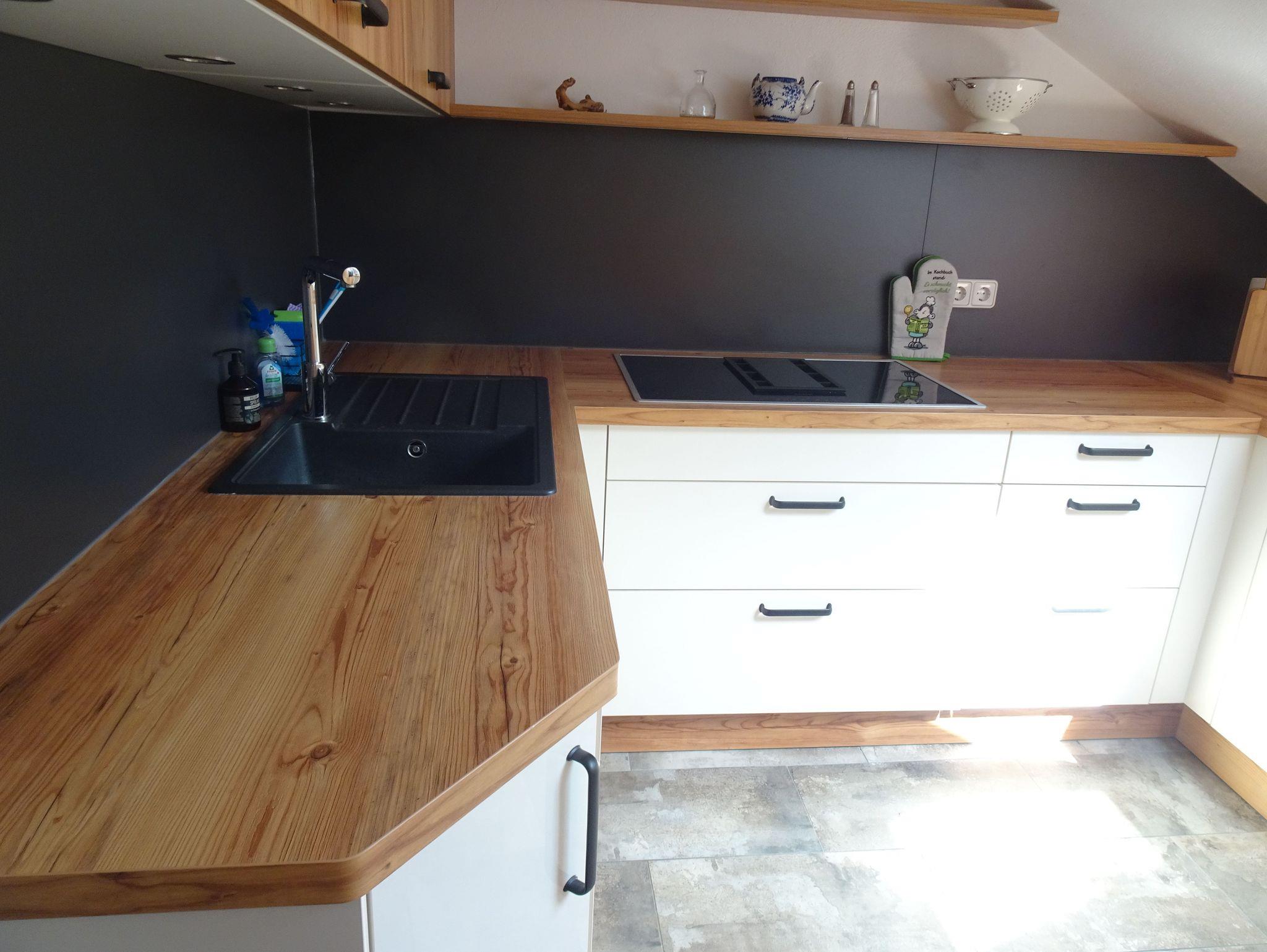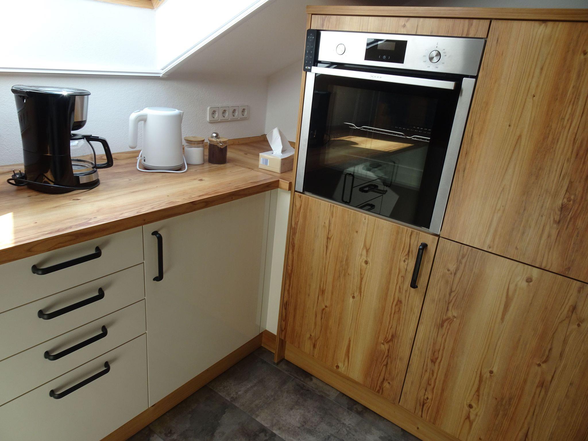 Die schicke Küche lässt keine Wünsche offen. Sie bietet neben Backofen, Cerankochfeld, Kühlschrank, Kaffeemaschine, Geschirrspüler, Toaster, Wasserkocher natürlich auch die wichtigsten Kochutensilien und Geschirr.