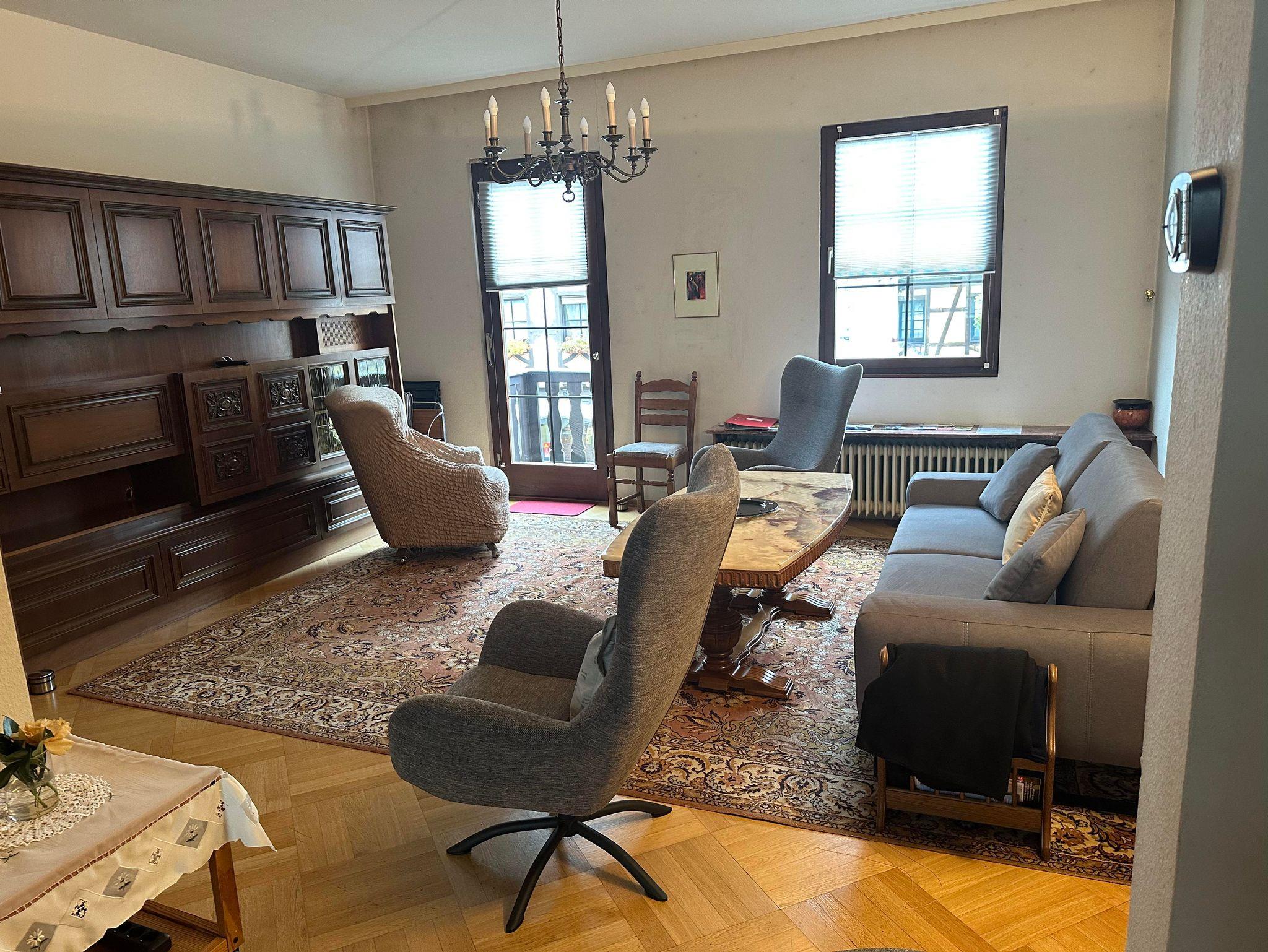 Das Wohn- und Esszimmer mit Balkon hat Blick auf den Marktplatz (TV-Gerät mit Amazon Fire-Stick, Internet-Radio und W-Lan Anschluss).