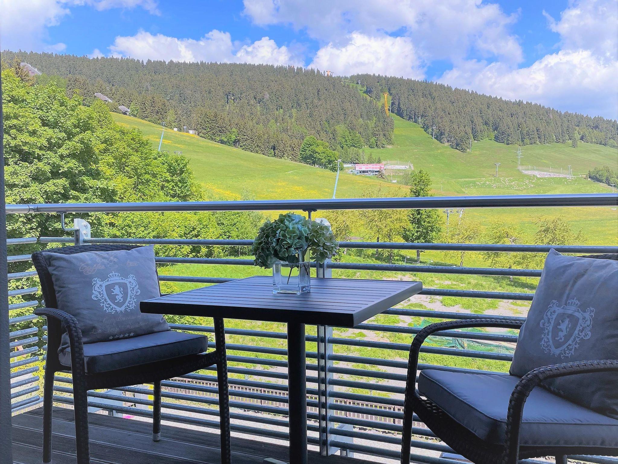 Unser Premiumapartment: jetzt neu mit Balkon und fantastischer Blick auf den Fichtelberg! modernes Apartment, 42qm /2. Etage, 1 sep. Schlafzimmer, 1 WohnZimmer offen zur Küche m. Couch (2 Aufbettungen), Esstisch für 4 Pers., je ein TV in Wohn- u. Schlafzimmer, Bad mit bodentiefer Dusche/WC/Fußbodenheizung, Küche komplett ausgestattet u.a. mit Kühlschrank, 4-fl. Cerankochfeld, Kaffeemaschine, Wasserkocher, Toaster, Geschirrspüler, Microwelle. Bettwäsche u. Handtücher im Preis enthalten. 1 kostenfreier PKW-Stellplatz/Apartment auf unserem Hof.