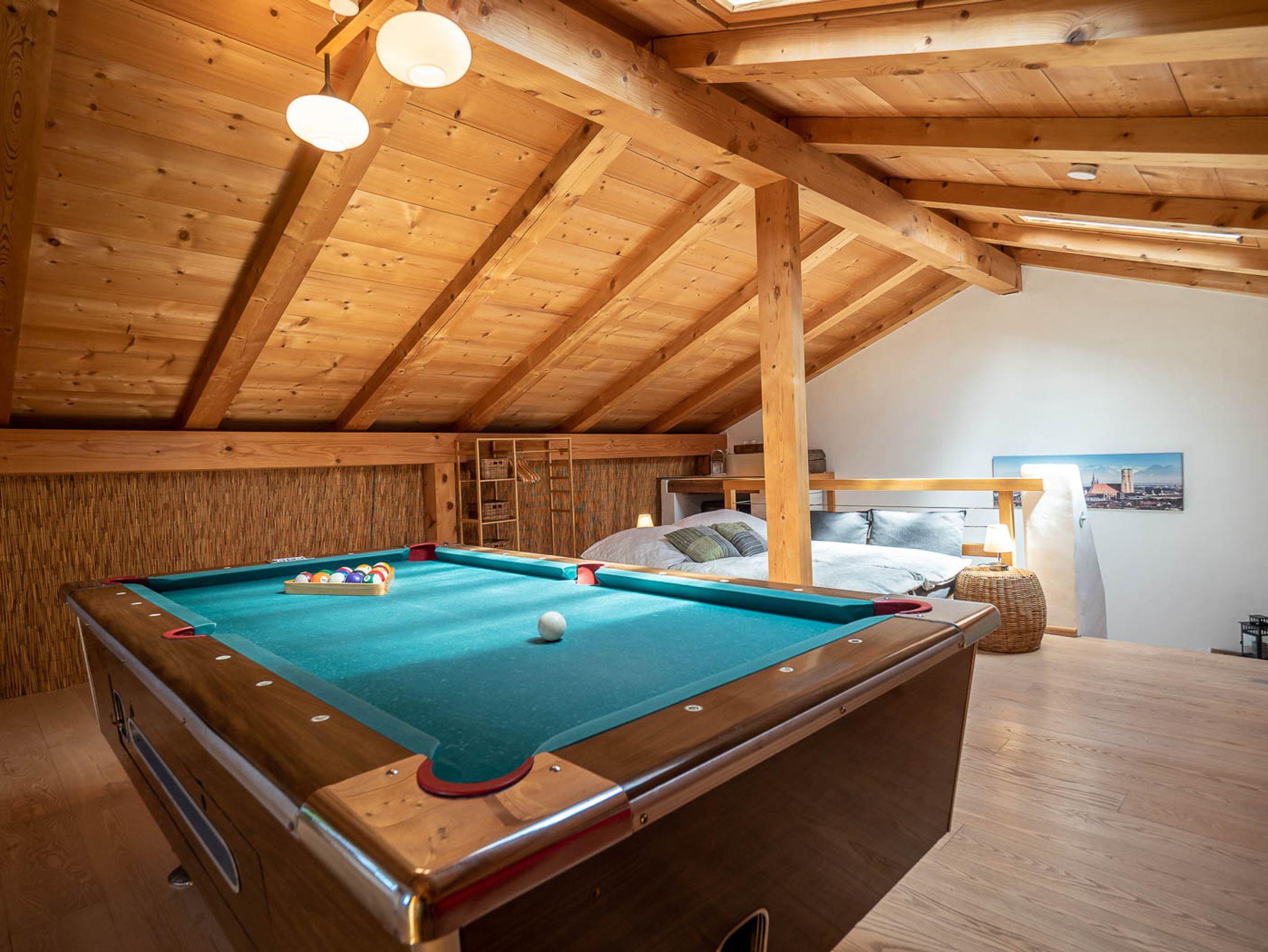 Im OG (18 qm mit Vollholzparkettboden) finden Sie in der Galerie eine hochwertige Schlafcouch für 2 Personen vor (Größe: 140 x 200 cm), ein Billardtisch, eine kleine Bar mit Getränkekühlschrank und die Lounge-Ecke mit extra Sofa und Radio sorgen für Abwechslung.