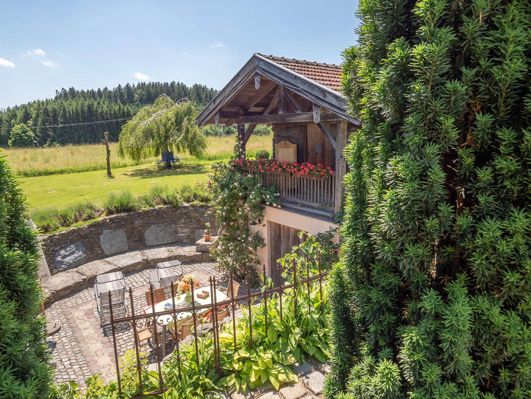 Der Außenbereich im Westteil unseres denkmalgeschützen Bauernhauses, mit möblierte Senkterrasse inmitten eines Gartens mit üppigem Pflanzenbewuchs und altem Baumbestand, Feuerschale, Holzkohlegrill, Sonnenliegen, Sonnenstühlen und Sonnenschirm - ist eine Oase zum Wohlfühlen.