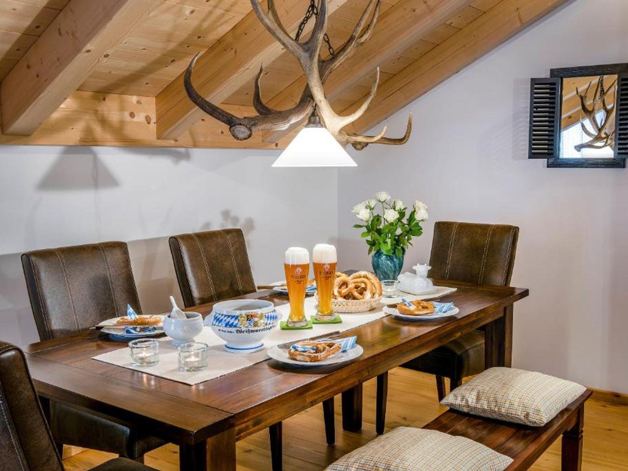 • gemütlicher Essbereich mit Tisch, Stühlen und Bank