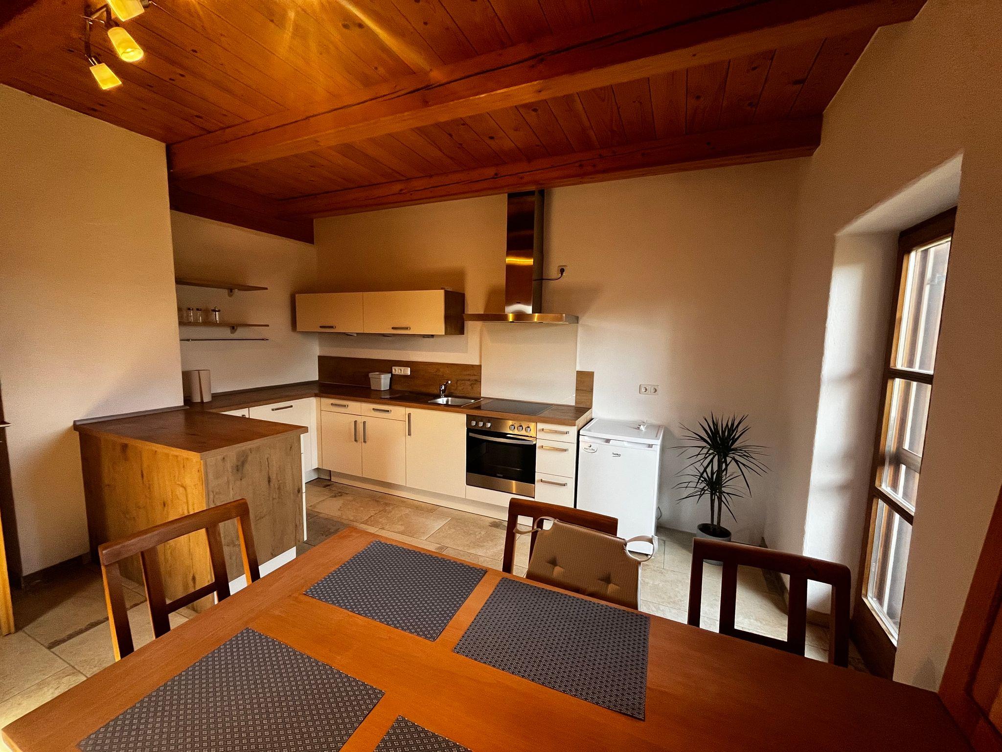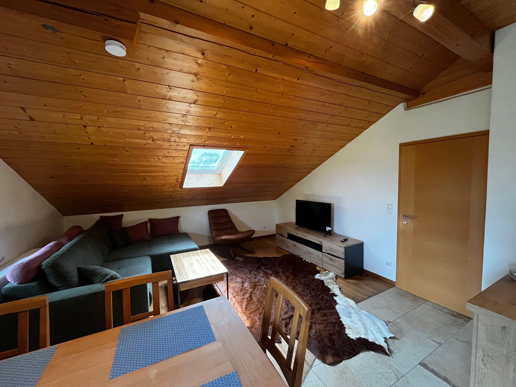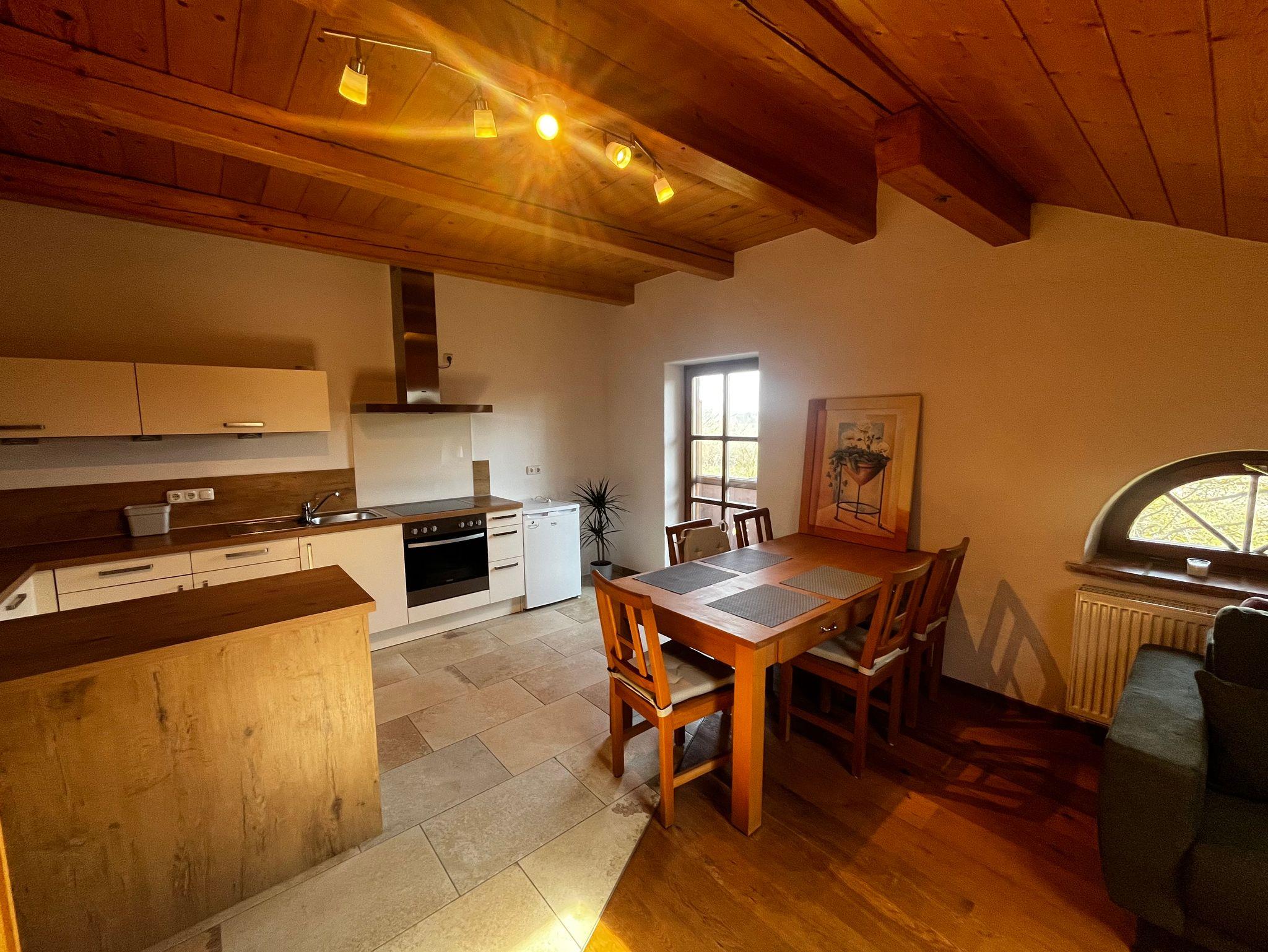Tolle geräumige, ruhige, schöne und vorallem gemütliche Ferienwohnung im Dachgeschoss unseres Biobauernhofs mit separaten Eingang. Sie bietet Platz für 2-4 Personen. Über den Flur/Eingangsbereich der Wohnung gelangt man in die jeweiligen Räume. Die Wohnung verfügt über eine großes Wohn-/Esszimmer mit Küche, Schlafcouch und TV. Hierüber gelangt man auch auf den Balkon. Die Küche ist voll ausgestattet. Ein großes Doppelbett (180 cm) und eine Couch, welche als Schlafcouch dienen kann, bieten zusammen Platz für bis zu 4 Personen. Zusätzliches Kinderbett auf Anfrage.