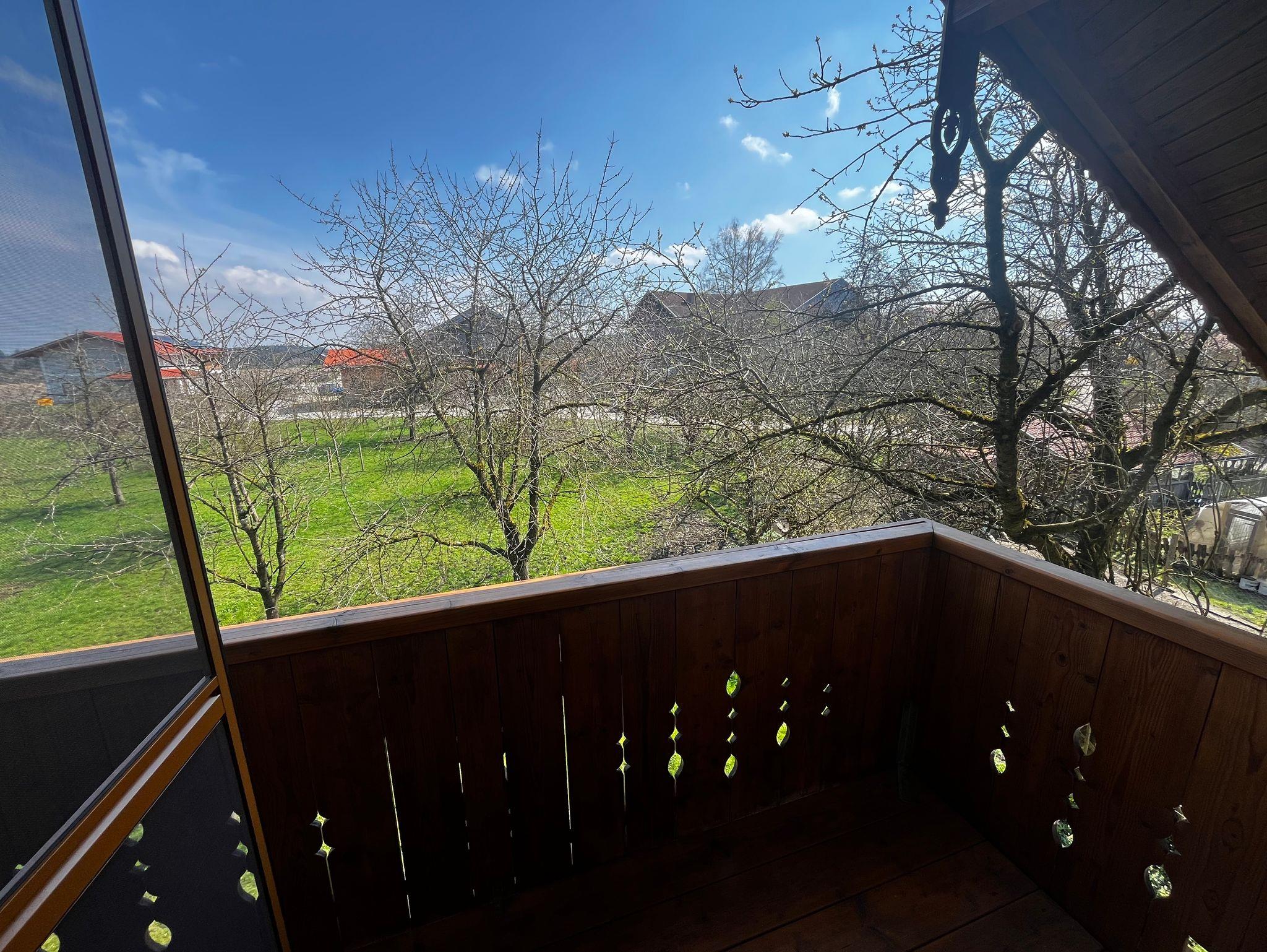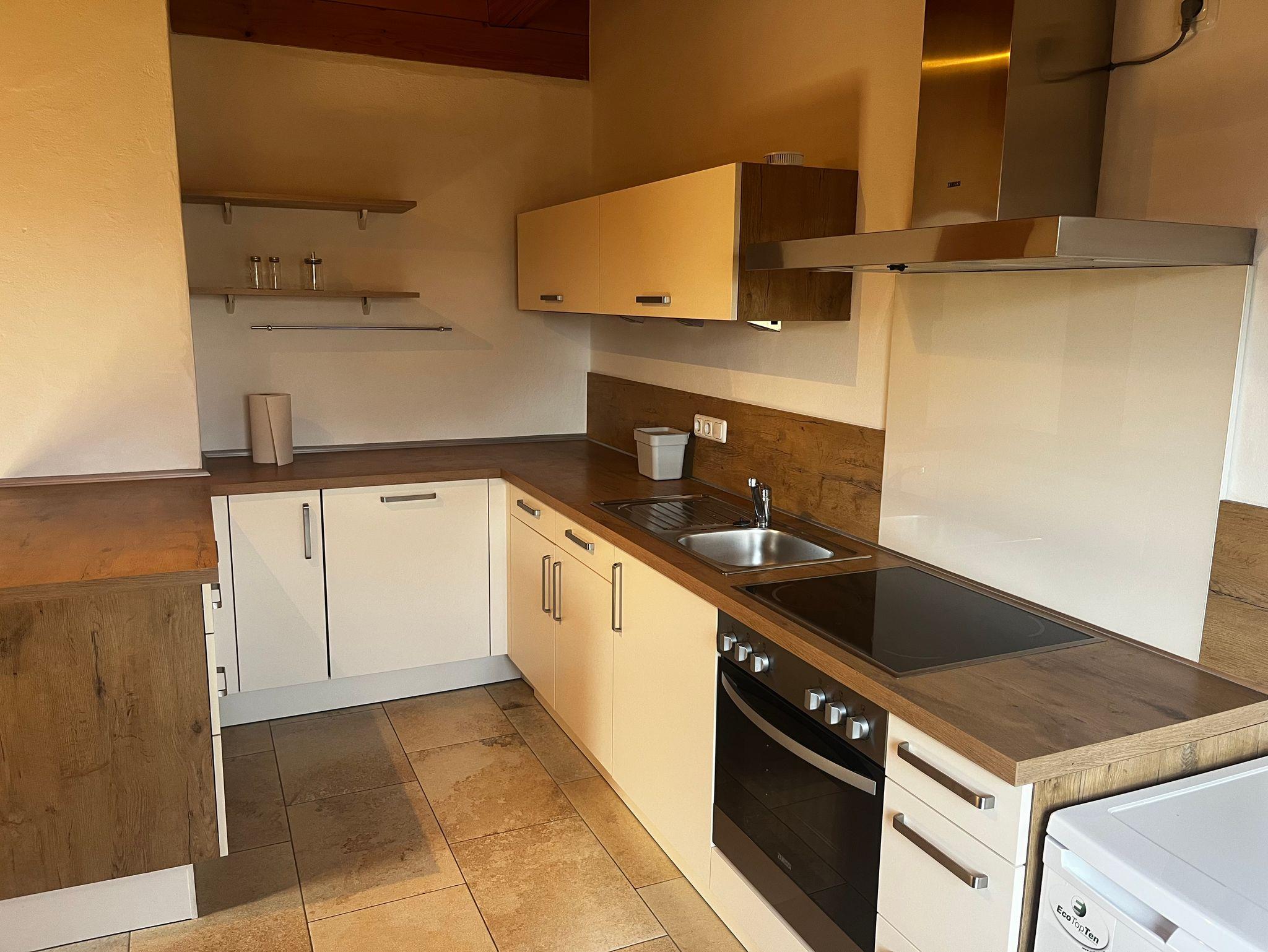 Die Küchen sind voll ausgestattet. Über den Wohn-Essbereich gelangt man auf den Balkon mit schönem Blick auf die Streuobstwiese und Weide.