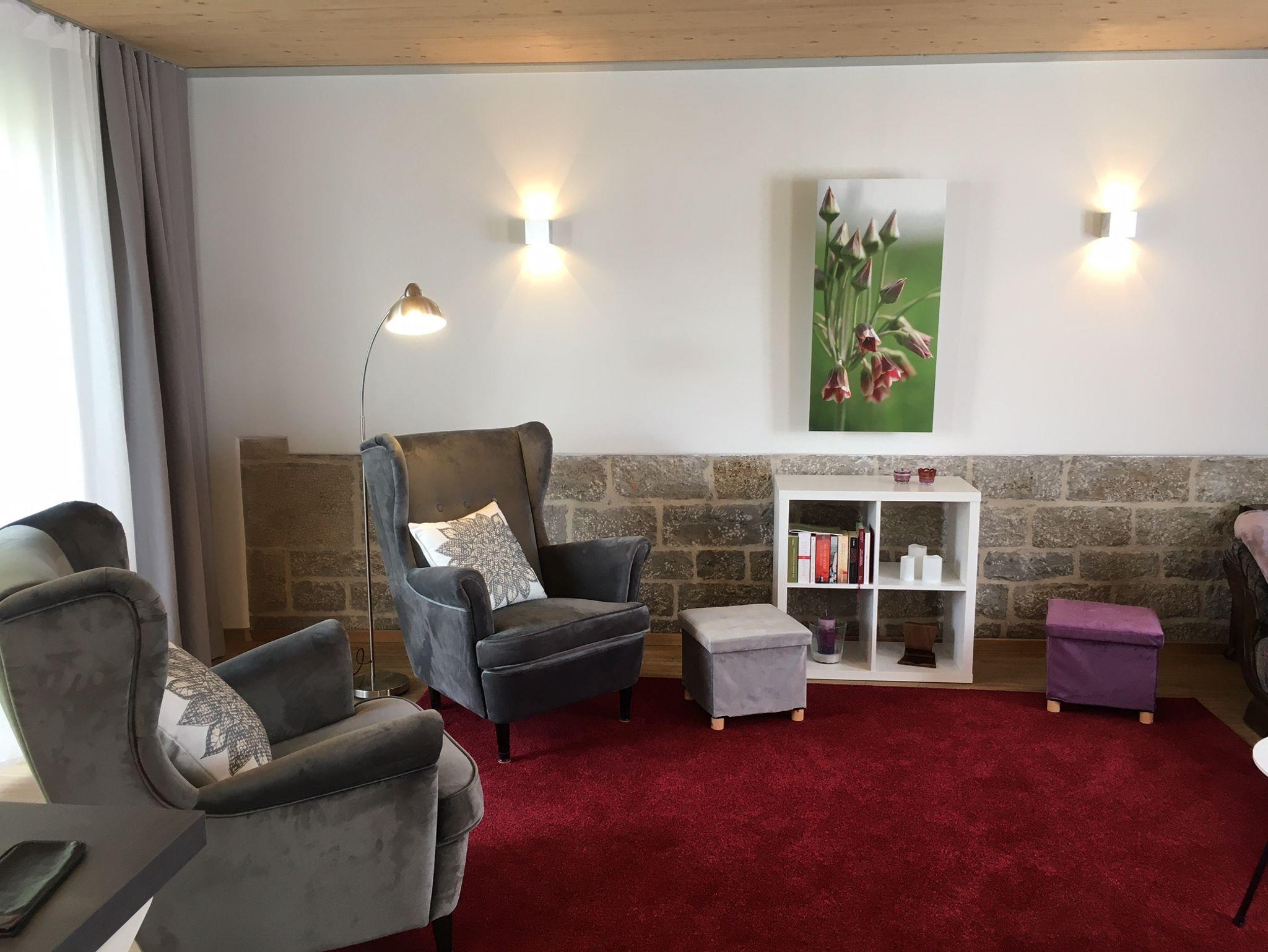 Der Wohn- und Essbereich verfügt über zwei gemütliche Ohrensessel und ein Sofa sowie über einen Esstisch, an dem auch bis zu 6 Personen Platz finden. Zur Ausstattung gehören hier auch eine Bluetooth-Lautsprecherbox sowie ein Fernseher mit SAT-und WLAN-Anschluss. Vom Wohnraum aus besteht direkter Zugang zum großzügigen Nord-Balkon (1,30 x 3,00m) mit Blick ins Grüne.