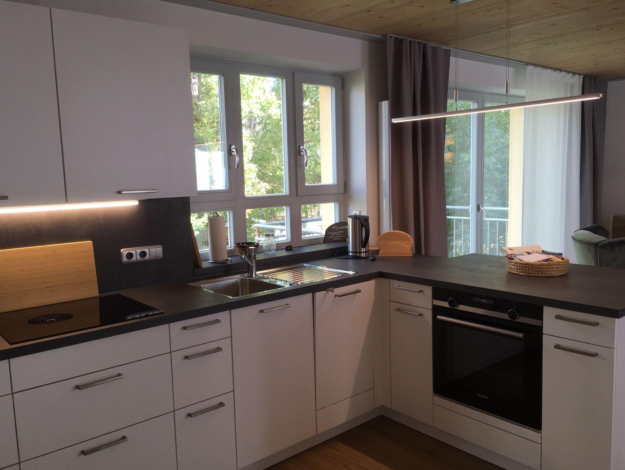 Die Küche verfügt über ein Induktions-Kochfeld mit Bora-Abzug, einen Backofen und eine Spülmaschine. In der gleich an die Küche angrenzenden Speisekammer steht eine Kühl- und Gefrierschrank-Kombination zur Verfügung. Außerdem gibt es hier viel Stauraum. Die Küche ist komplett mit Geschirr und allen grundlegenden Kochutensilien ausgestattet.