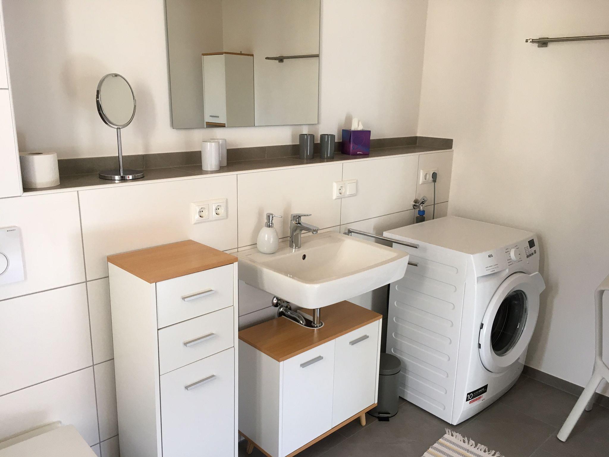 Im kleinen Abstellraum unter dem Treppenaufgang befinden sich Wäscheständer, Bügelbrett und verschiedenes (Putz-)Material. Ein Bügeleisen ist ebenfalls vorhanden. Im Badezimmer steht eine Waschmaschine zur Verfügung.