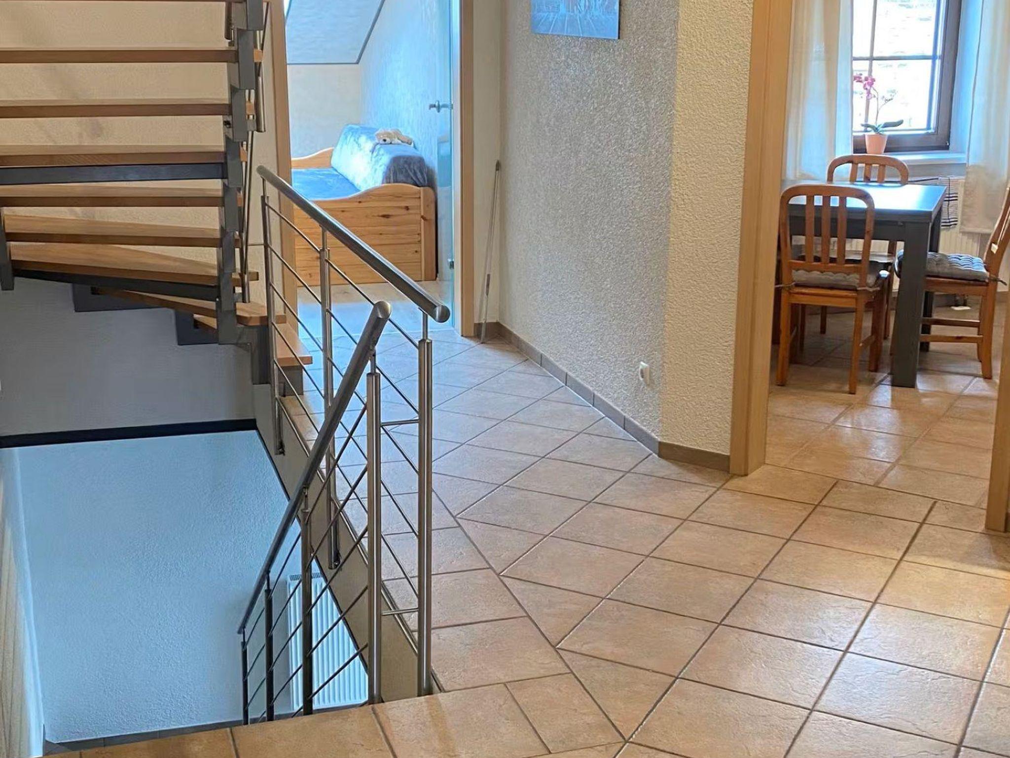 Unsere gemütliche Ferienwohnung mit 75 m² Wohnfläche über zwei Etagen bietet Platz für 1-3 Personen. Das gemütliche Wohnzimmer mit Sofa und Flachbild Kabel-TV lädt zum Verweilen ein. Die komplett ausgestattete Küche mit Herd, Backofen, Mikrowelle, Wasserkocher, Toaster, Kaffeemaschine, Kühlschrank mit Gefrierschrank und Geschirrspüler lässt keine Wünsche offen. Das Schlafzimmer ist mit einem Doppel-Boxspringbett ausgestattet. Ein zweites Schlafzimmer verfügt über ein Schlafsofa und kann auch als Arbeitszimmer genutzt werden. Das Tageslichtbad mit Badewanne, Dusche, WC und Handtuchtrockner runden das Gesamtbild ab. WLAN können Sie kostenlos nutzen. Kostenfreie Parkplätze befinden sich vor dem Haus an der Strasse.
