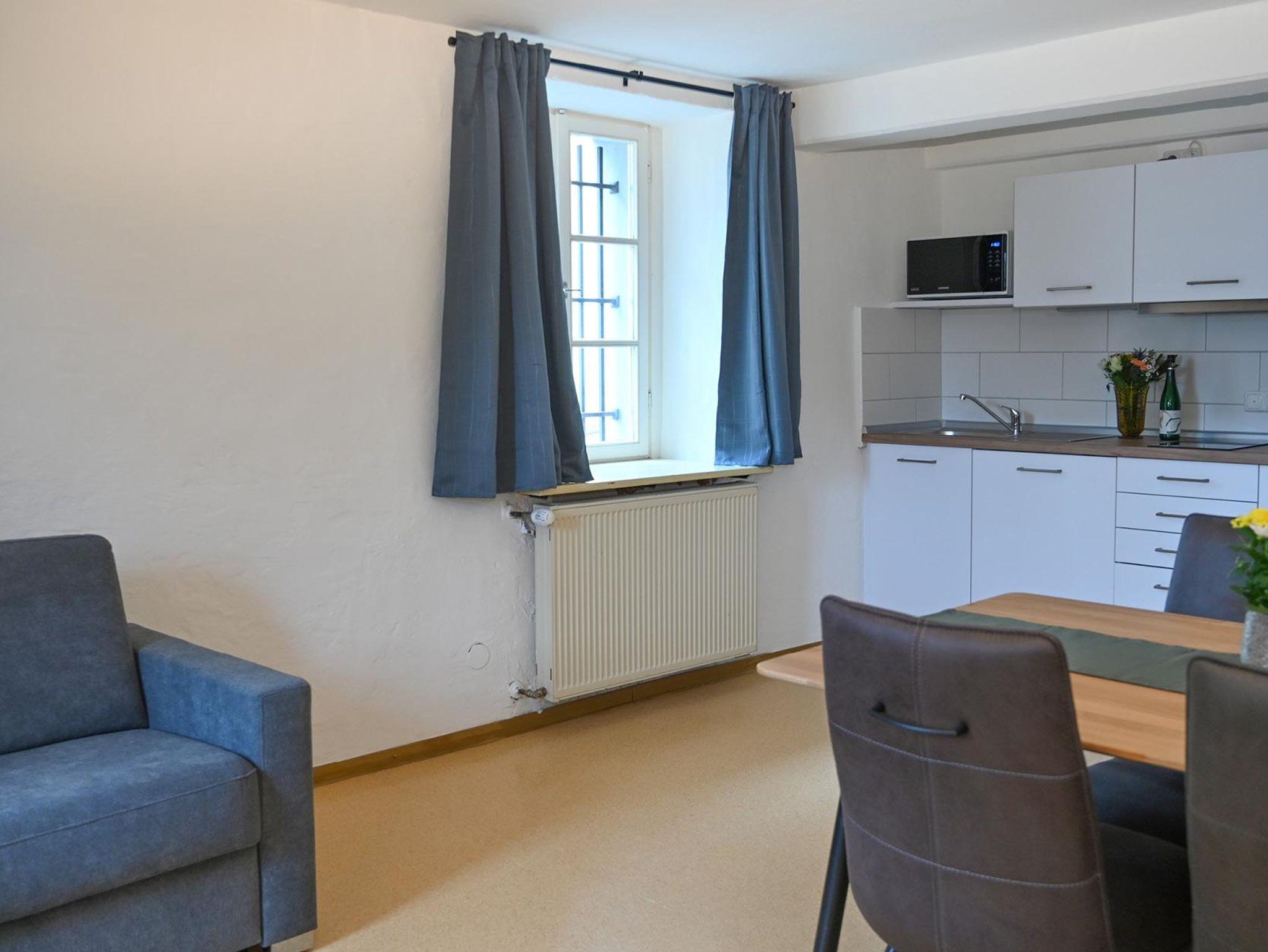 Das Appartement Zelle 13 befindet sich im Erdgeschoss. Auf ca. 36 qm befinden sich 1 Flur mit Abstellkammer, 1 Bad mit WC und Dusche, 1 Wohn-/Esszimmer mit Küche und 1 Schlafzimmer mit Doppelbett.