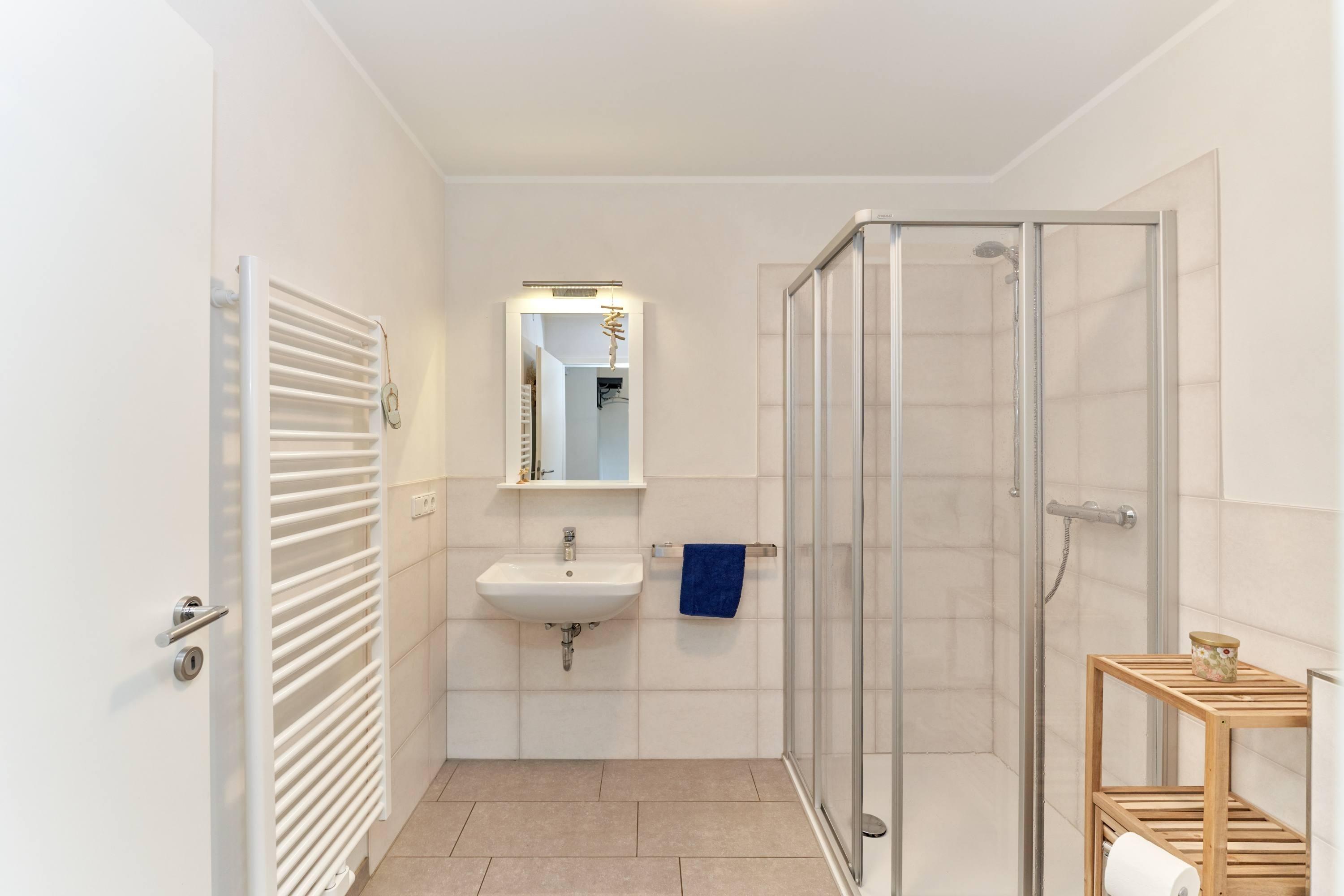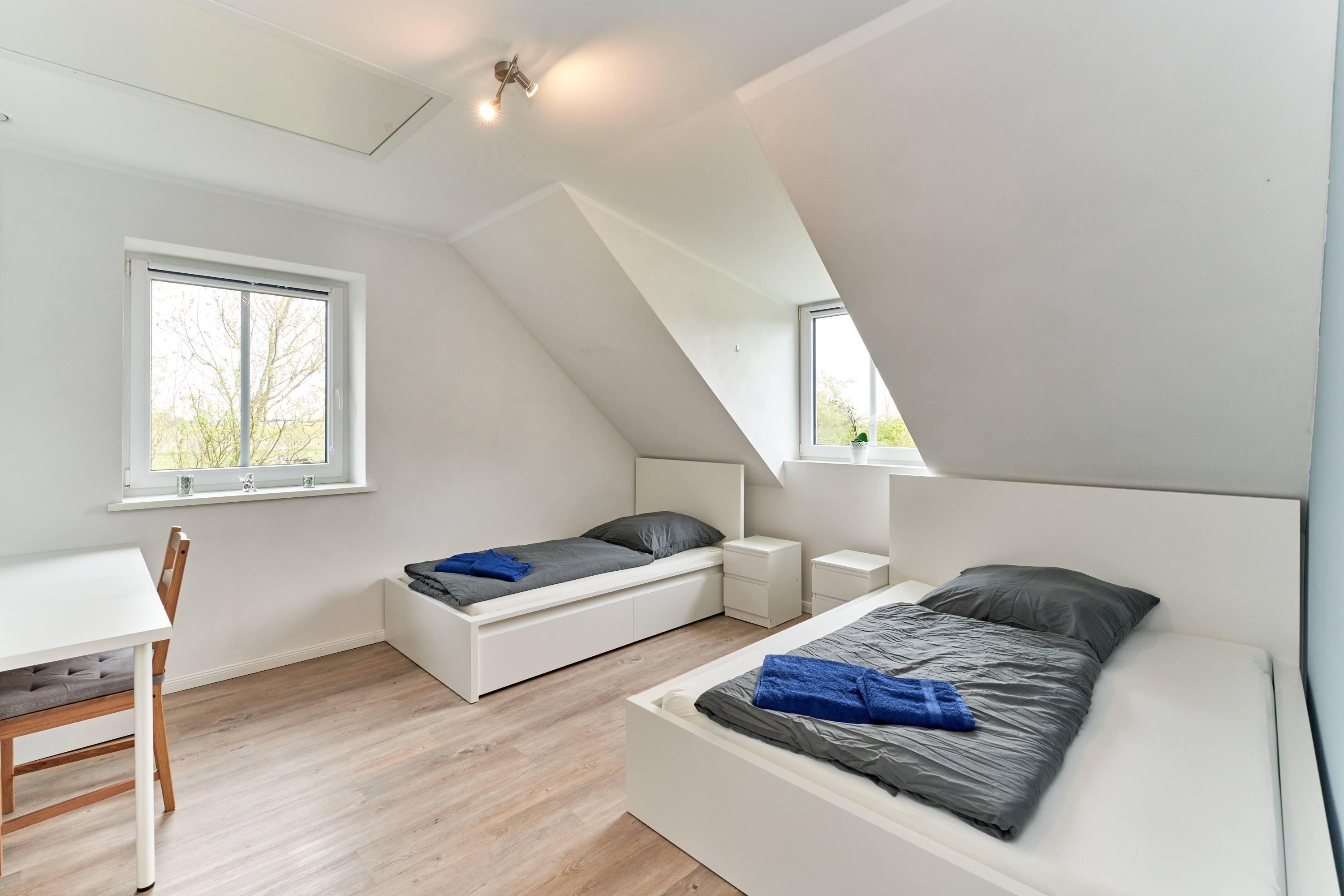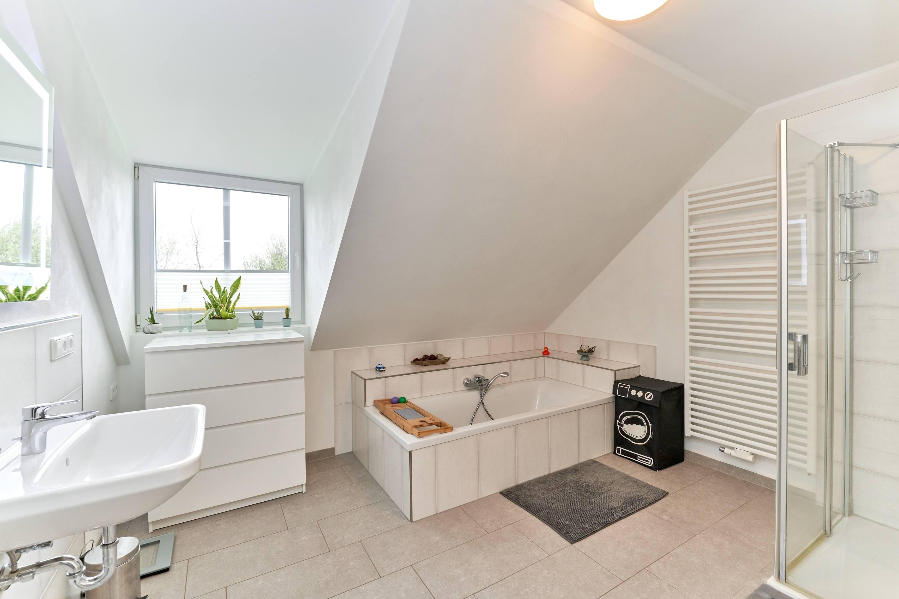 Im Dachgeschoss befinden sich zwei gemütliche Schlafzimmer, die Ihnen eine erholsame Nachtruhe garantieren. Zudem erwartet Sie ein großes Badezimmer mit separater Badewanne und Dusche, Toilette und Waschbecken – ideal für entspannende Wellnessmomente nach einem aktiven Tag an der Nordsee. Ein Ankleidezimmer bietet Ihnen zusätzlichen Stauraum für Ihre Kleidung und persönlichen Dinge.