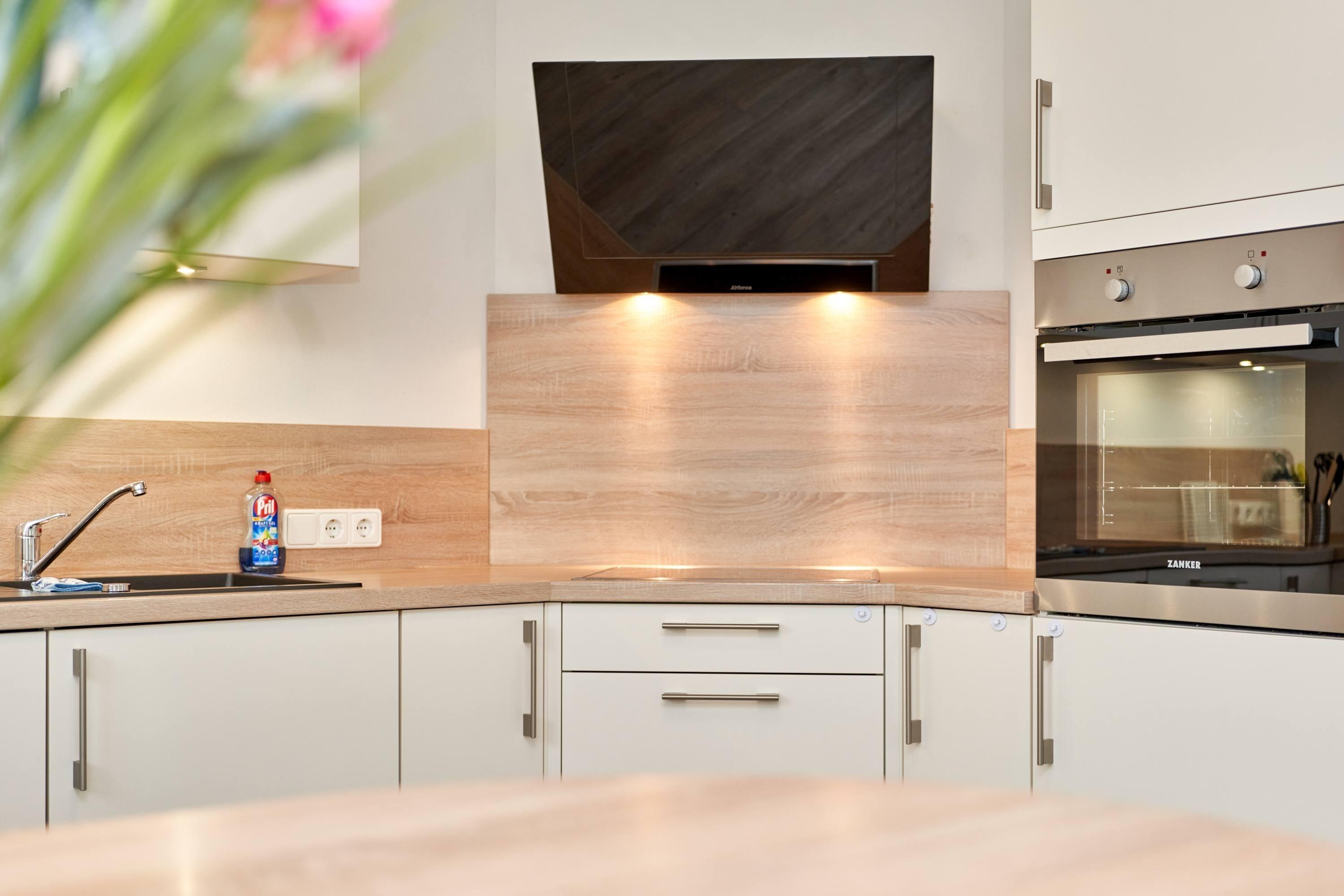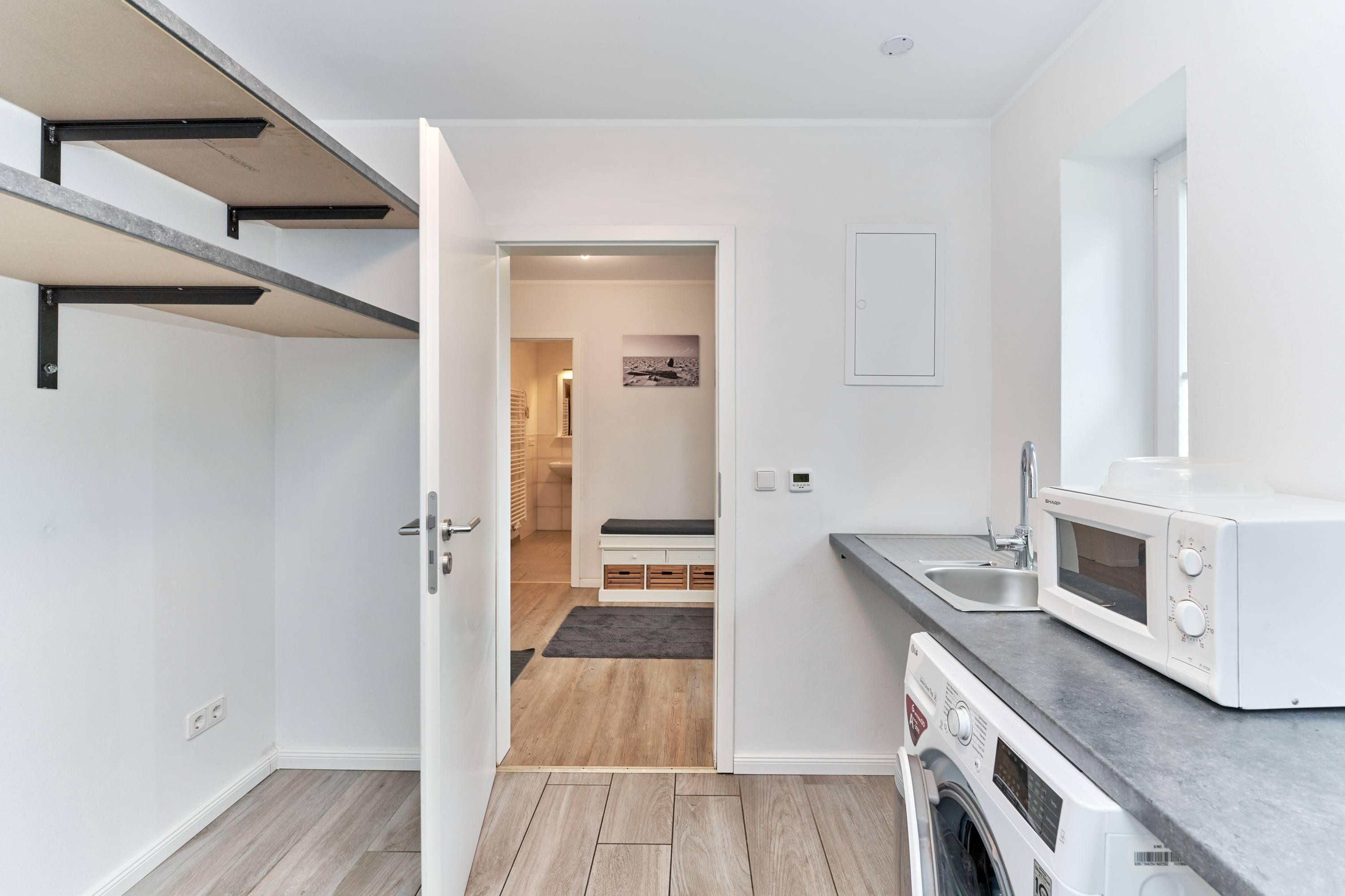 Der einladende Wohn- und Essbereich ist das Herzstück der Wohnung. Hier können Sie nach einem erlebnisreichen Tag entspannen, gemeinsam essen oder einfach die Ruhe genießen. Die integrierte, voll ausgestattete Küche lässt keine Wünsche offen – hier können Sie Ihre Lieblingsgerichte zubereiten. Im angrenzenden Hauswirtschaftsraum finden Sie praktischen Stauraum für Ihre Utensilien. Ein gut ausgestattetes Badezimmer mit Dusche rundet das Erdgeschoss ab.