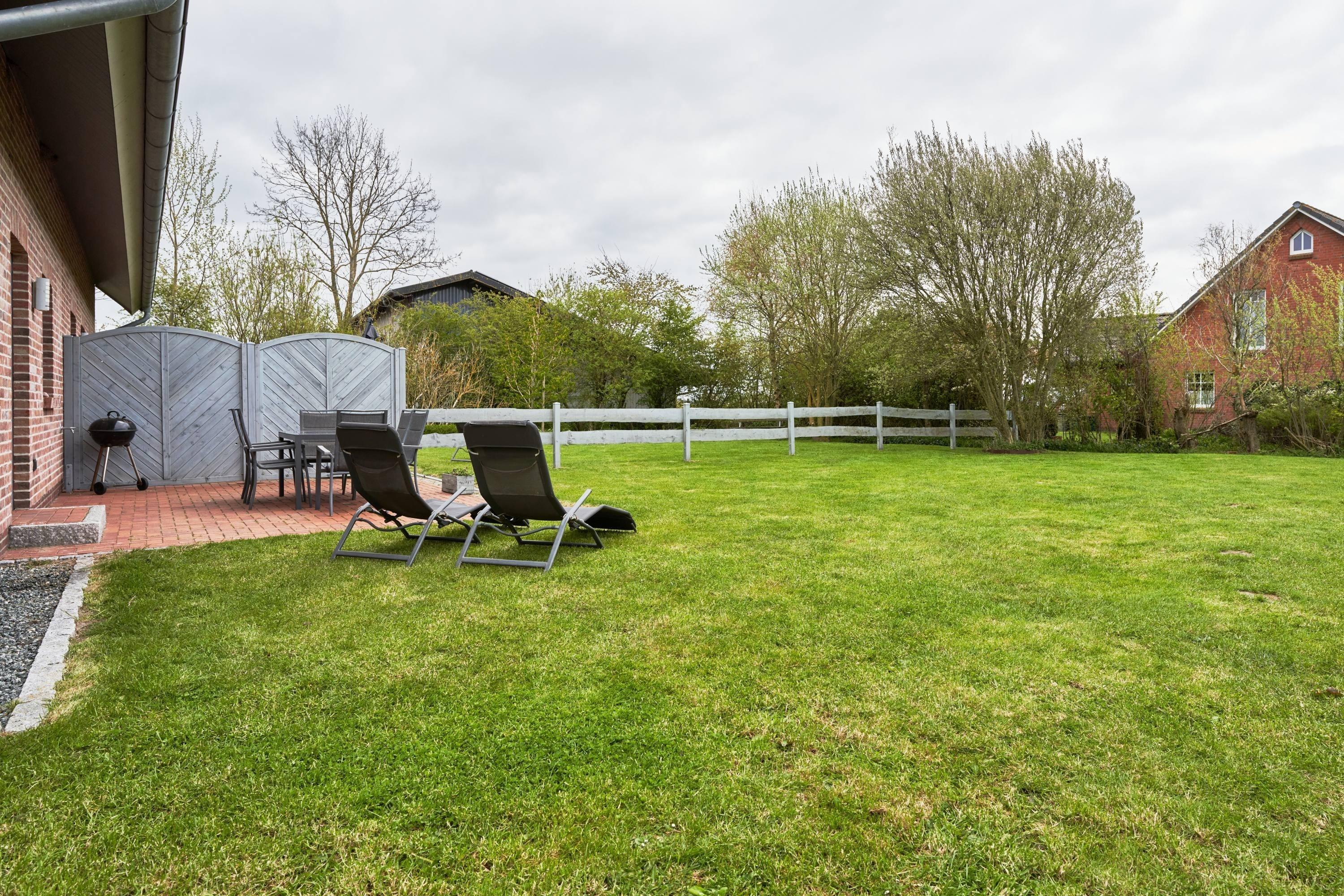 Der nach Süden ausgerichtete Garten ist ein echtes Highlight des Hauses. Auf der möblierten Terrasse können Sie bei einer Tasse Kaffee die Morgensonne genießen oder am Abend bei einem Glas Wein den Tag ausklingen lassen. Gartenliegen laden zum Sonnenbaden ein, während Kinder auf der Rasenfläche spielen können.