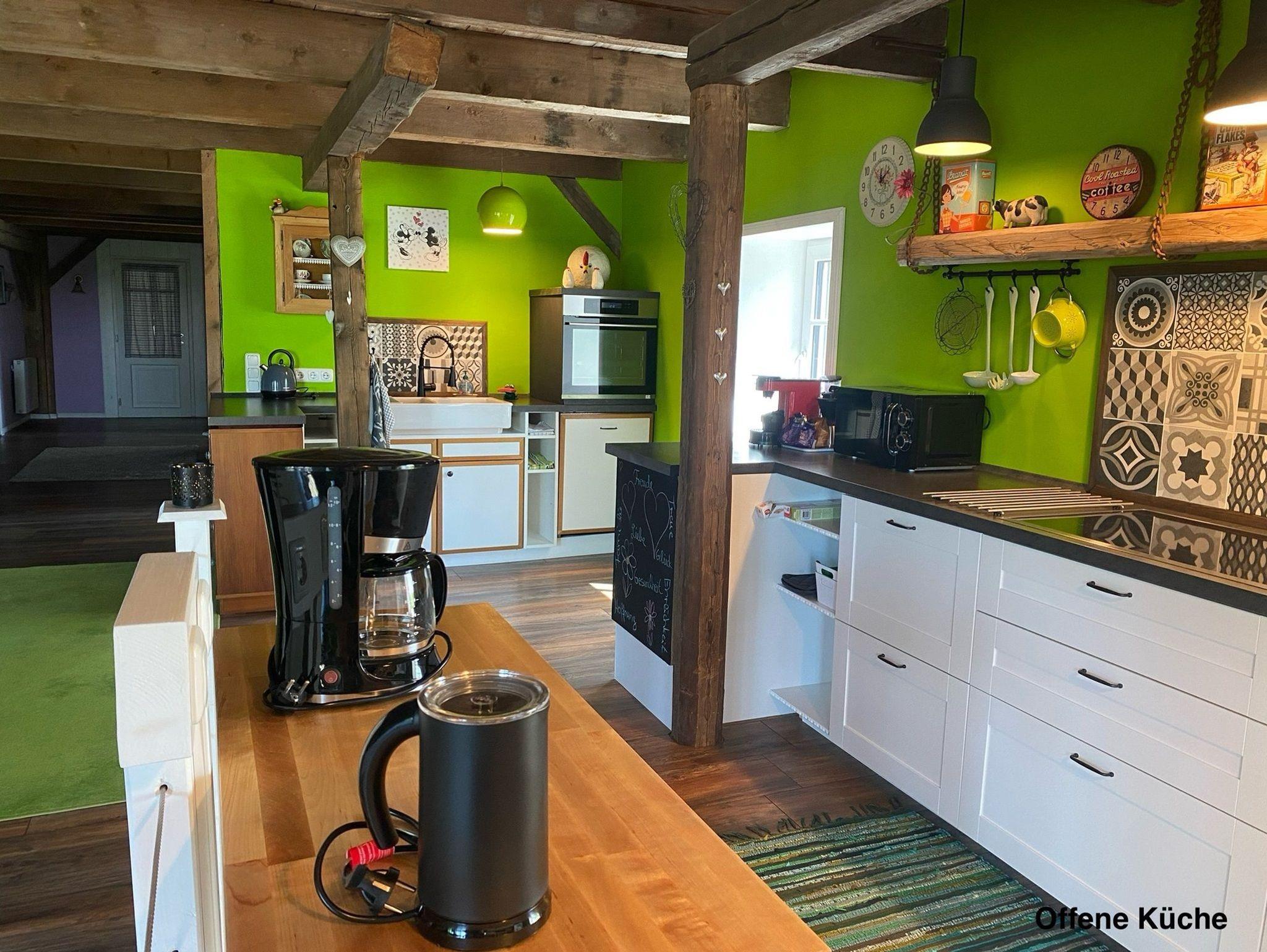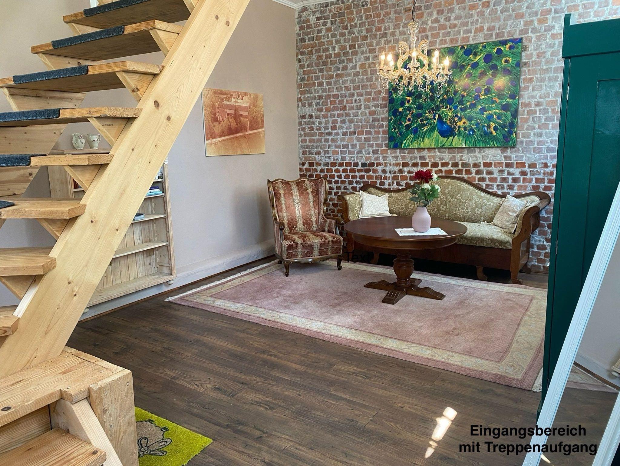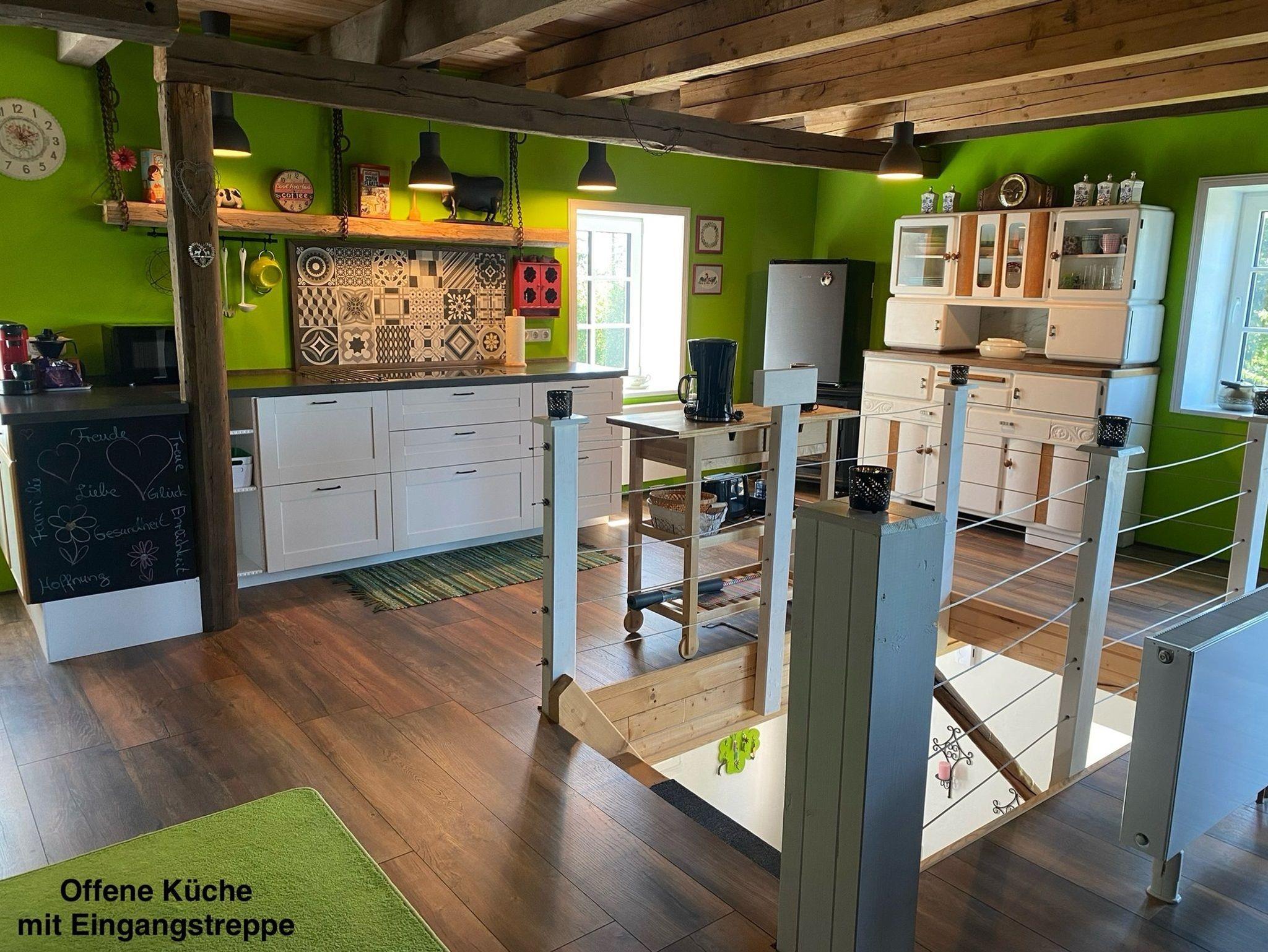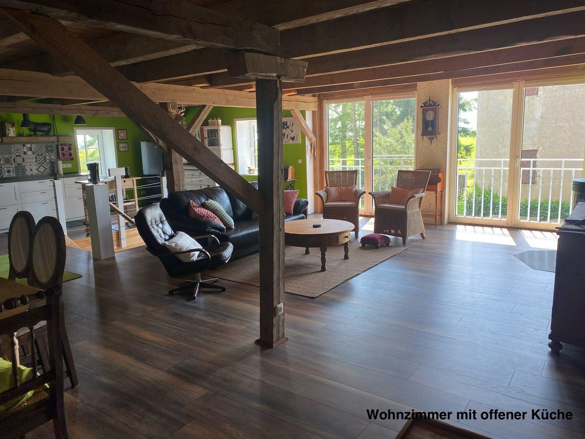 Die 170qm große Wohnung, mit ihren unbehandelten Holzdecken und Balken, befindet sich in ruhiger, rückwärtiger Einzellage in der größten Scheune des Resthofes, mit Blick über die umliegenden Felder und verfügt über einen separaten Eingang. Durch den geräumigen Eingangsbereich im Erdgeschoss gelangt man über eine Treppe in den offenen Wohn-, Küchen-, Essbereich in der ersten Etage.
