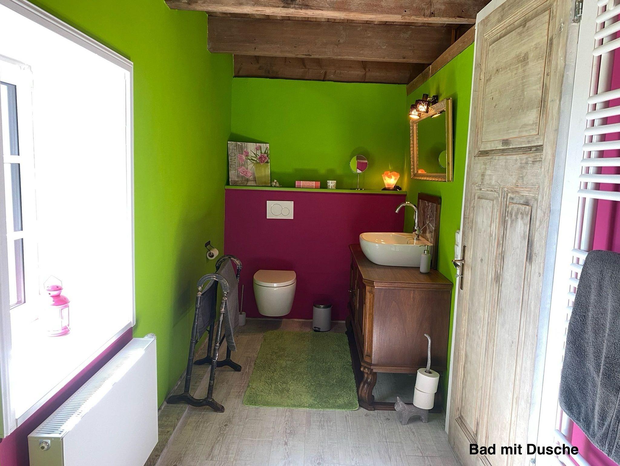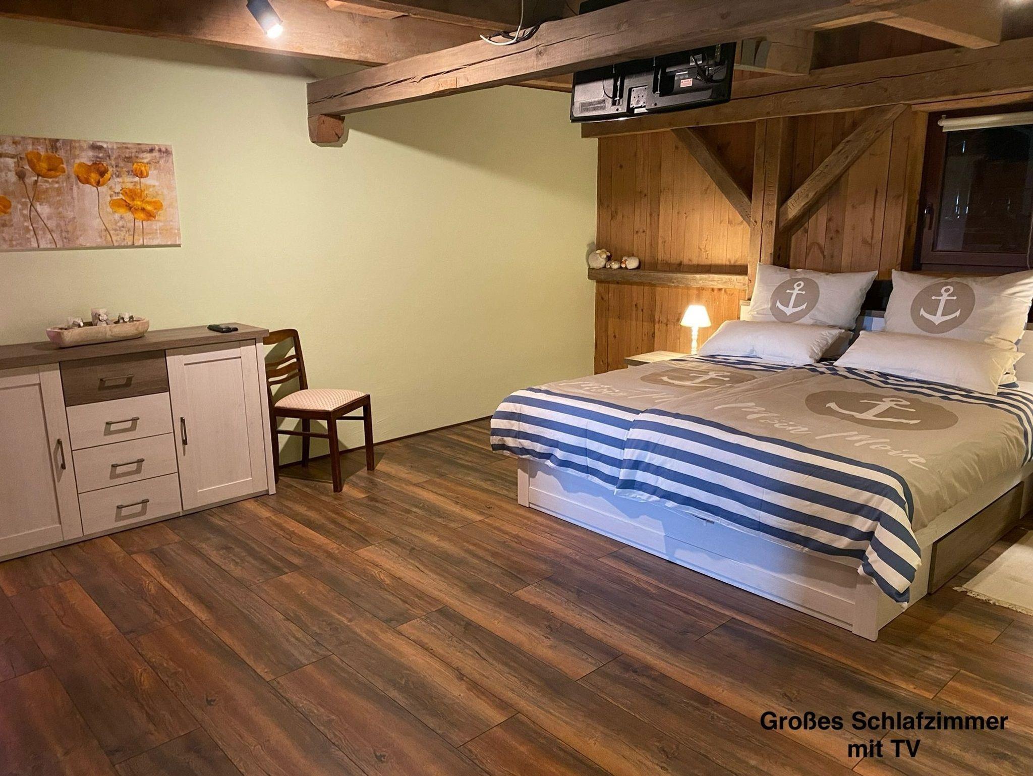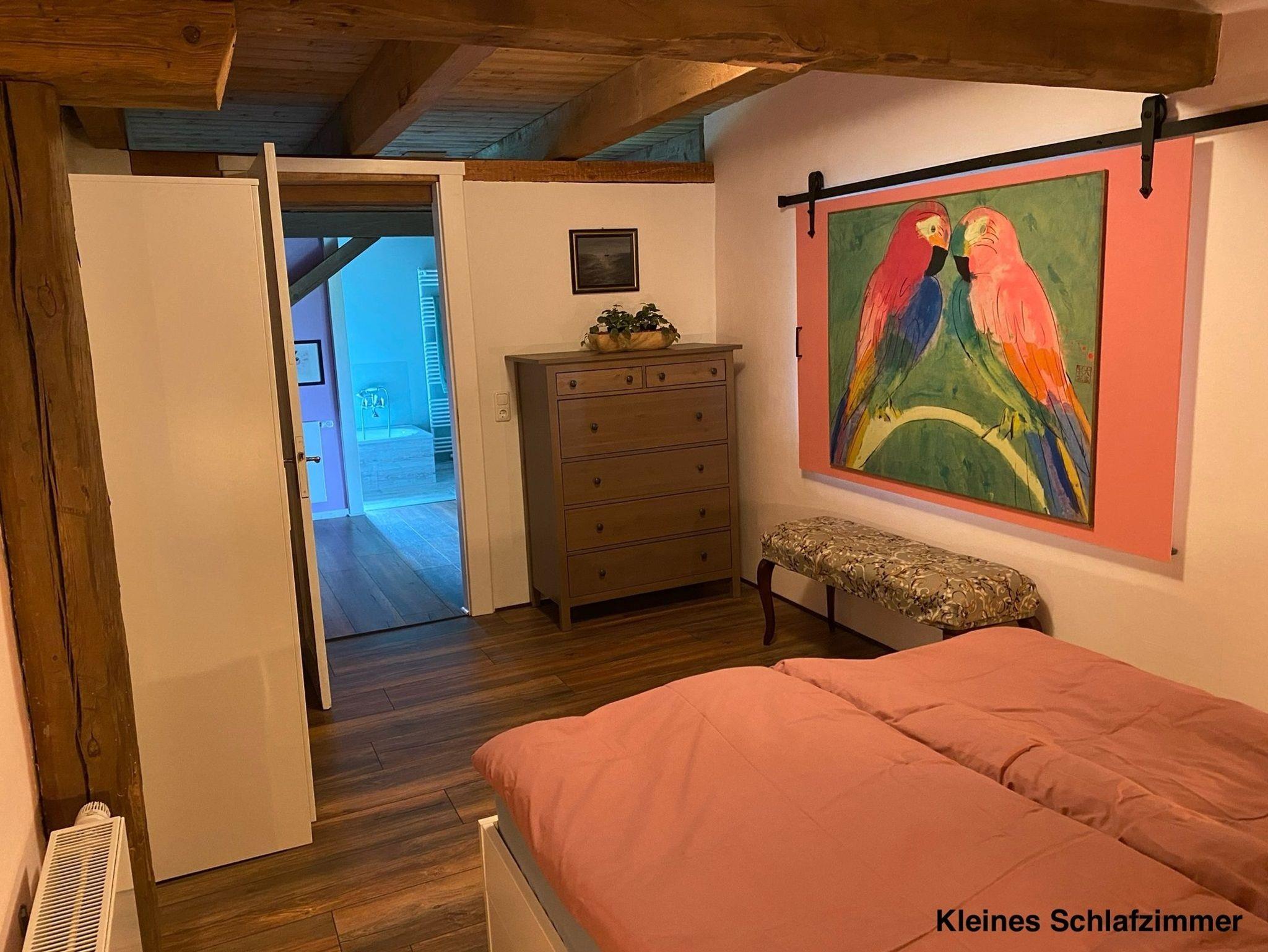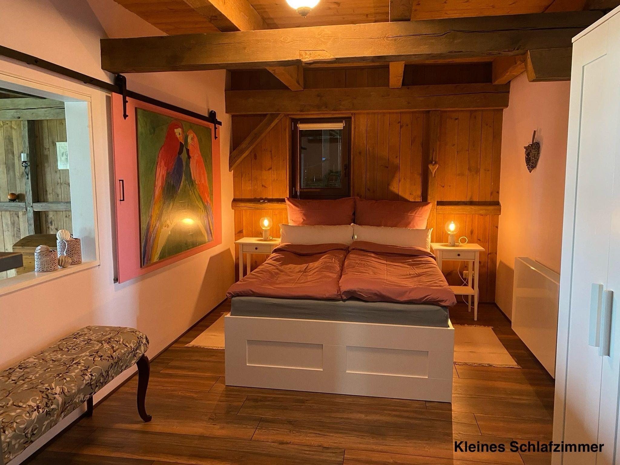 Ein großes Schlafzimmer mit Doppelbett (1,80m. x 2,00m) und TV und ein kleineres Schlafzimmer mit Doppelbett (1,40m x 2,00m) und mit fensterartiger, verschließbarer Öffnung zum Wohnbereich. Auf Grund der Lage der Wohnung in der Scheune gibt es in dem größeren Schlafraum kein Tageslicht, aber in beiden Zimmern Fenster, mit Blick ins Stallgebäude, zum Lüften.