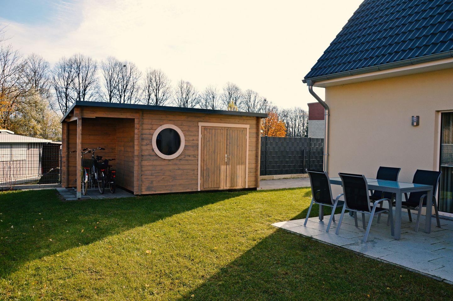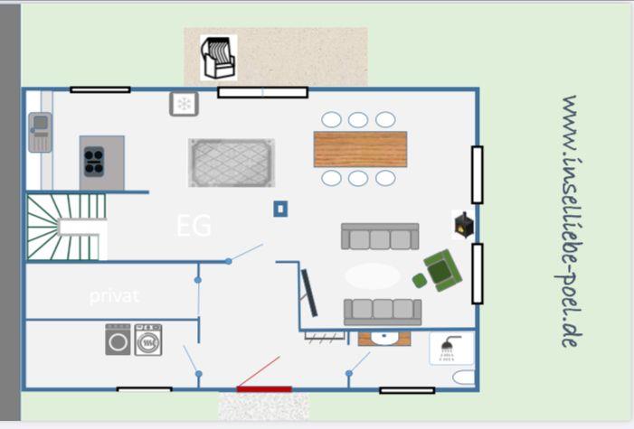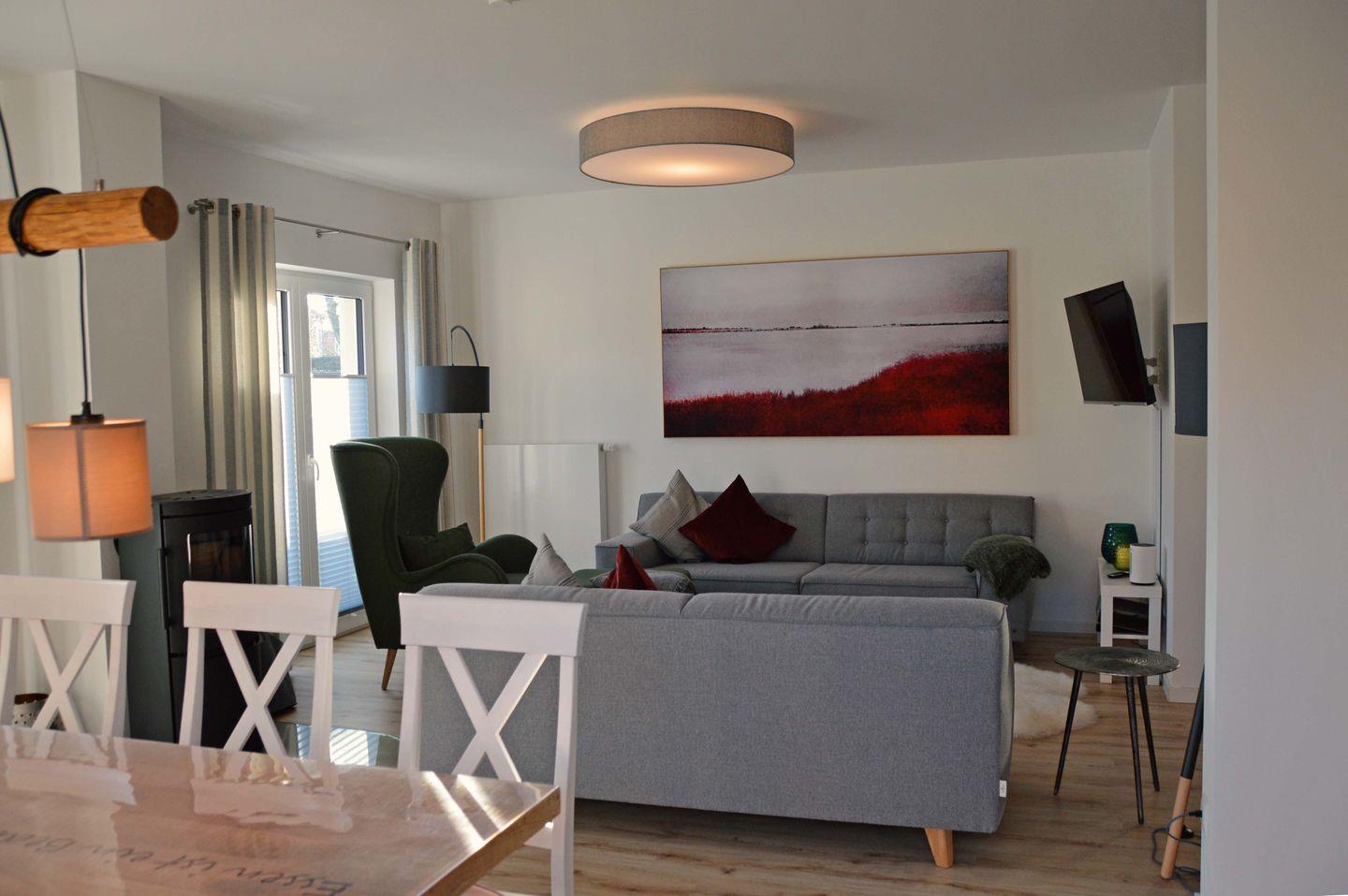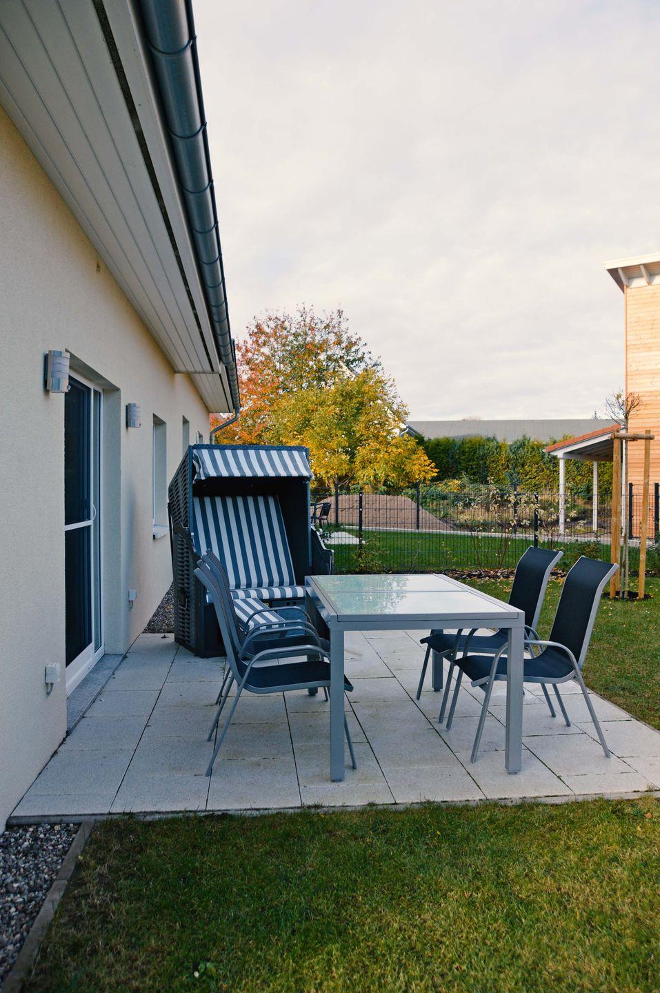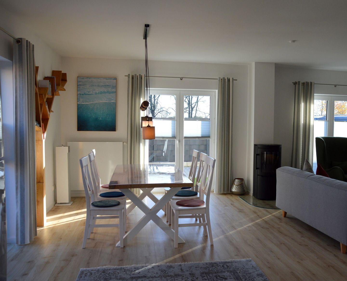 Dieses familienfreundliche, modern und stilvoll eingerichtete Ferienhaus bietet bis zu 5 Personen viel Platz und Komfort für einen unbeschwerten Urlaub auf der Insel Poel. Der helle Wohnbereich in offener Bauweise integriert auch den Essbereich mit großzügigem Esstisch und voll ausgestatteter Küche mit allen technischen Geräten, die Sie benötigen. Eine gemütliche Sofaecke mit TV-Gerät, WLAN und Kaminofen lassen Sie entspannte Stunden verbringen. Im Wohnbereich befindet sich außerdem der Zugang zur möblierten Terrasse mit eingezäuntem Garten mit Gartenhaus und Strandkorb.