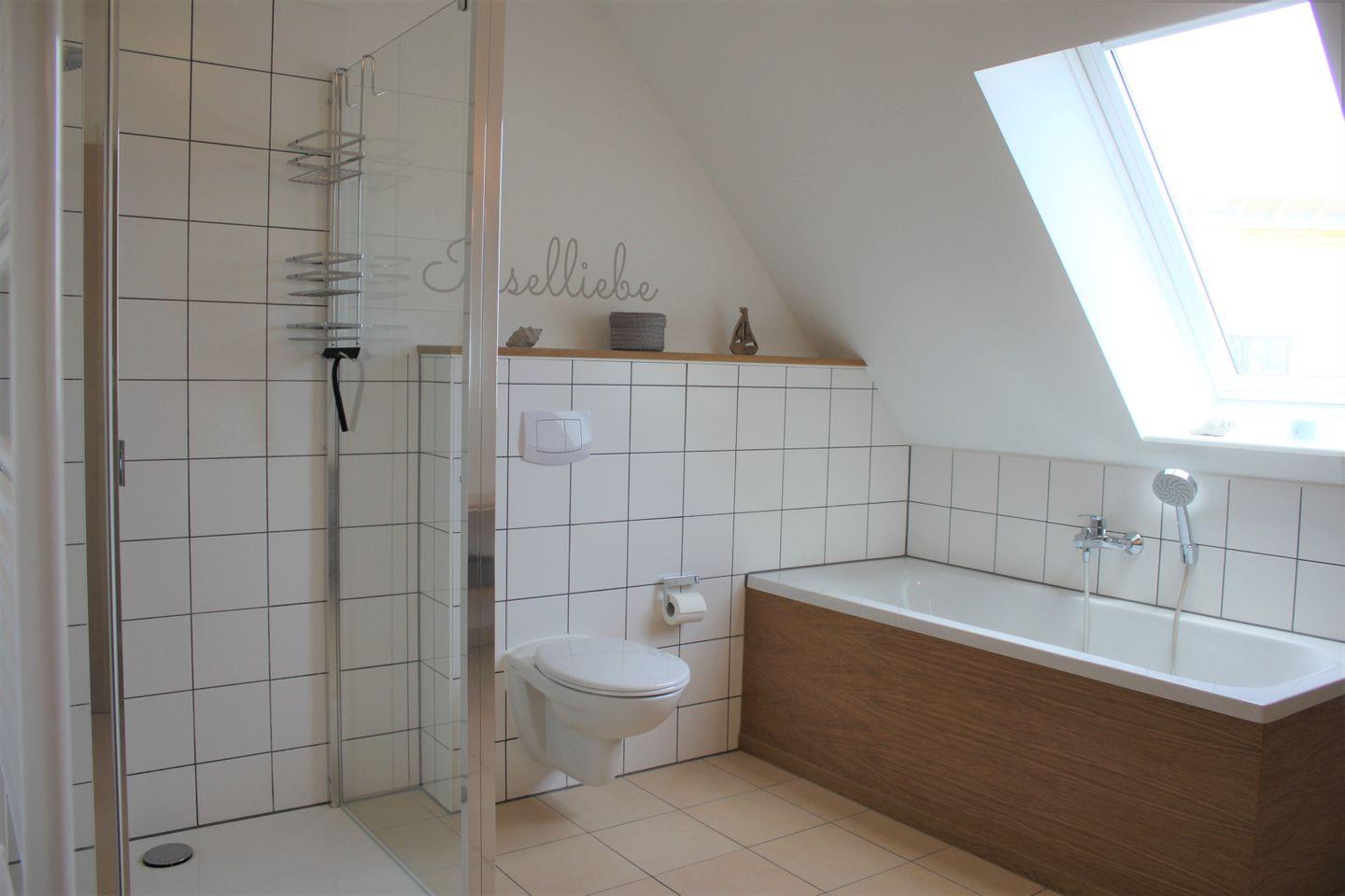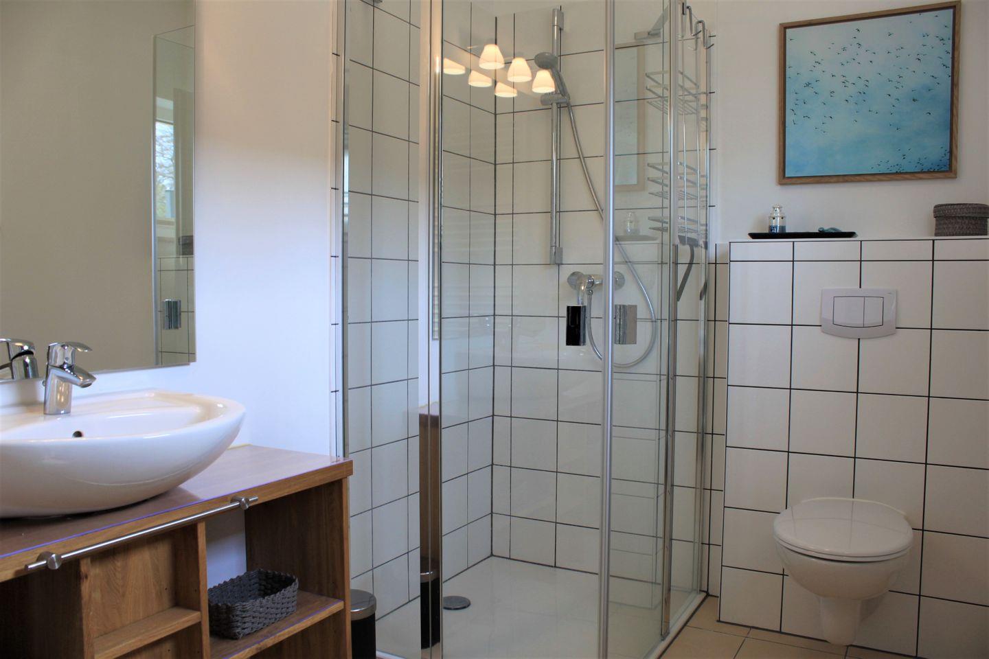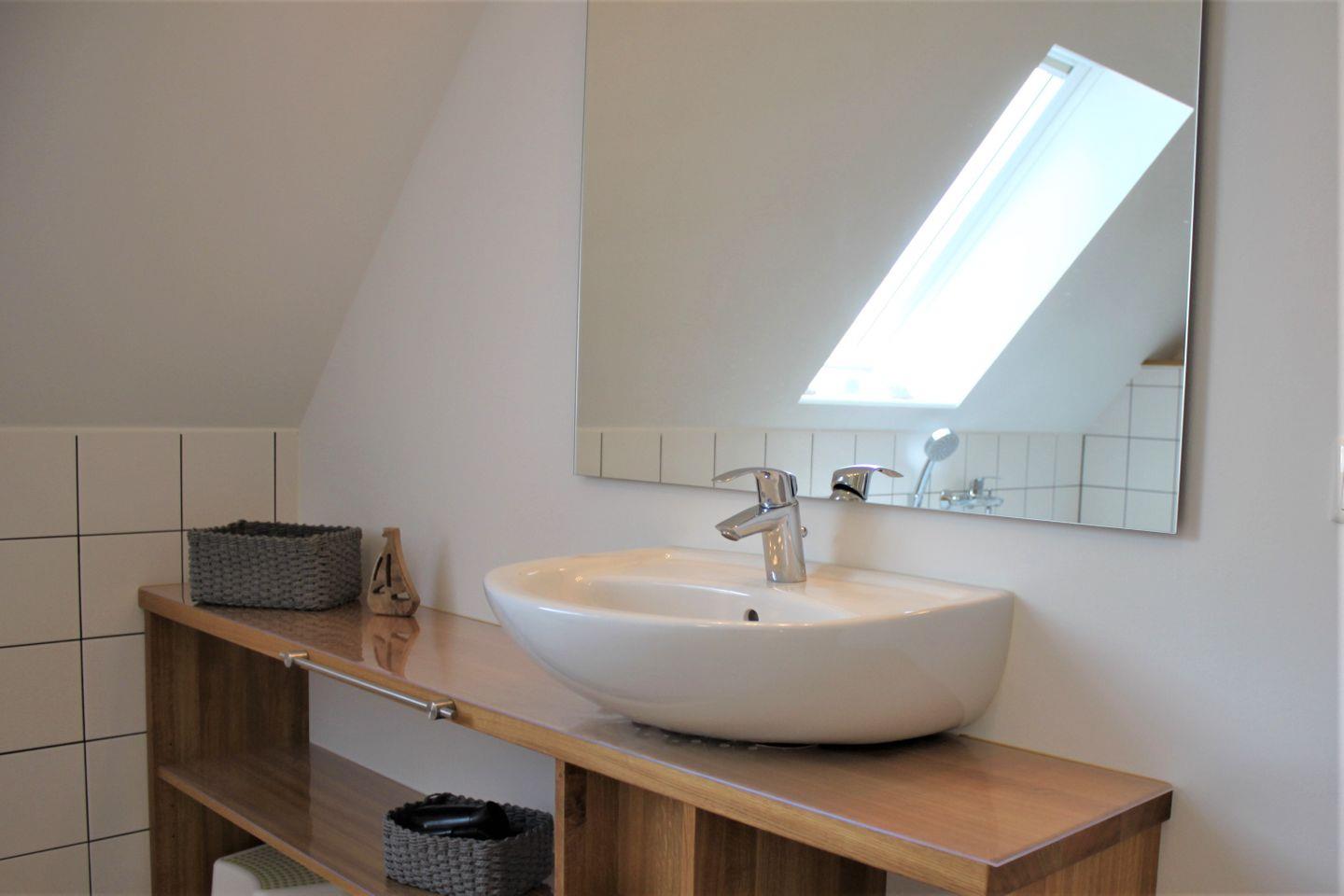 Das moderne Badezimmer im Obergeschoss ist mit einer Badewanne und ebenerdige Dusche, Waschtisch, Föhn und WC ausgestattet. Ein weiteres Badezimmer im Erdgeschoss verfügt ebenfalls über eine ebenerdige Dusche, Waschtisch und WC.
