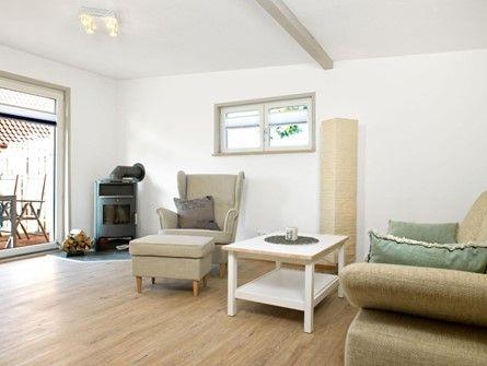 Der helle Wohnbereich besticht mit einer gemütlichen Sofaecke mit Lesesessel, Kamin, TV und WLAN. Hier legen Sie nach einem aufregenden Urlaubstag entspannt die Füße hoch. Außerdem befindet sich hier der Zugang zur möblierten Terrasse.