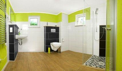 Im geräumigen Badezimmer mit Fenster verfügen Sie über eine ebenerdige Dusche, einen Waschtisch und ein WC.
