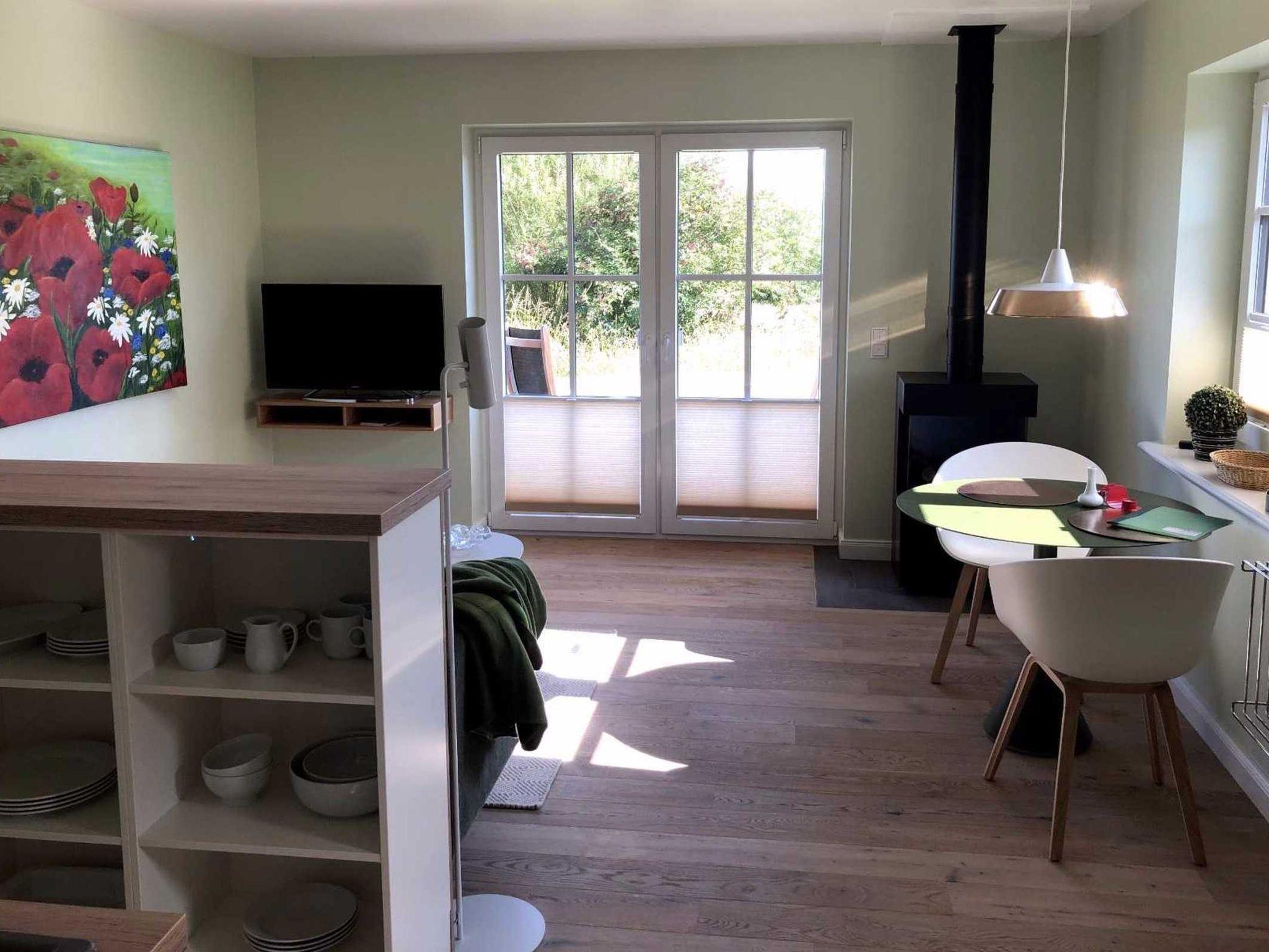 Die Ferienwohnung Ost Windstärke 2 liegt im Erdgeschoss im Haus Ost auf unserer Anlage. Die Ferienwohnung ist im skandinavischen Stil eingerichtet und besteht aus einem kombinierten Wohn-/ Esszimmer mit Gaskamin, angeschlossener Terrasse und offener Küche. Das Schlafzimmer mit Bad en Suite mit ebenerdiger Dusche ist durch eine Glasschiebetür getrennt. Das WC ist separat.