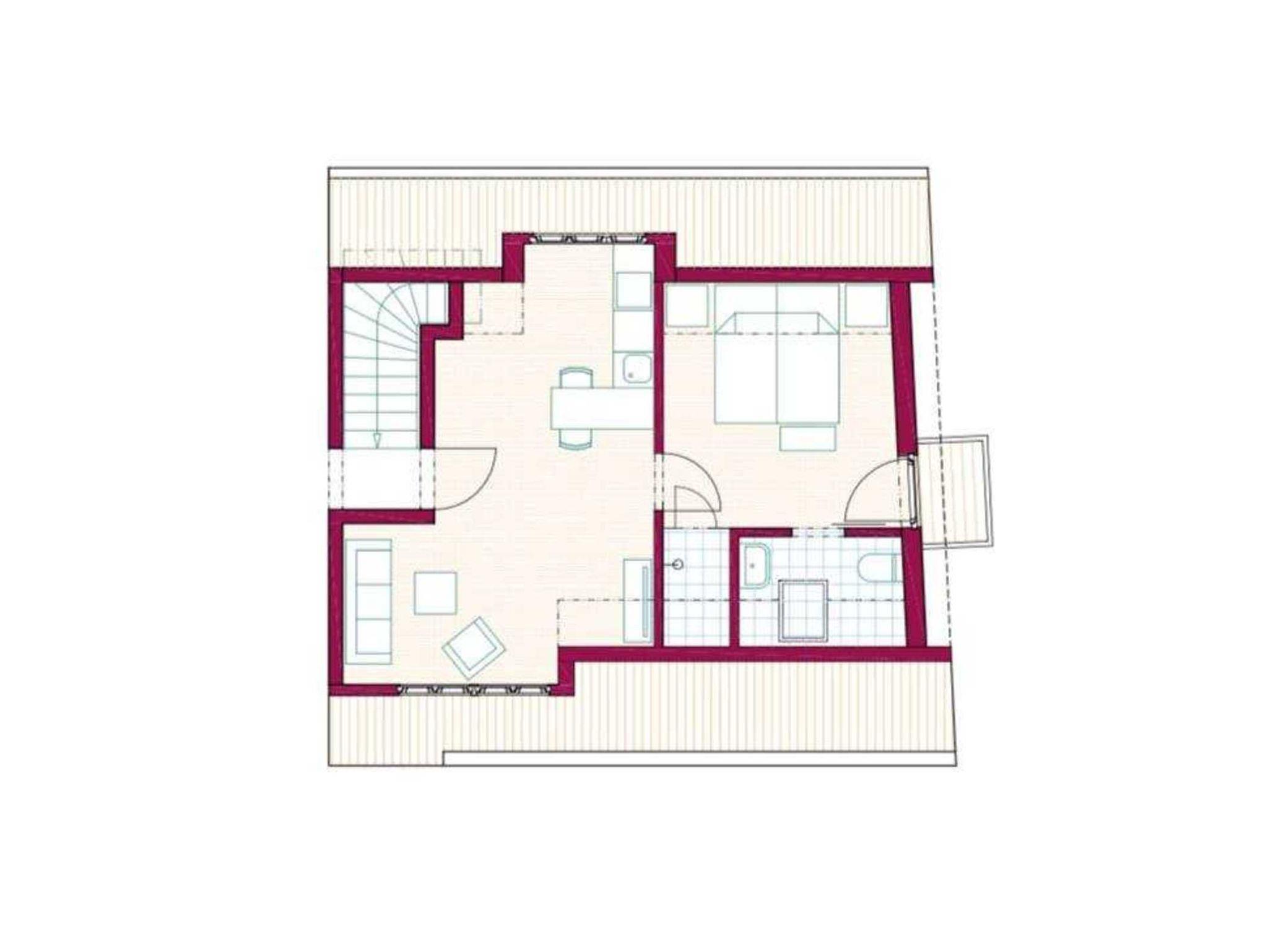 Raumaufteilung: 1 Schlafraum (1 Doppelbett), 1 Wohnraum, 1 Küchenzeile, 1 Badezimmer mit Dusche.