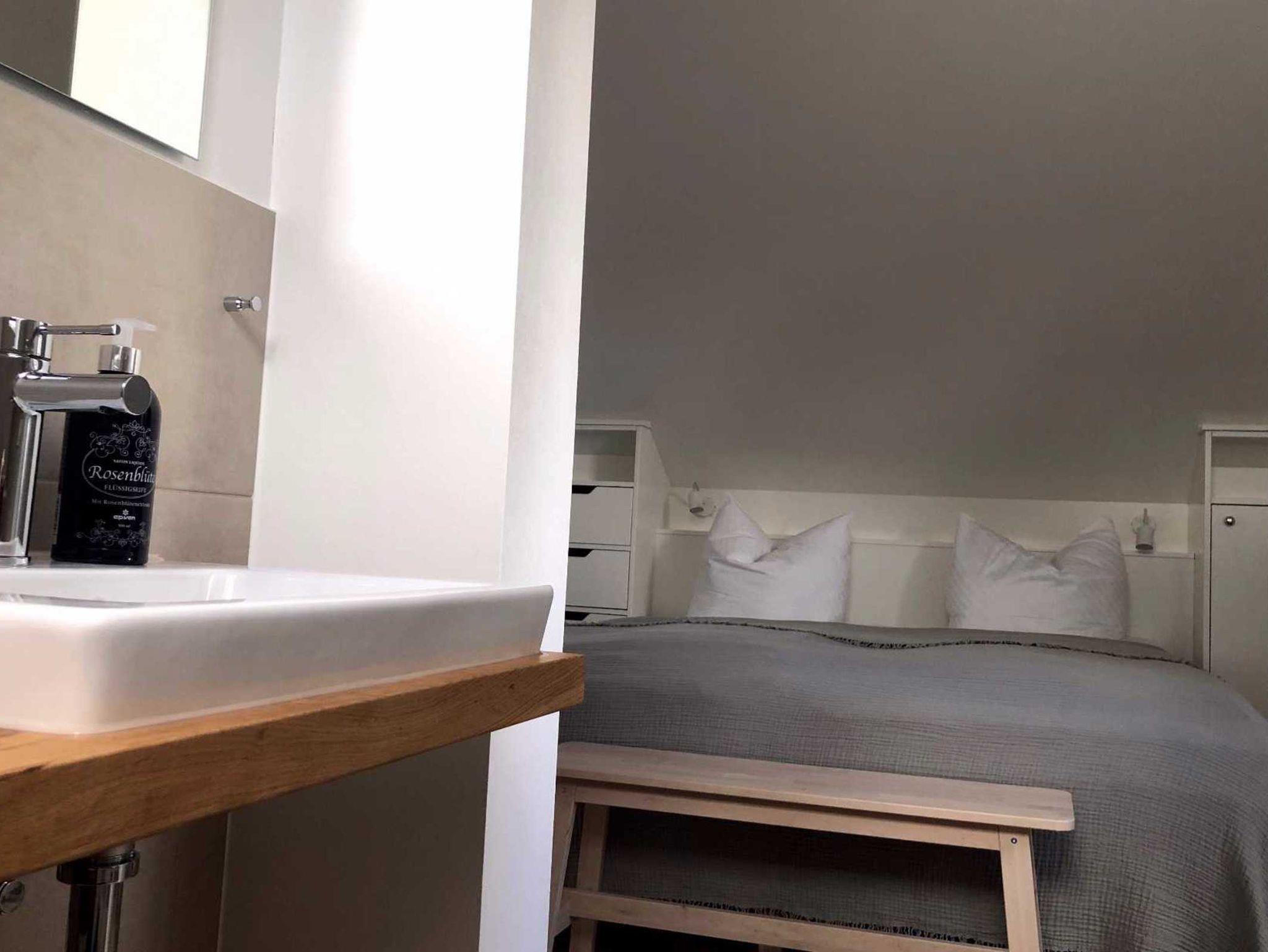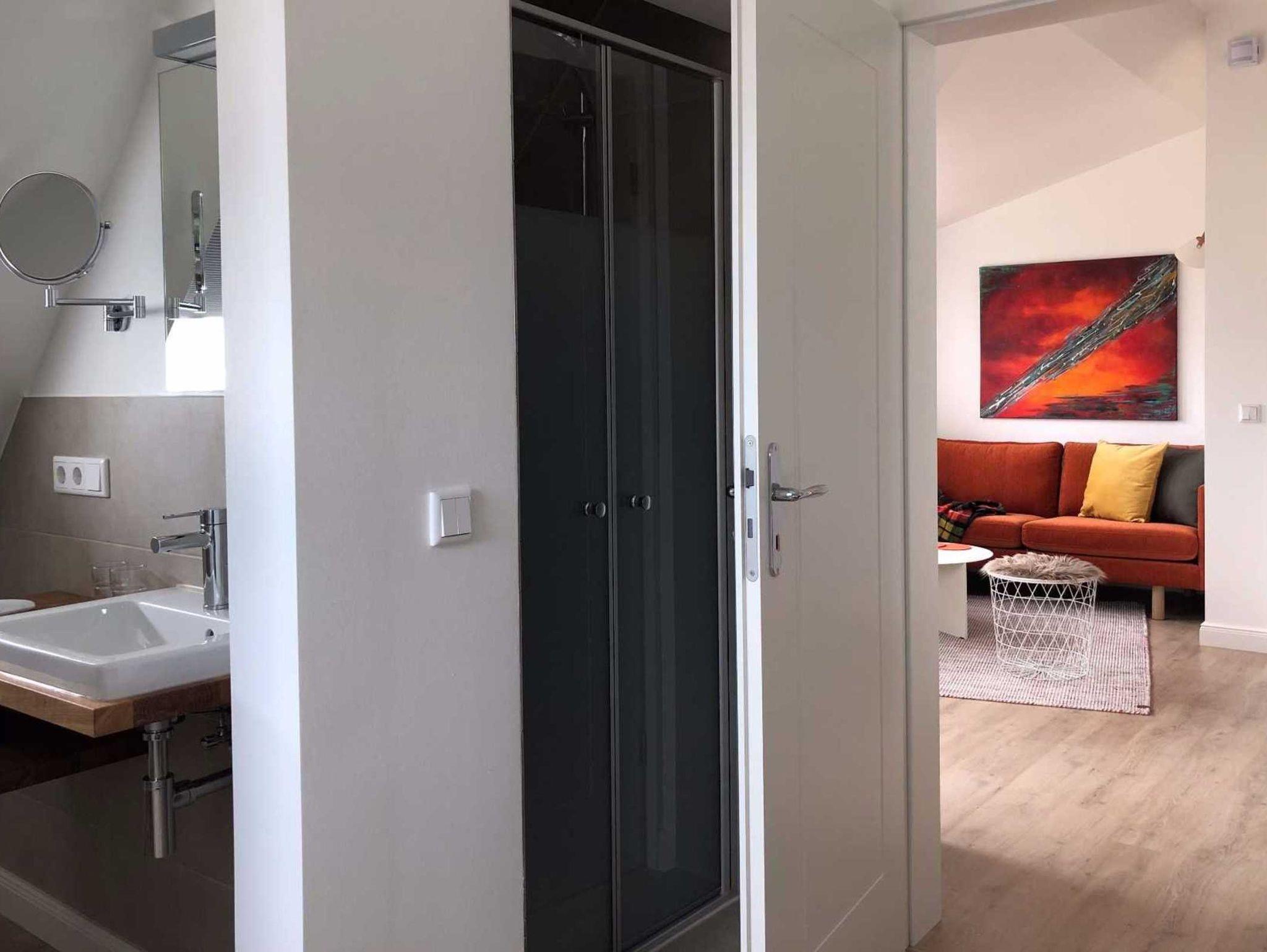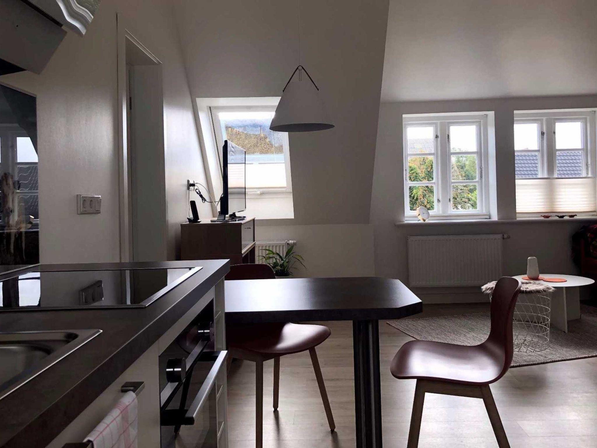 Die Ferienwohnung Windstärke 4 liegt im 1. Stock im Haus Süd auf unserer Anlage. Die Ferienwohnung ist im skandinavischen Stil eingerichtet und besteht aus einem kombinierten Wohn-/ Esszimmer mit Holzkamin, angeschlossener Terrasse, offener Küche sowie einem Schlafraum mit kleinem, angeschlossenen Balkon. Das Badezimmer en Suite mit separater Dusche ist durch eine Glastür vom Schlafbereich getrennt.