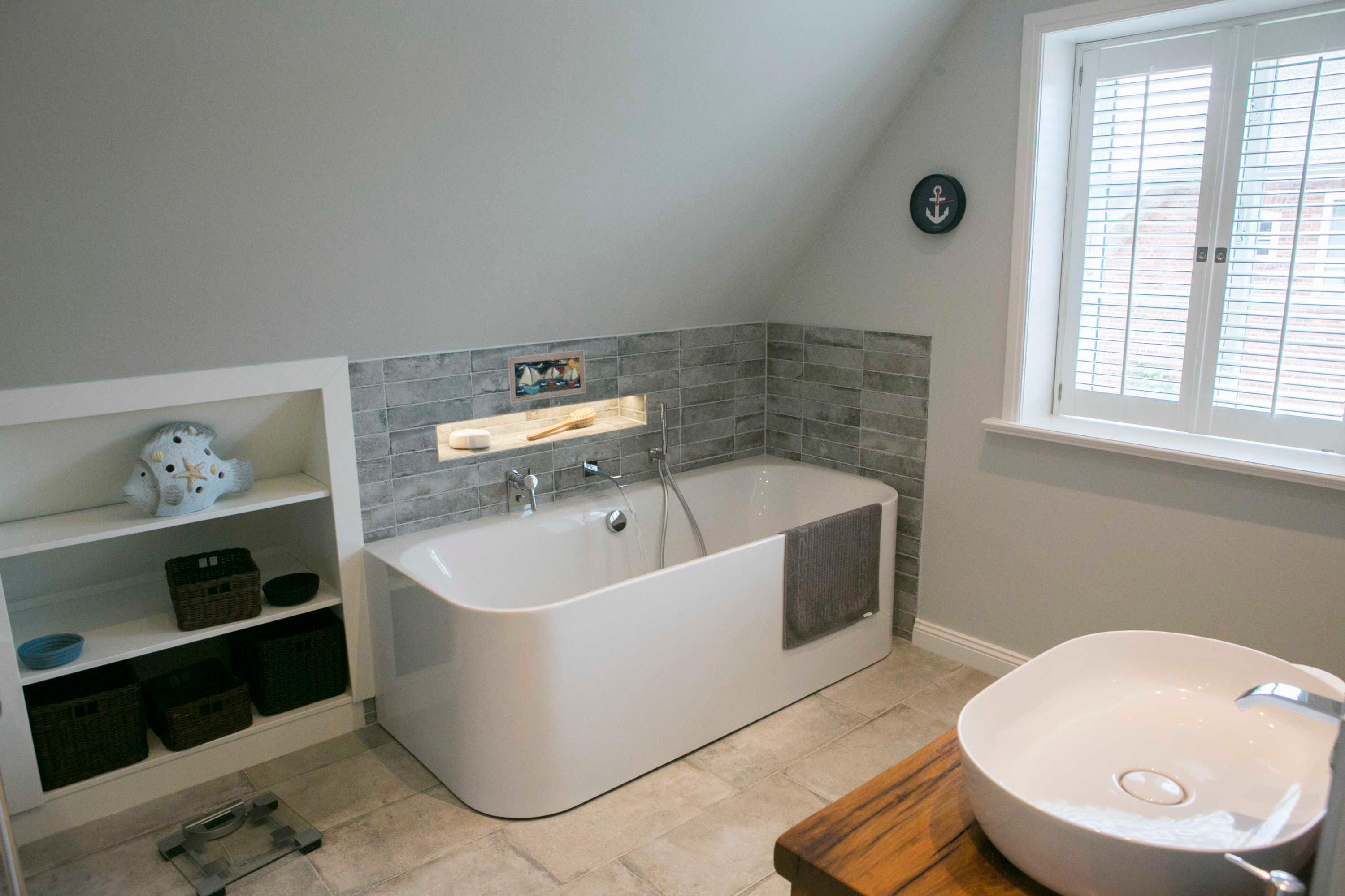 Das gleich neben der Eingangstür befindliche Bad verfügt, wie die beiden anderen Bäder im Obergeschoss, über eine Regendusche.