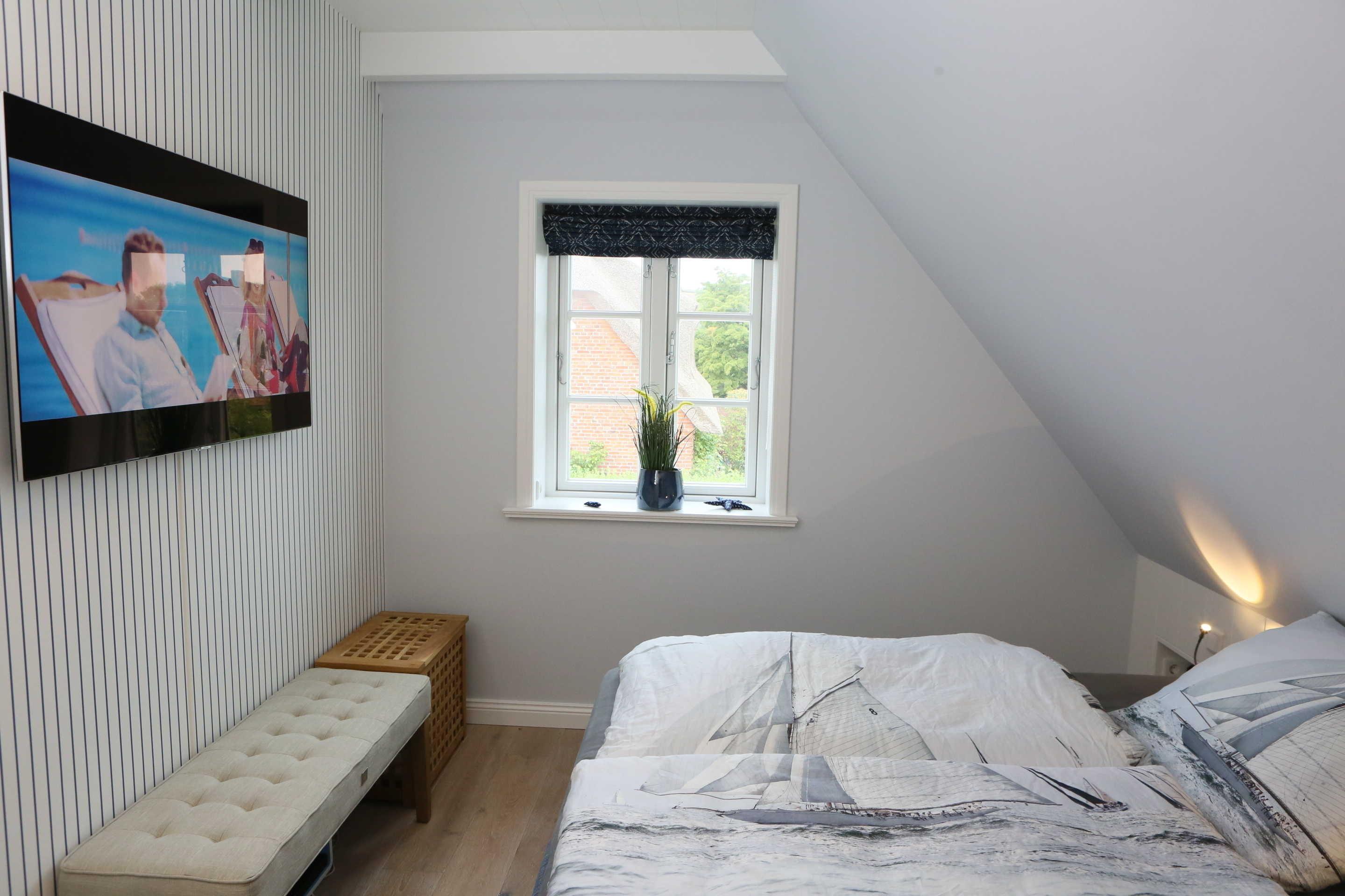 Ein weiterer Schlafraum enthält ebenfalls ein Boxspring-Doppelbett, ein modernes TV und Einbauschränke.