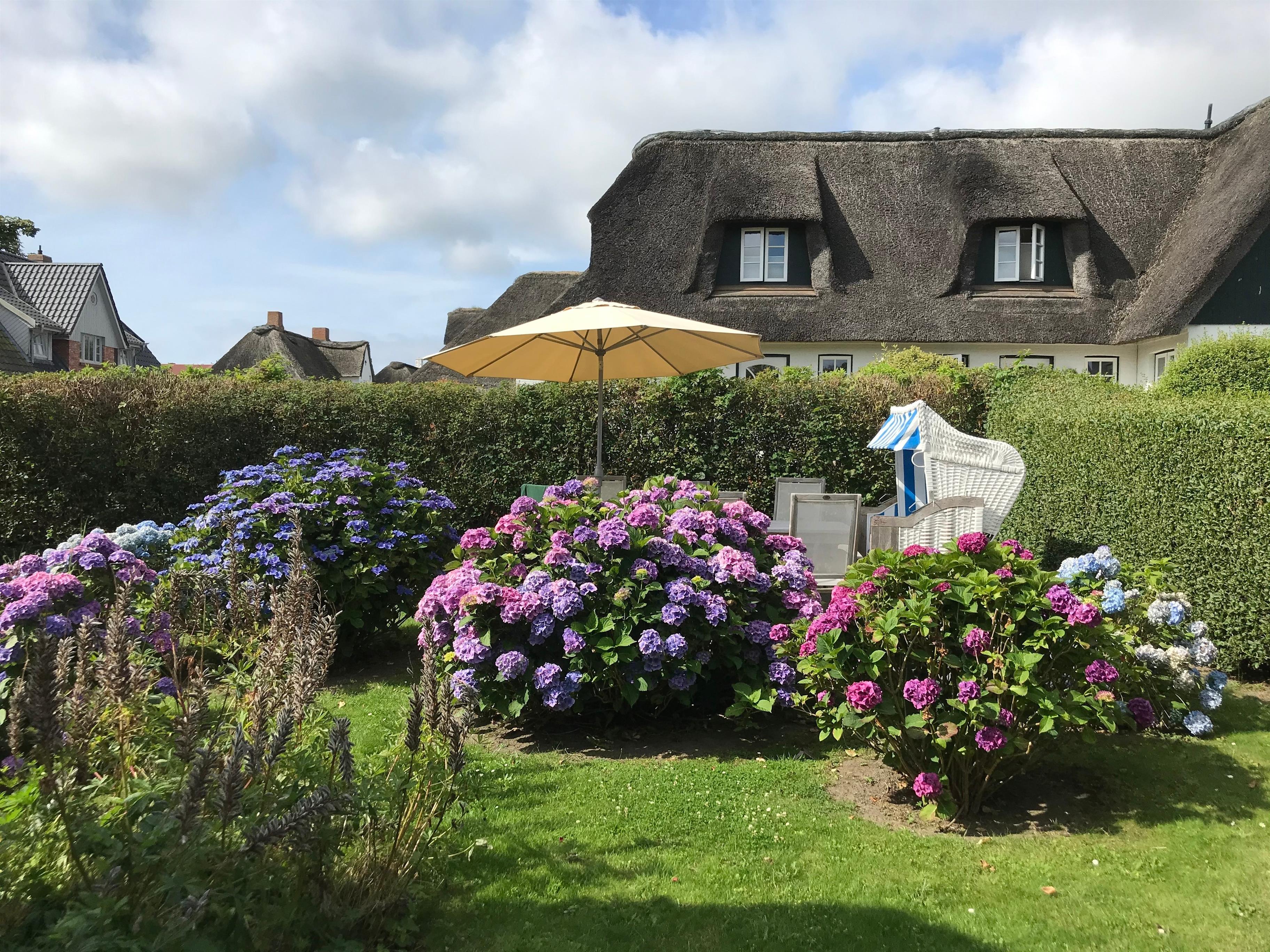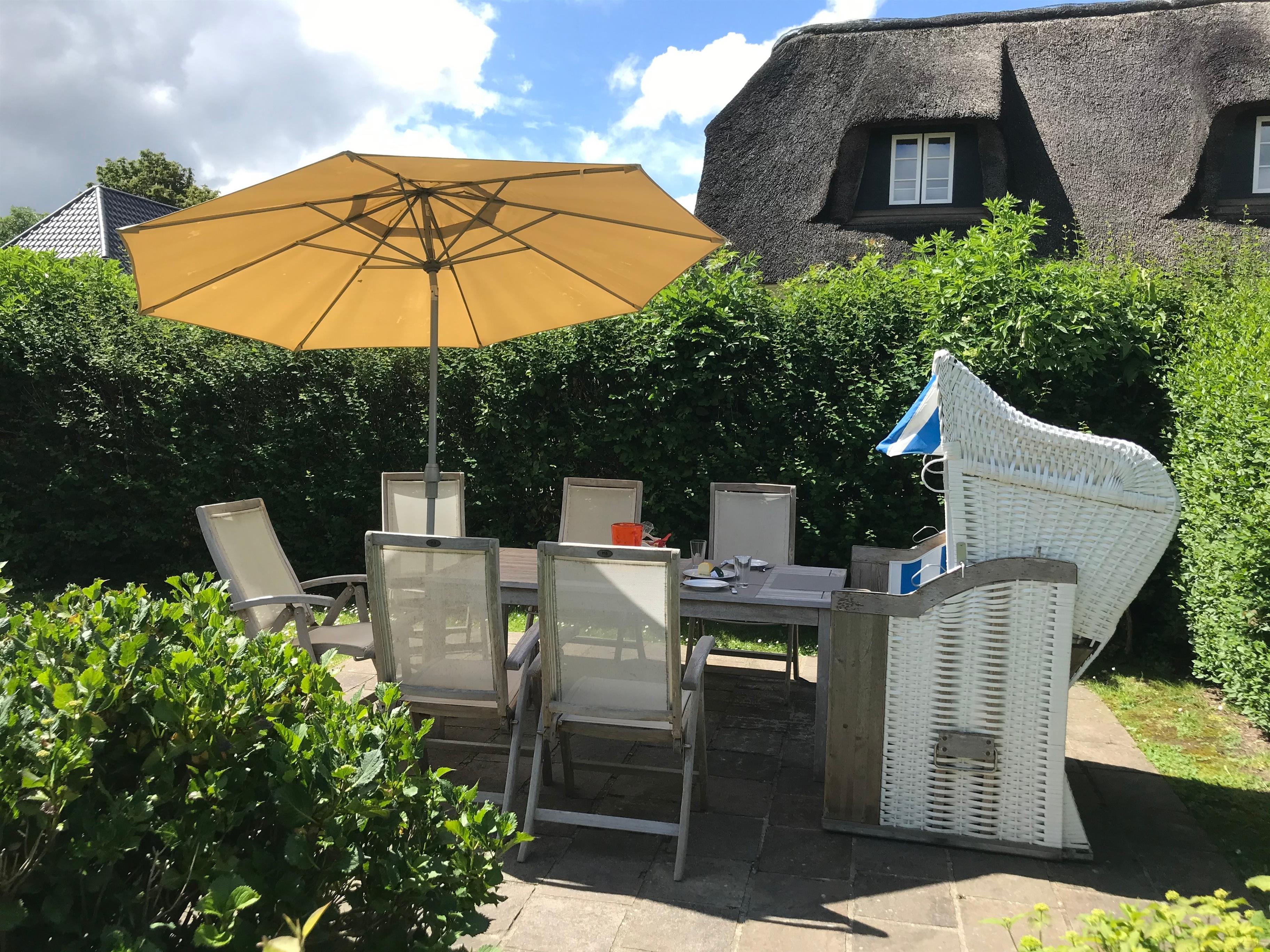 Der Außenbereich umfasst einen großen Garten und eine Terrasse, auf der Ihnen neben Gartenmöbeln auch ein Strandkorb zur Verfügung steht. Dank des hauseigenen PKW-Stellplatzes ist auch eine Anreise mit dem Auto problemlos möglich.
