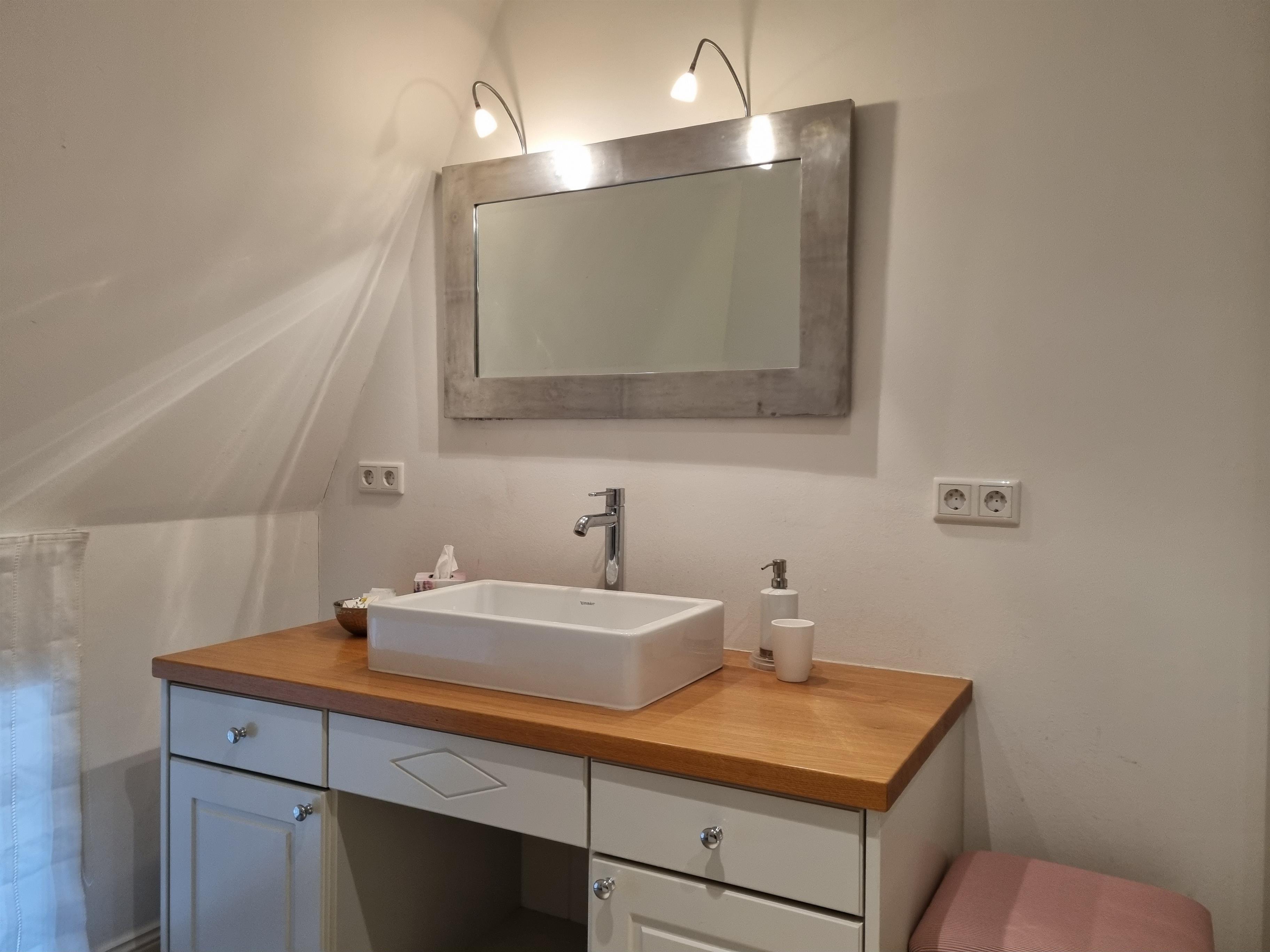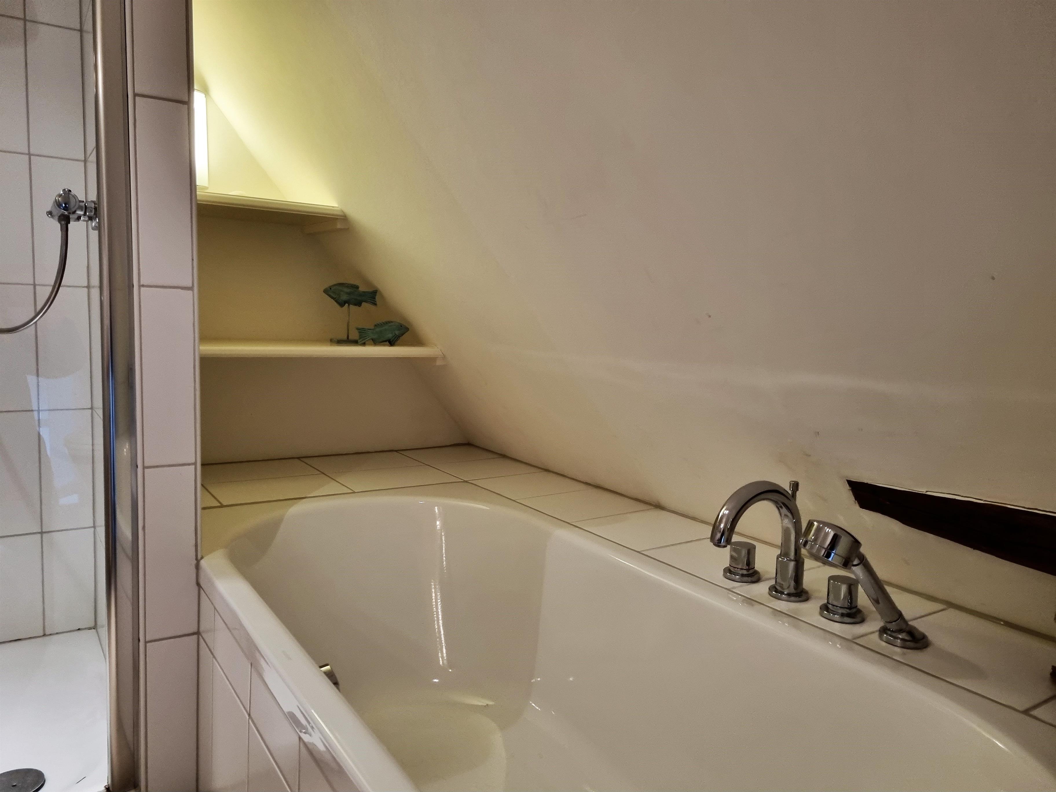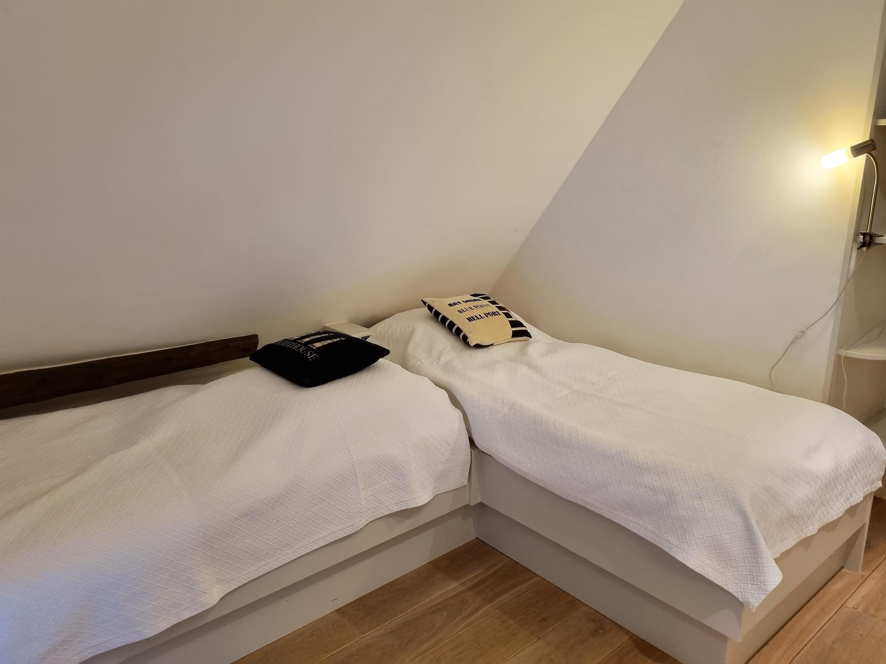 Der Flur im Obergeschoss ist mit einem kleinen Sofa ausgestattet und eignet sich ideal als gemütliche Leseecke. Die drei Schlafzimmer befinden sich ebenfalls im Obergeschoss: Eines verfügt über ein Doppelbett (1,80 x 2,00 m) und einen Einbaukleiderschrank, ein weiteres über zwei Einzelbetten (0,90x2,00 m) und das dritte über ein Alkovenbett (1,55 x 2,00 m) sowie ebenfalls einen Einbaukleiderschrank. Das zweite Badezimmer mit Dusche und Badewanne und Fußbodenheizung komplettiert das Obergeschoss.