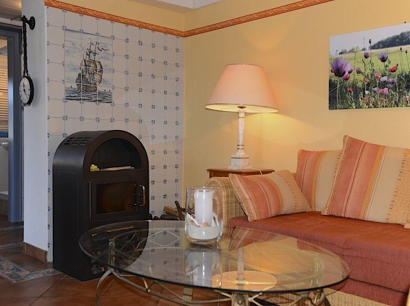 In den kälteren Monaten sorgt der dänische Bollerofen für eine gemütliche Atmosphäre - ausreichend Holz ist selbstverständlich vorhanden.